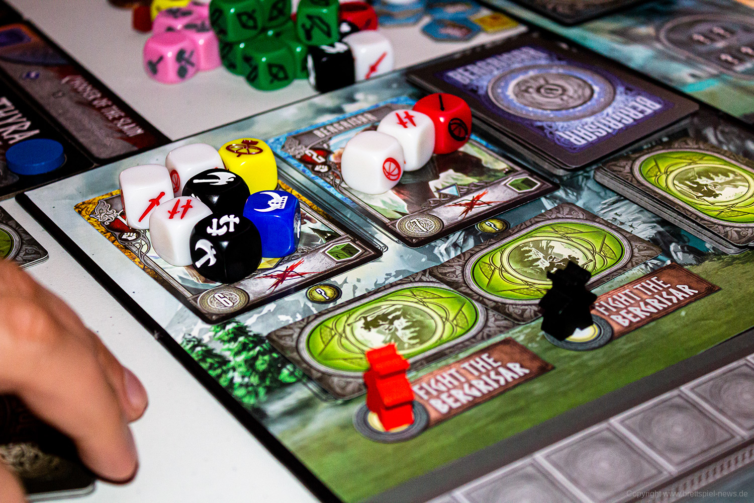 Hier kommen die Düsteren Berge Erweiterung zum Tragen. Sie liefert drei Neue Plätze, an denen wie gewohnt gekämpft werden kann. Das hilft tatsächlich, denn nun kann jede/r kämpfen wer mag. Natürlich muss dabei auf das Timing aufgepasst werden.