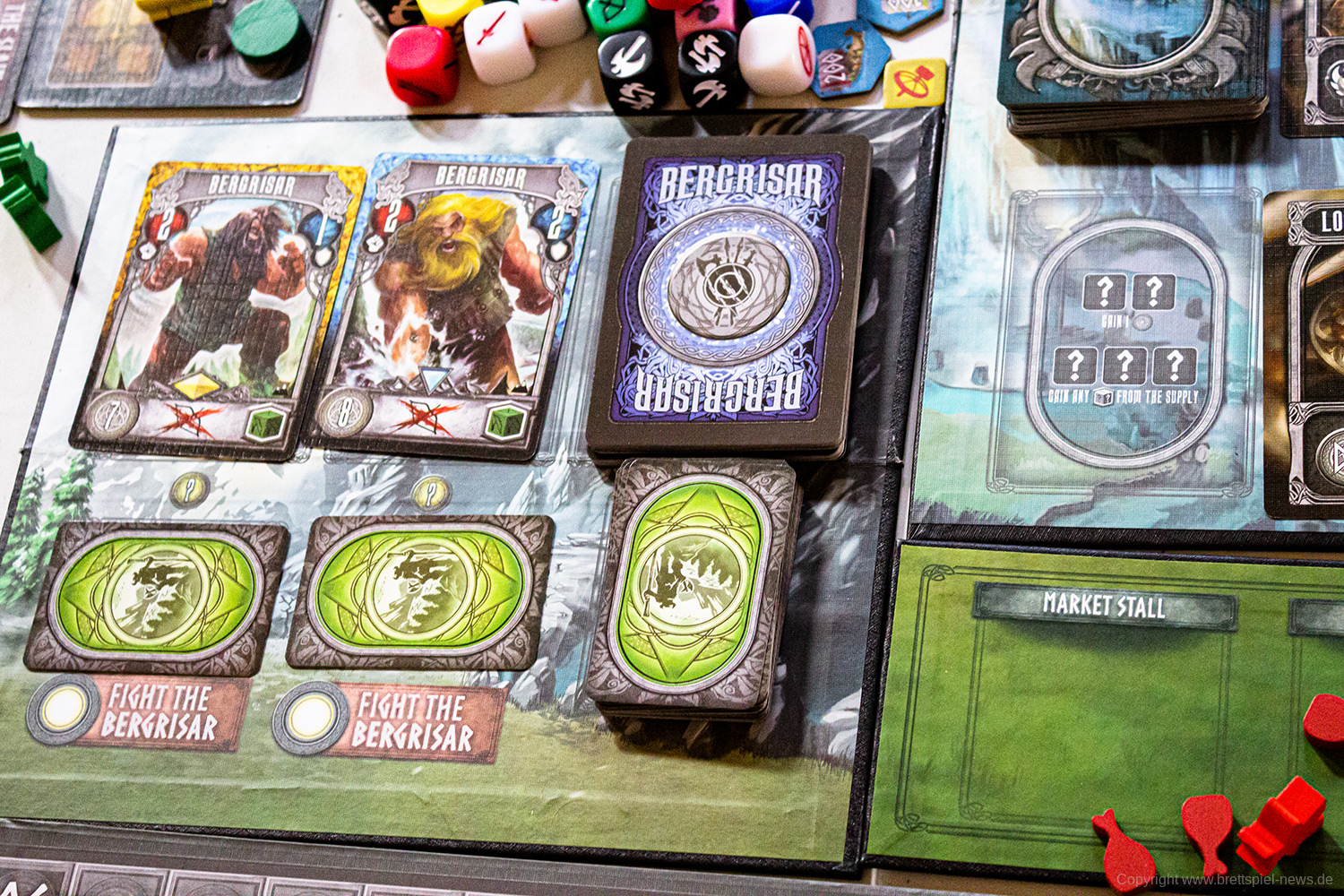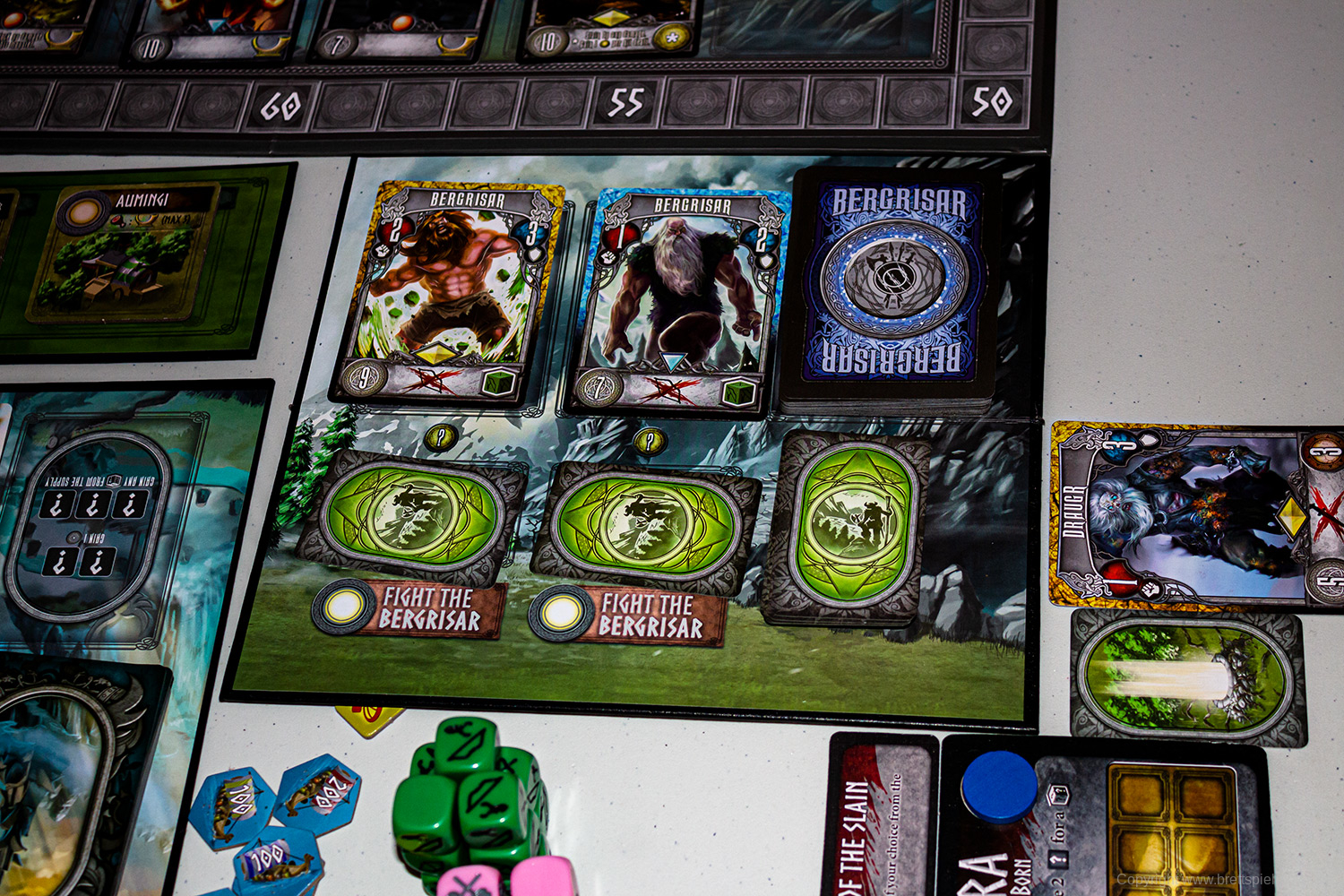 Die Gegner, die es in den Bergen zu schlagen gilt, sind neu ins Spiel gekommen und natürlich sind die Hindernis-Karten auch andere. Statt in einen Sturm auf dem Meer, können die Wikinger zum Beispiel in einen Blizzard geraten.