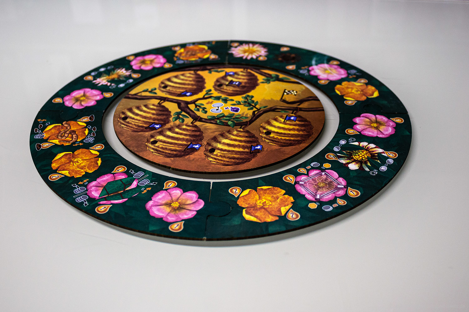Abhängig von der Spielerzahl wird ein Rondell aufgebaut. Dieses beinhaltet Blumen auf die sich die Spieler in der folgenden Partie immer wieder platzieren dürfen um Punkte zu erhalten. In die Mitte wird ein Tableau mit Honigstöcken gelegt. Jeder Spieler, jede Spielerin erhält nun Bienensteine in einer beliebigen Farbe. Es wird noch eine Honigleiste ausgelegt, auf die jeweils die farbigen Punktemarker kommen. Die Spieler nehmen nun sechs normale bienensteine und suchen sich eine von dem Sonderbienensteine aus. Der Richtungsmarker wird in Richtung Uhrzeigersinn aufgelegt. Nun och die das sonstige Spielmaterial auslegen und schon kann das Spiel starten.