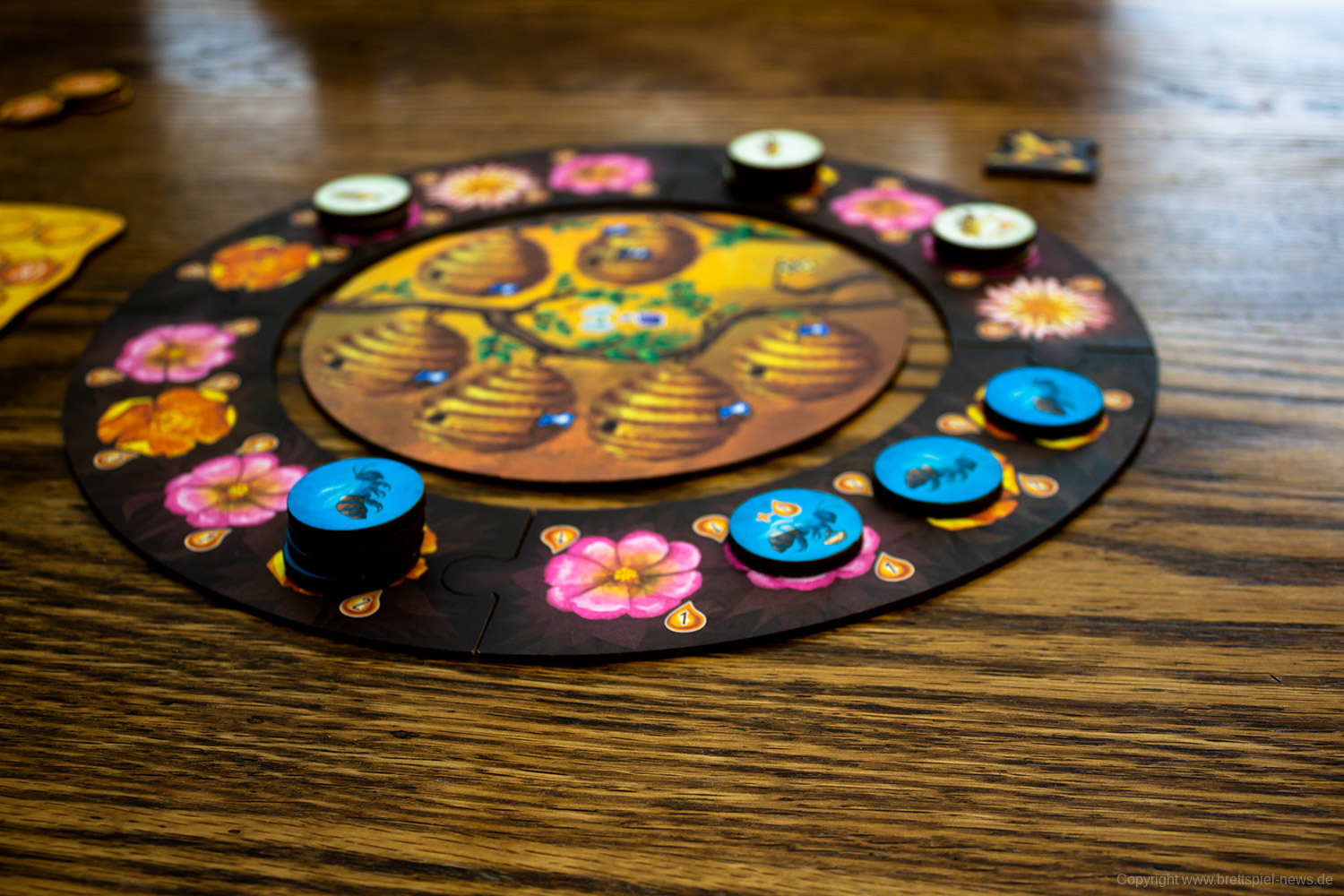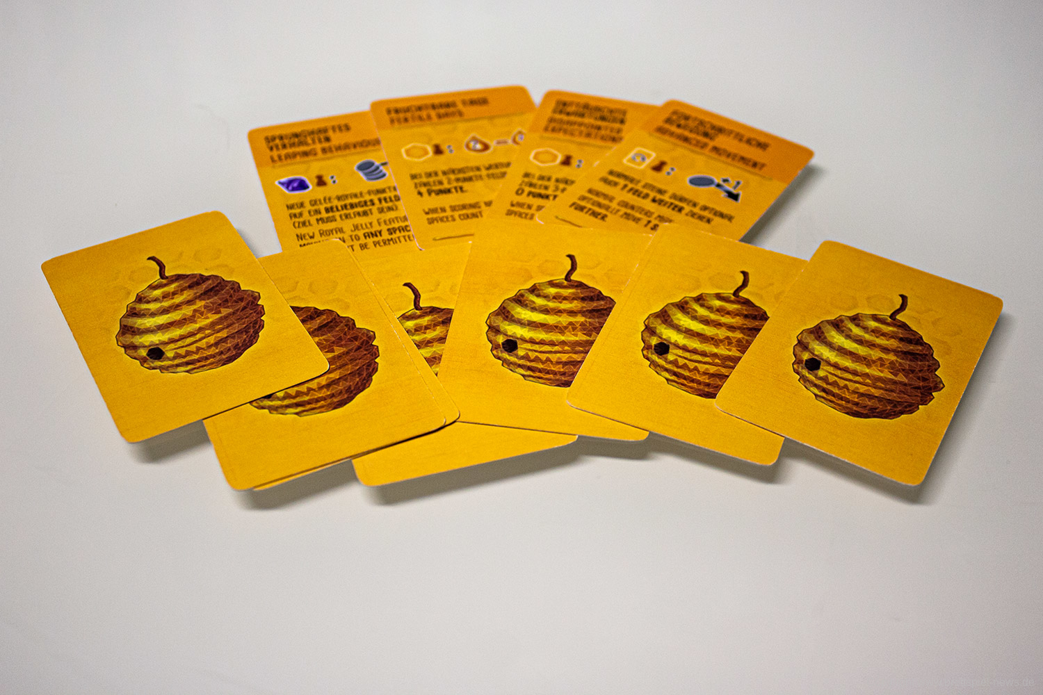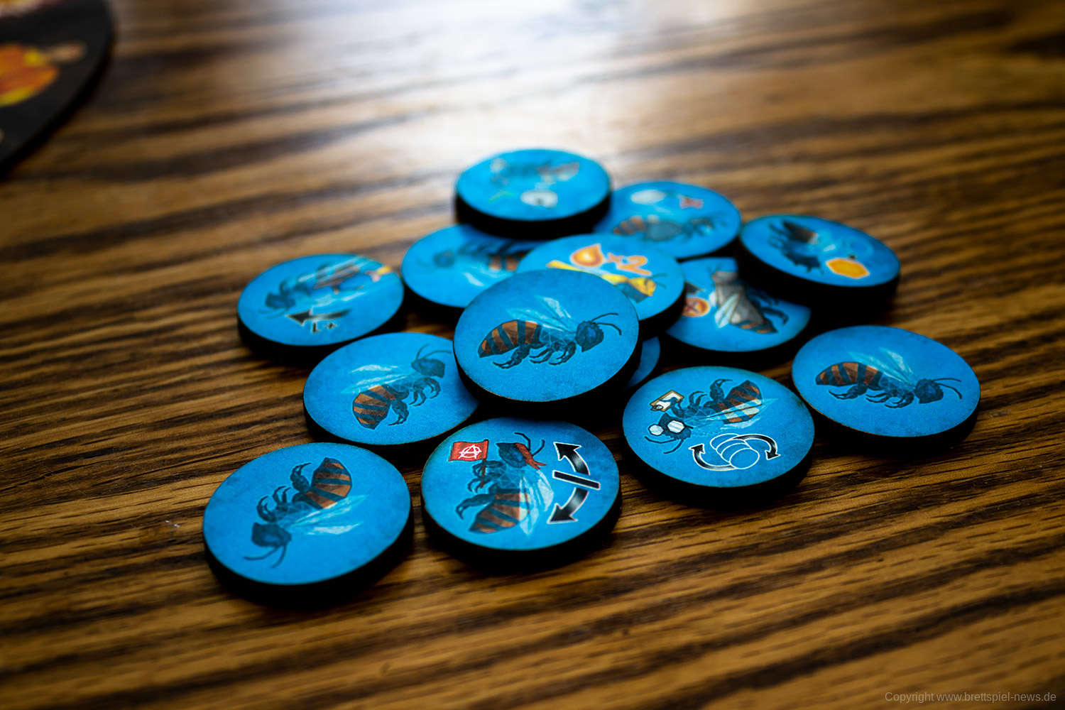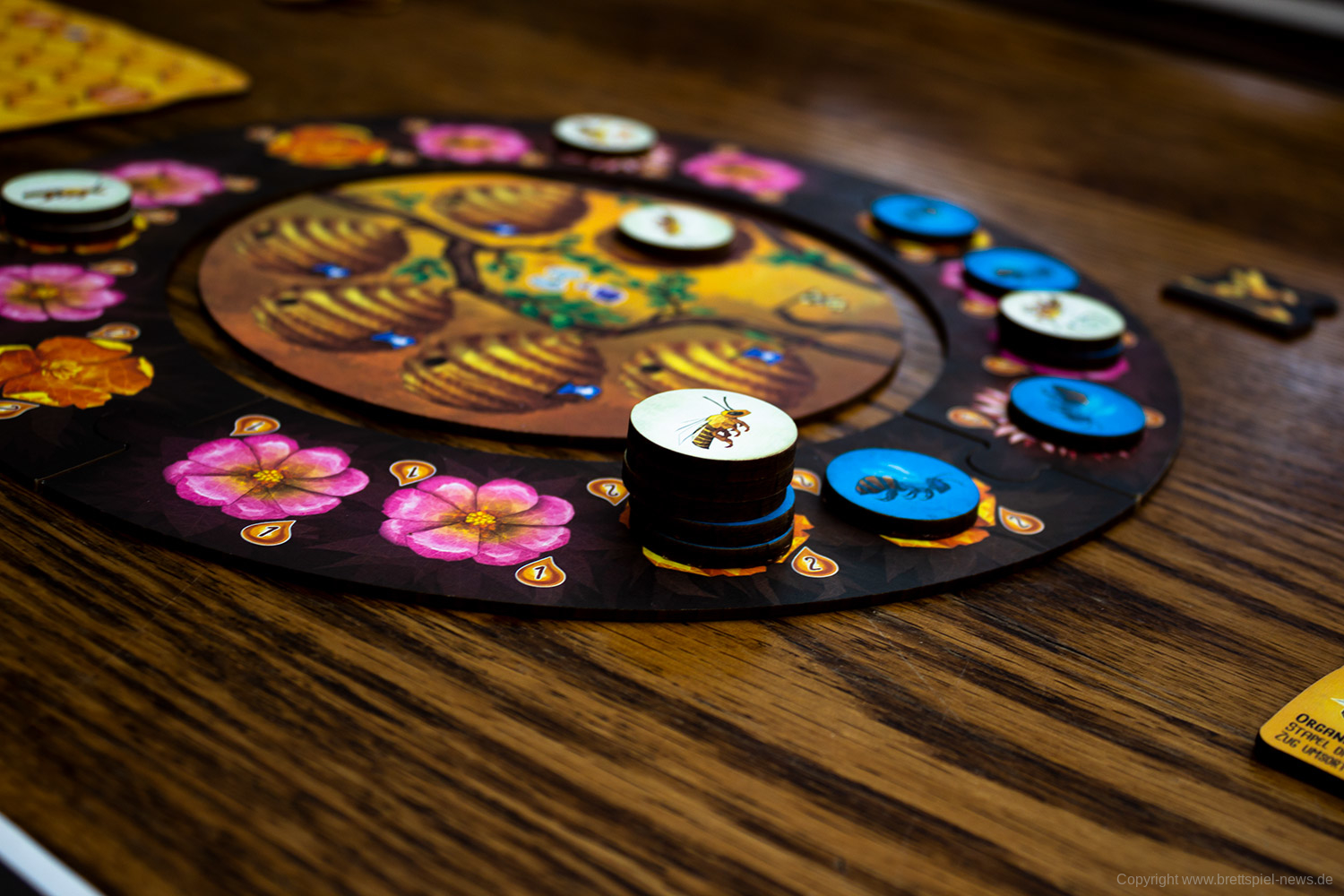 Es gibt in jeder Partie unterschiedliche Möglichkeiten das Spiel zu gestalten. Das liegt unter anderem an den verschiedenen spezialisierten Bienen, von denen jede/r neun Stück hat. Vor allem aber an den vielen kleinen Entscheidungen die zu treffen sind, wie die Bienen bewegt werden. Das ist eine clevere Mechanik und bietet einen schnellen Einstieg, aber viel Erfahrung, um sie zu meistern.