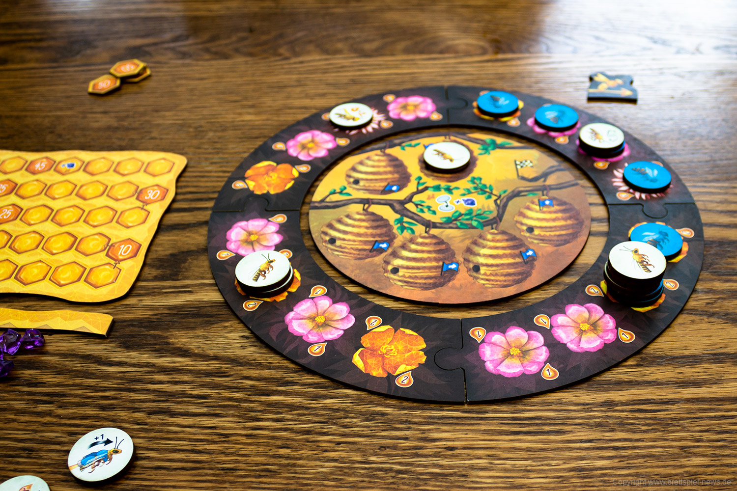 Ist diese eine Aktion durchgeführt wird überprüft ob nun in dem folgenden Zug noch eine Bewegung möglich wäre. Ist dies nicht der Fall gibt es sofort eine Wertung. In der Wertung wird geschaut wie viele Honig Punkte jeweils durch die einzelnen Bienen eingesammelt werden. Dieser Fortschritt wird dann auf einer auf der Honig Leiste nachgehalten. Nachdem diese Wertung durchgeführt wurde, wird nun der auslösende Spieler eine Biene optimieren dürfen. Jede Wertung bringt somit zum einen Siegpunkte und zum anderen ein Upgrade einer Biene.