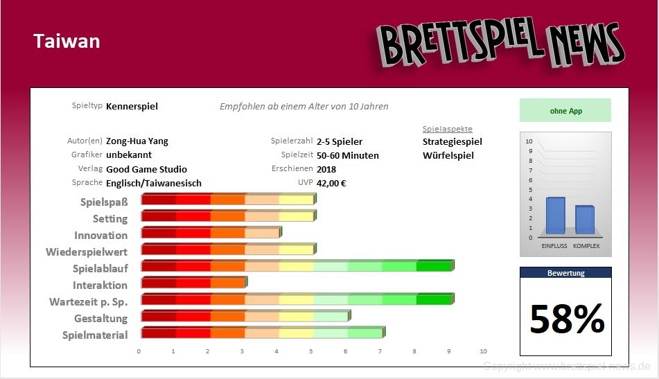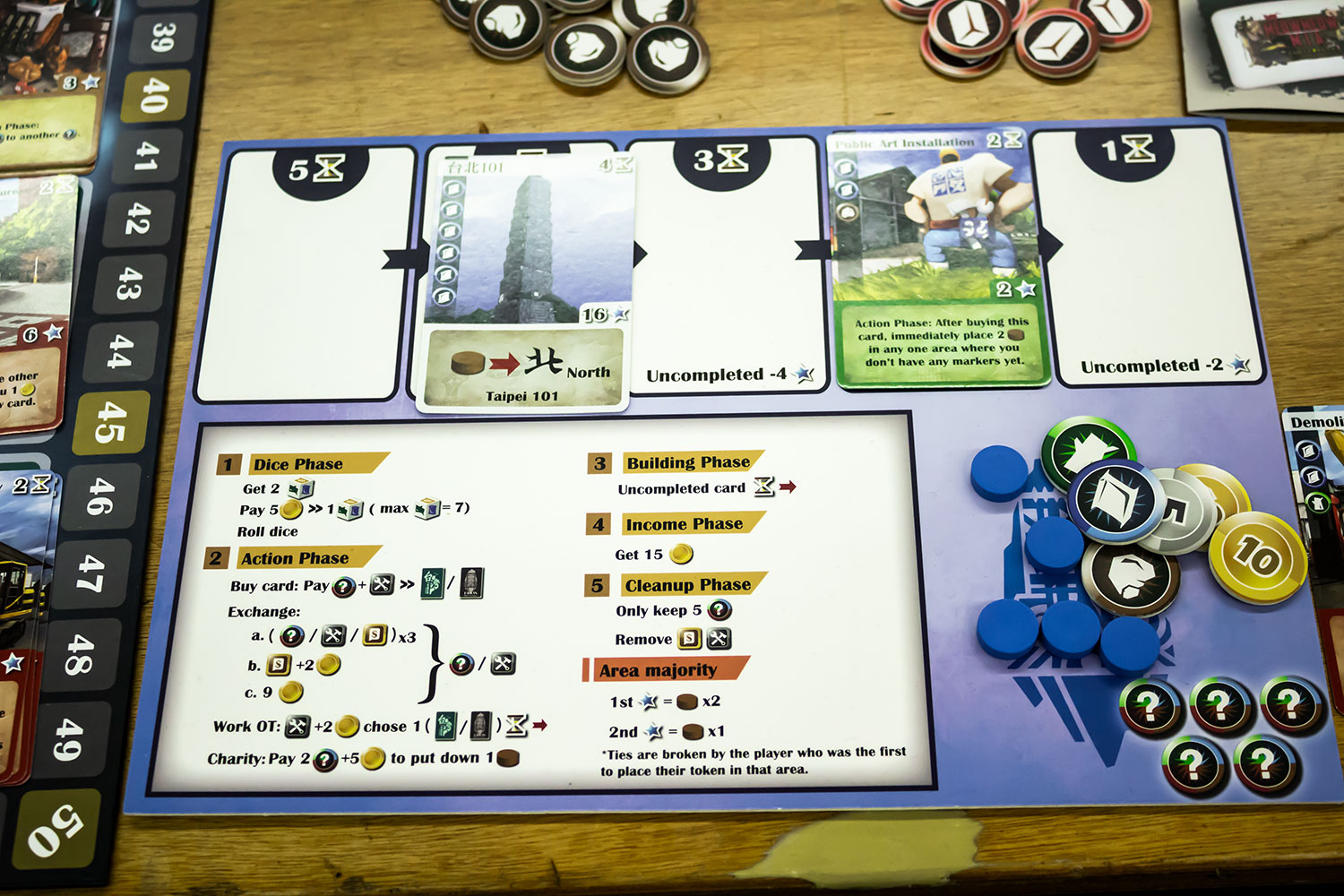 Taiwan ist ein Ressourcenmanagement-Städtebau-Spiel, das Gebietskontrolle und präzises Timing erfordert. Spieler führen Bauunternehmen in Taiwan und verwalten ihre Ressourcen, um die richtige Kombination von Strukturen zur richtigen Zeit und an den richtigen Orten aufzubauen, um die meisten Punkte zu sammeln und das Spiel zu gewinnen!