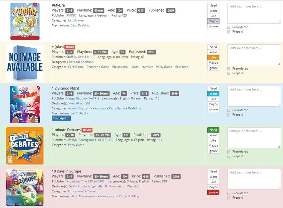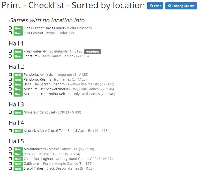 TABLE TOP TOGETHER ist eine englischsprachige Website welche ein TOOL zur Organisation der Spiel´19 anbietet. Hier sind alle Neuheiten welche bekannt sind gelistet. Die Spiele können in fünf verschiedenen Kategorien abgespeichert werden von Need über like zu ignore. Des Weiteren kann eine PDF CHECKLISTE erstellt und ausgedruckt werden, welche den Stand auf der Messe beinhaltet. Die Bilder des jeweiligen Spiels sind mit der boardgamegeek Seite verlinkt wo man sich noch mehr Informationen abholen kann.