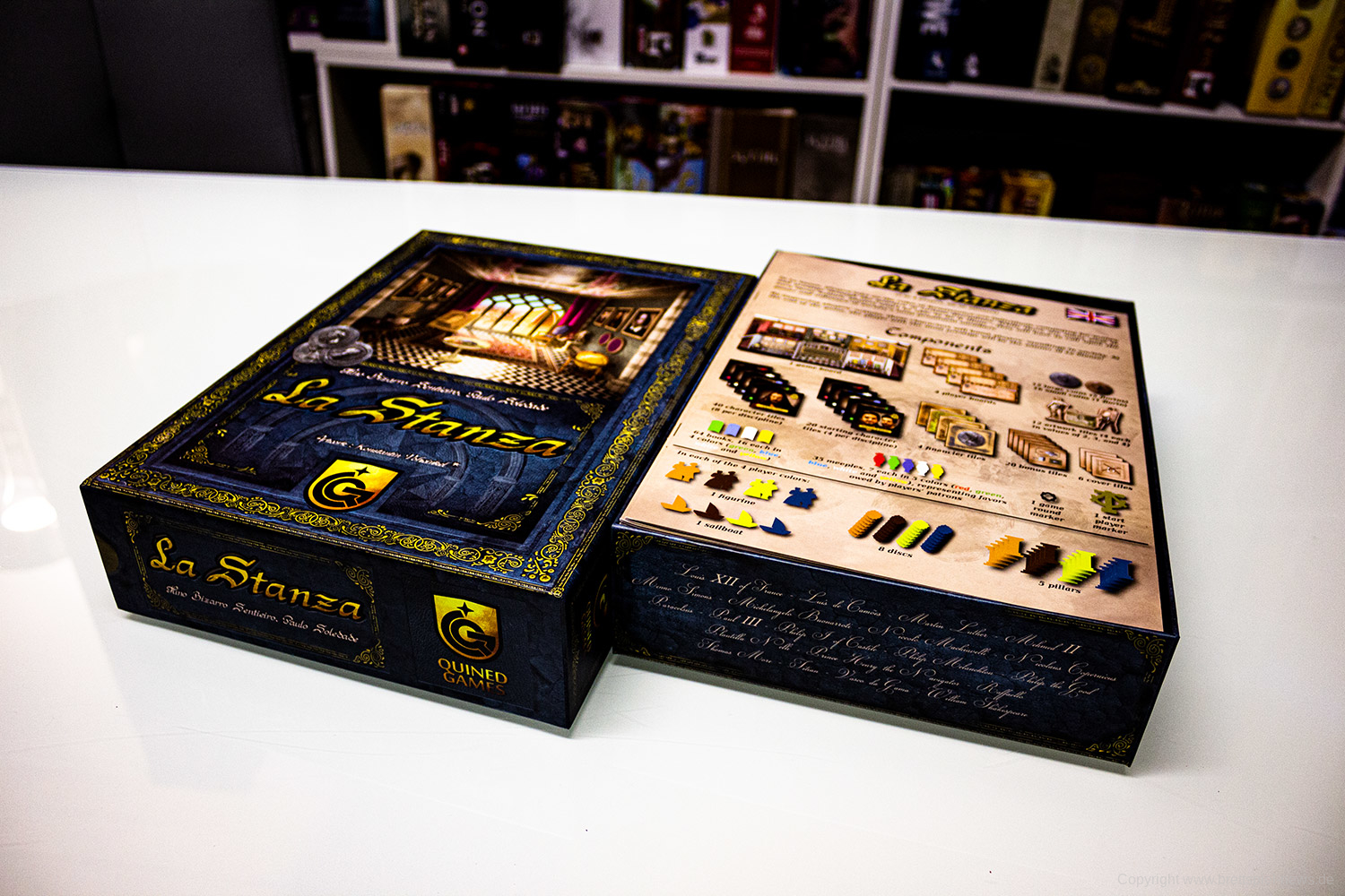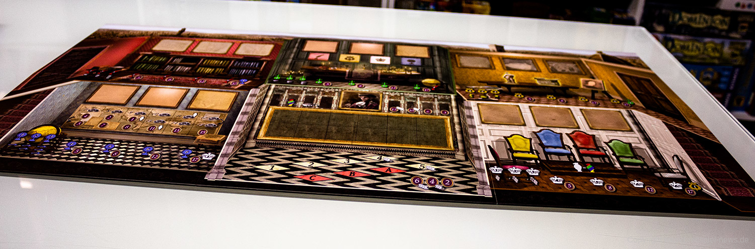 Wer auf der SPIEL’19 das Spiel La Stanza einsacken will, kann es schon online bei Quined Games als Deluxe Version für 70 € vorbestellen. Diese Version enthält nicht nur alle Kickstarter-Ziele, sondern auch noch Metall-Münzen und größere Holzmarker. Wer mag, kann es sich dann liefern lassen (gegen Aufpreis) oder in Essen am Stand entspannt abholen. Dem Spiel liegen deutsche Regeln bei.