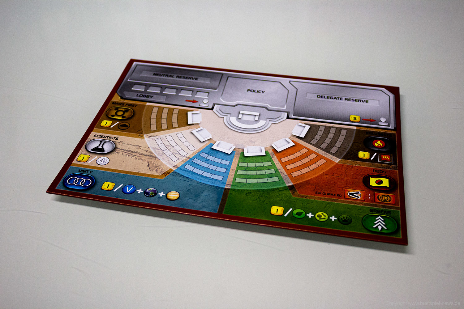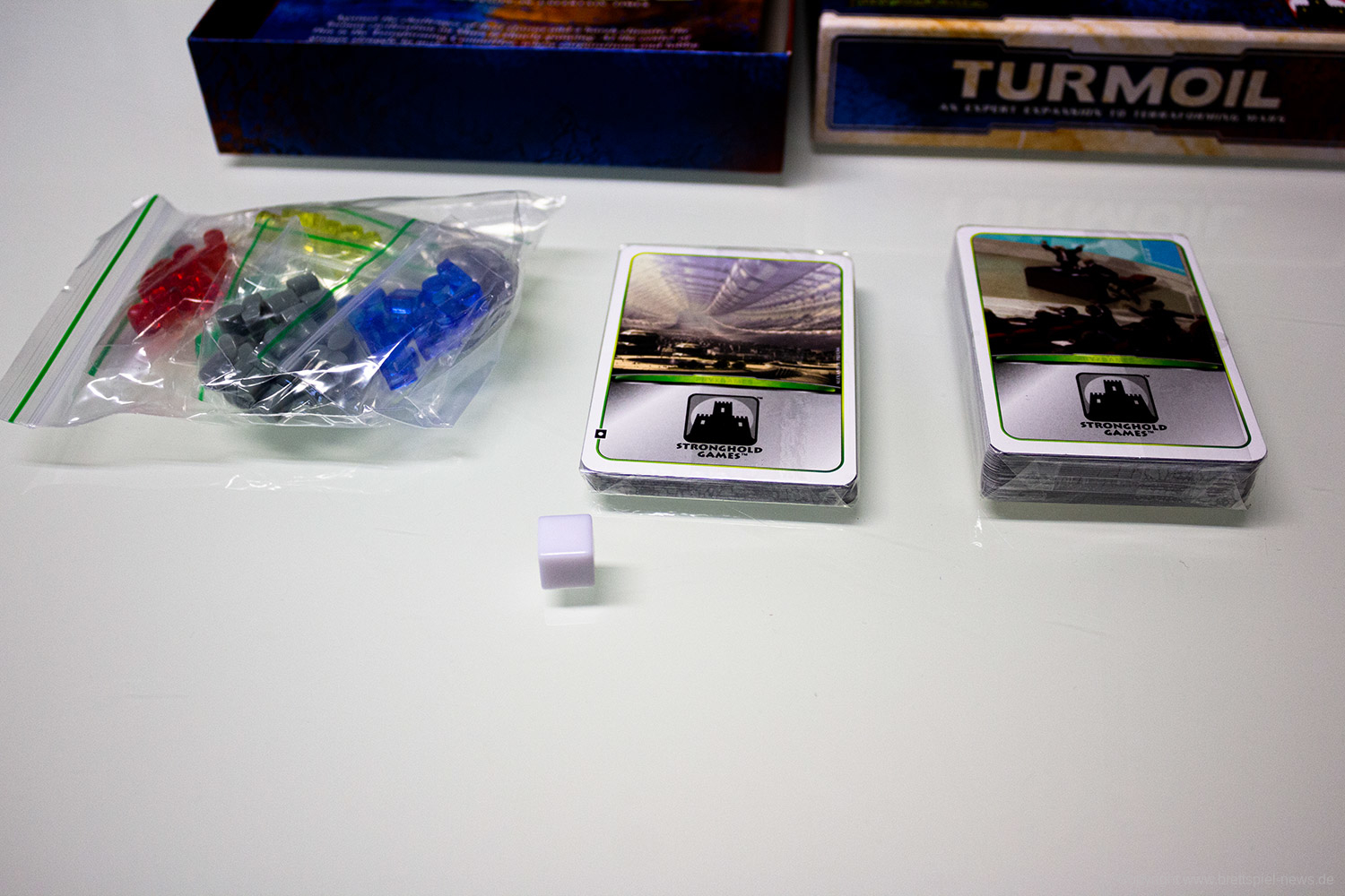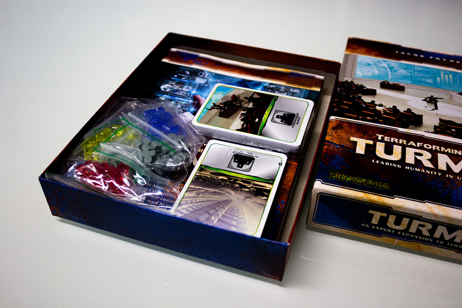FryxGames und Stronghold Games haben die fünfte Erweiterung für Terraforming Mars erfolgreich über Kickstarter finanziert. Diese trägt den Titel Turmoil und kann mit 1-5 Spielern gespielt werden. Wir haben erste Bilder der Kickstarter Version der Erweiterung, die mittlerweile ausgeliefert wird.
