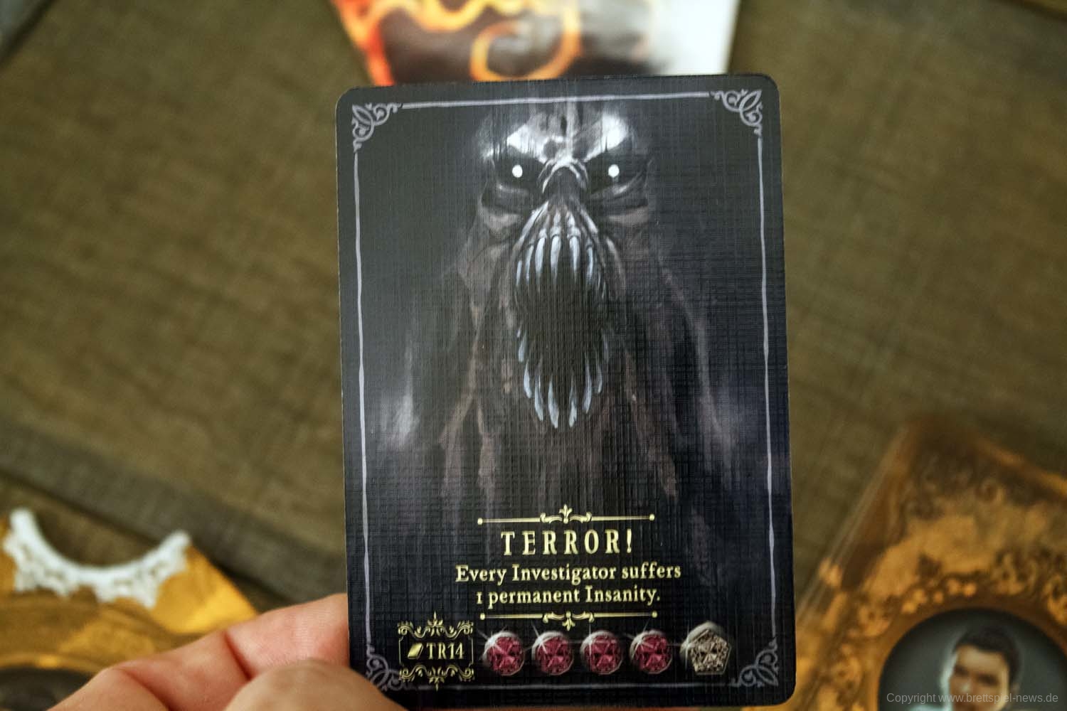 In der nächsten Phase geht der Terror-Marker voran: Er beeinflusst das Auftreten von schrecklichen Ereignissen, die auf die Spieler warten. Der Terror-Marker kann als Effekt von gespielten Aktionen oder als Strafe vorrücken. Es bringt die speziellen Ereigniskarten des Terrorkreises ins Spiel, je nach Stärke. Die Spieler haben die Möglichkeit, diese Ereignisse offen zu legen, zu verschieben oder zu ändern. Die Ermittler würfeln selbst und platzieren sie in der Mitte des Spielfeldes und bilden einen gemeinsamen Pool. Dann werfen sie ihre gebrauchten Karten ab und ziehen neue Aktionskarten von ihren eigenen Decks bis zu ihrem Handlimit.