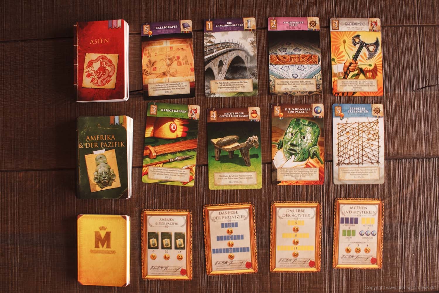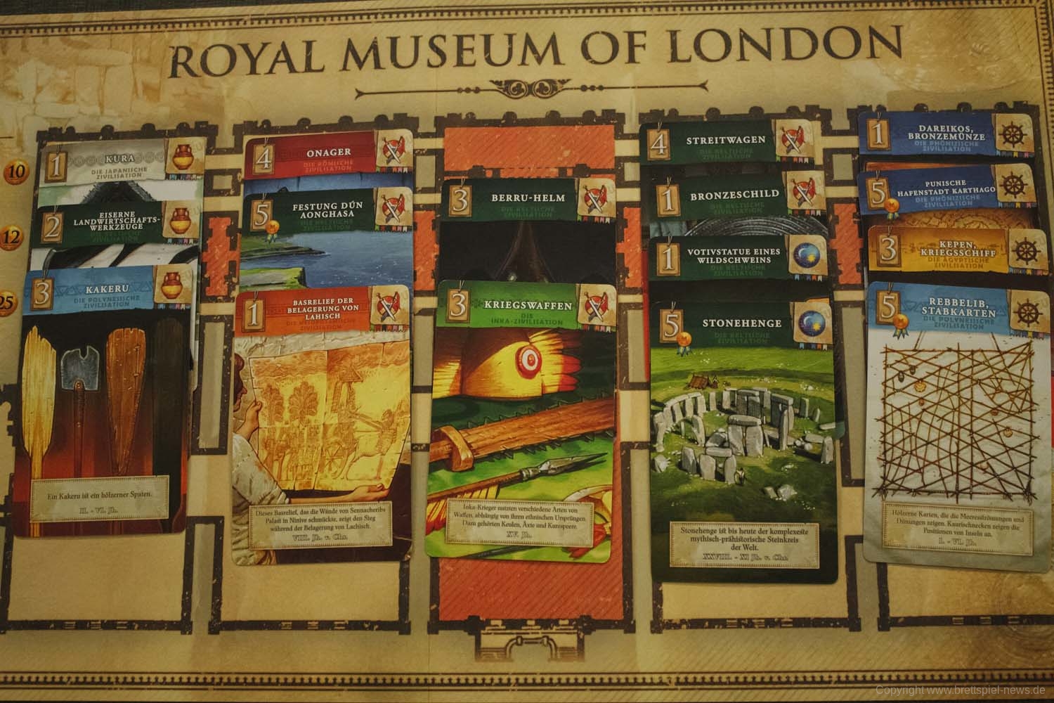 Jede Artefaktkarte hat einen Wert, der die Anzahl der Punkte angibt, die du durch Hinzufügen zu deinen Galerien erhältst. Um noch mehr Punkte zu sammeln, können Sie Sammlungen erstellen, indem Sie Karten nebeneinander auf Ihrem Spielerboard platzieren, ähnlich wie in einem echten Museum. Sammlungen können auf einer der zwölf verschiedenen Zivilisationen im Spiel oder auf den 6 verschiedenen archäologischen Gebieten basieren, also kombinieren Sie Ihre Karten kreativ, um die höchste Punktzahl zu erzielen!