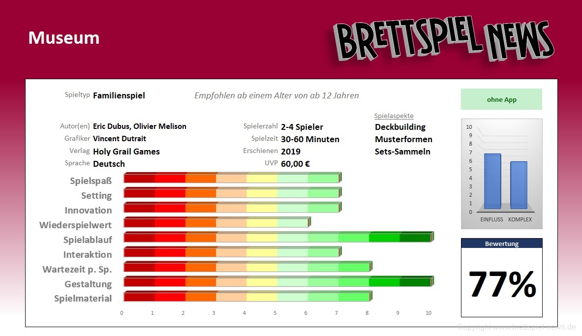 Willkommen bei Museum! Das von Olivier Melison und Eric Dubus entworfene und von Vincent Dutrait illustrierte Museum ist ein Sammelspiel, bei dem Sie als Kurator Ruhm und Reichtum erlangen wollen, indem Sie die beeindruckendsten und umfangreichsten Ausstellungen für Ihre Galerien zusammenstellen.