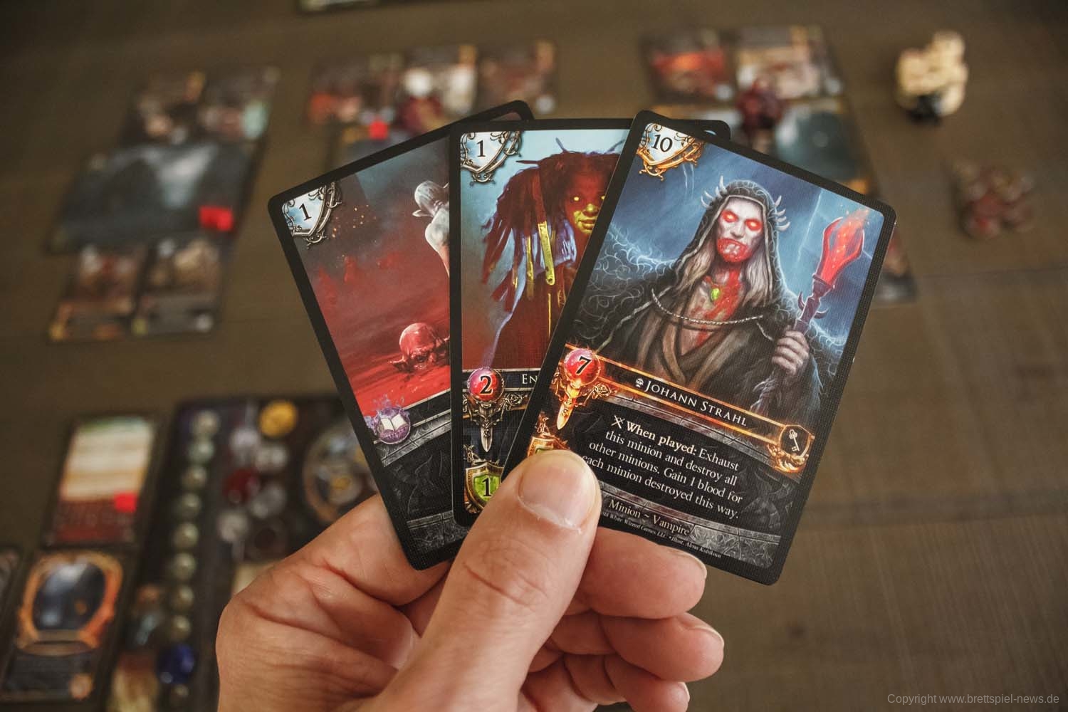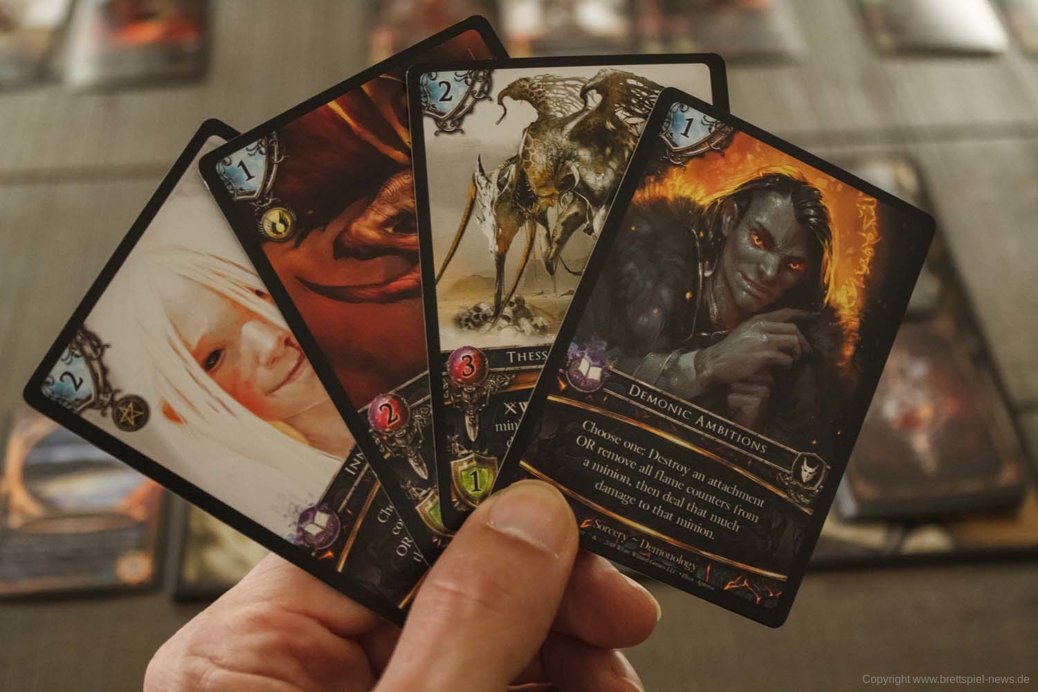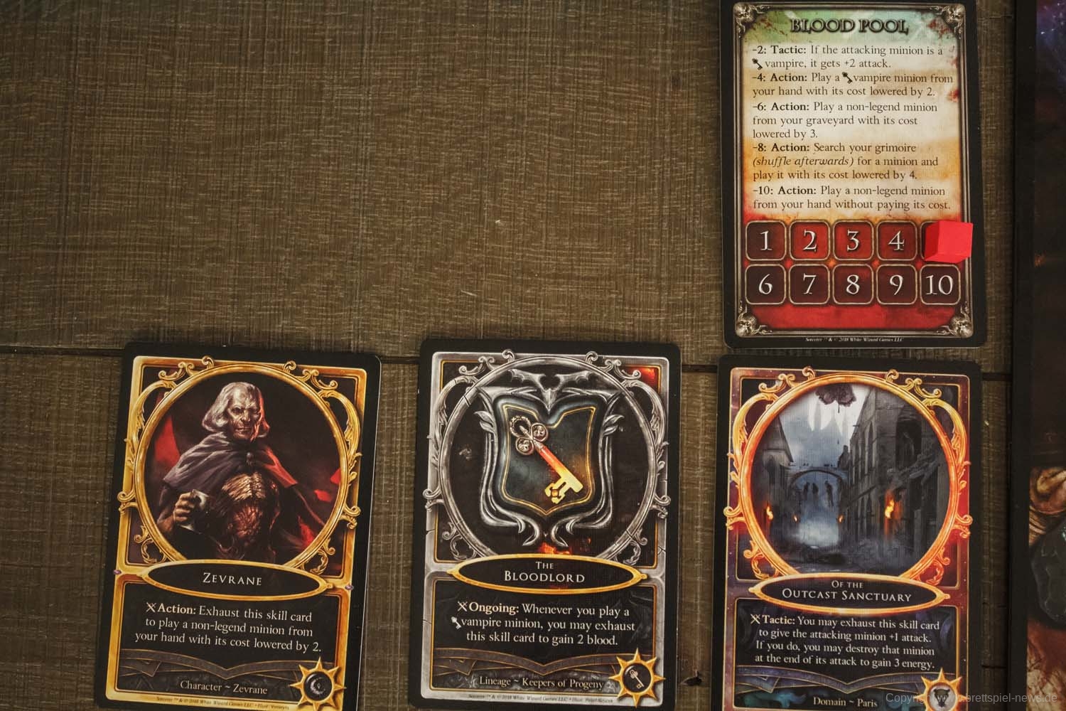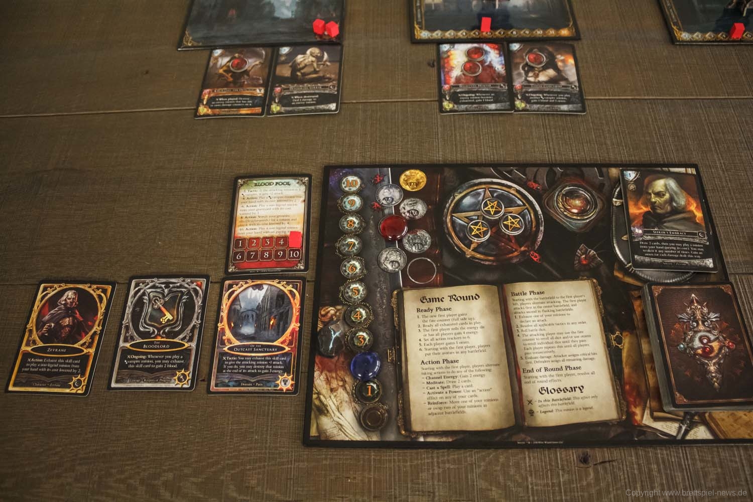 Jedes Deck wird auch mit einer Skillkarte geliefert. Zusammen zeigen sie deinen wahren Namen. Zum Beispiel könntest du Ariaspes sein, der Dämonologe des Ausgestoßenen Heiligtums. In jeder Runde des Spiels geben die Spieler Aktionspunkte aus, um Zauber zu spielen, Karten zu ziehen, Energie zu gewinnen oder Vasallen zu spielen.