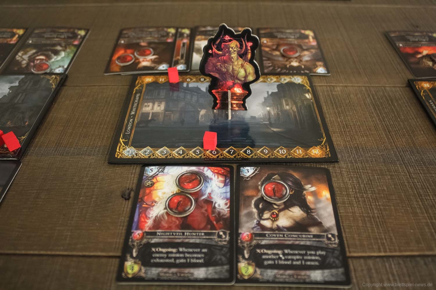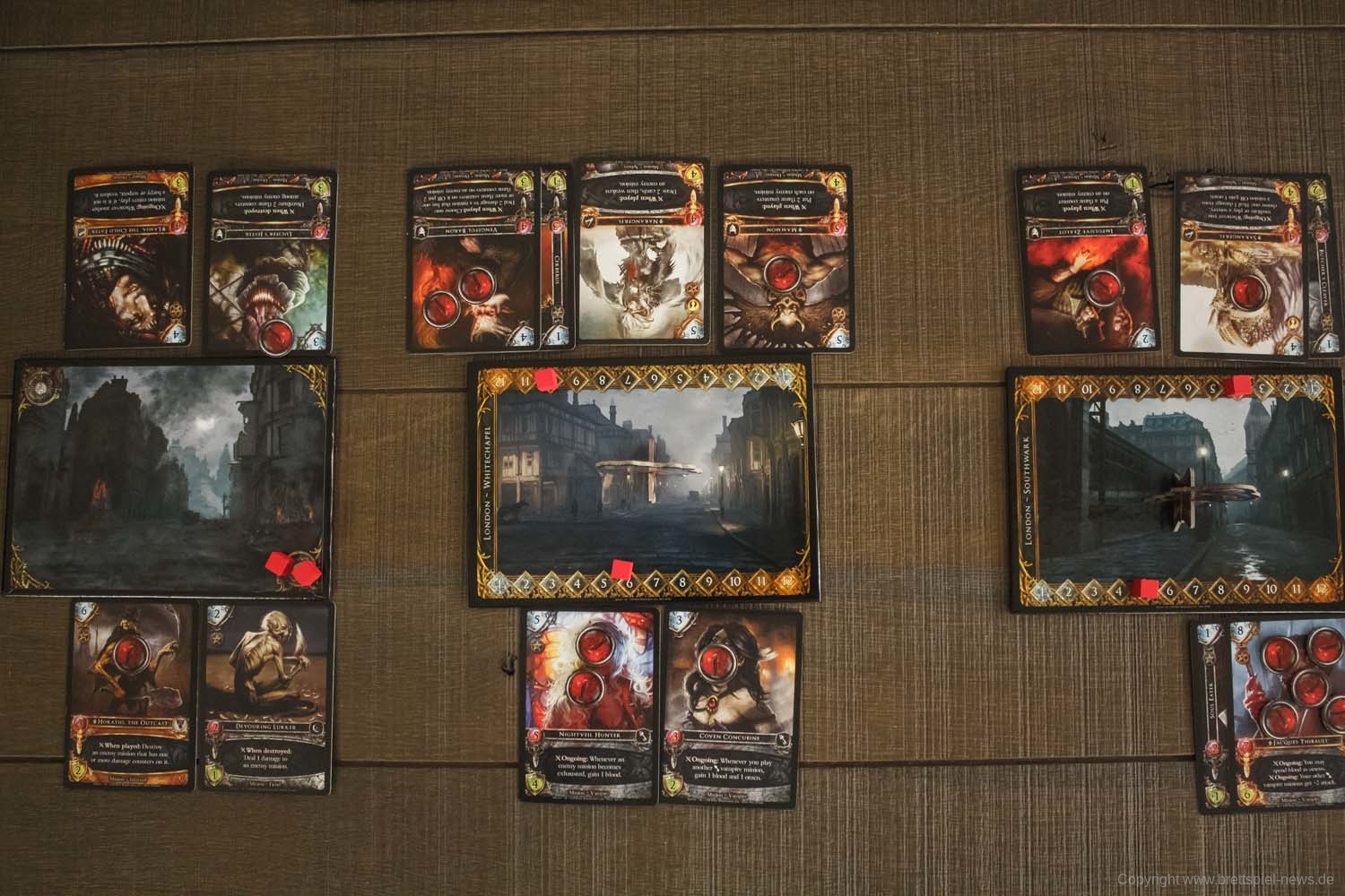 Es gibt drei verschiedene Schlachtfelder im Spiel, die verschiedene Abschnitte des viktorianischen London repräsentieren. Wenn du einen Diener spielst, musst du dich entscheiden, auf welches Schlachtfeld du ihn setzen willst. Er darf nur auf diesem Schlachtfeld angreifen und seine Fähigkeiten einsetzen. Wenn du später entscheidest, dass du es woanders brauchst, kannst du eine Aktion durchführen, um es auf ein benachbartes Schlachtfeld zu verschieben.
