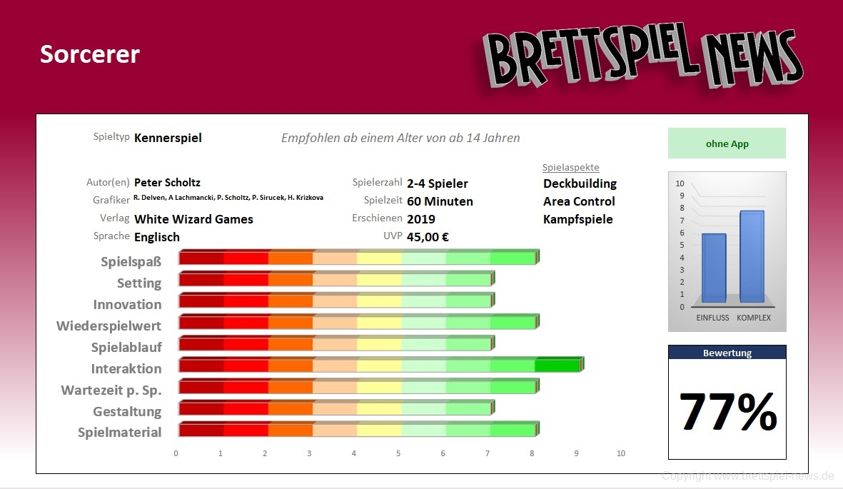 In SORCERER von WHITE WIZARD GAMES nehmt ihr die Rolle eines Zauberers ein, der im Duell mit 1-3 weiteren Zauberern steht. Bei dem Zwist geht es darum herauszufinden, welche Linie die mächtigste von allen ist. Um das Herauszufinden beschwört ihr unter anderem Vasallen und nutzt magische Gegenstände mit dem Ziel, 2 von 3 Schlachtfeldern für euch zu gewinnen. Das Spiel war zum ersten Mal 2014 als Print'n'Play verfügbar und wurde bis zu seinem Kickstarter im November 2017 einem intensiven Feintuning unterzogen. Nun ist es auch als Retailversion verfügbar.