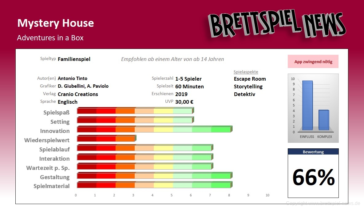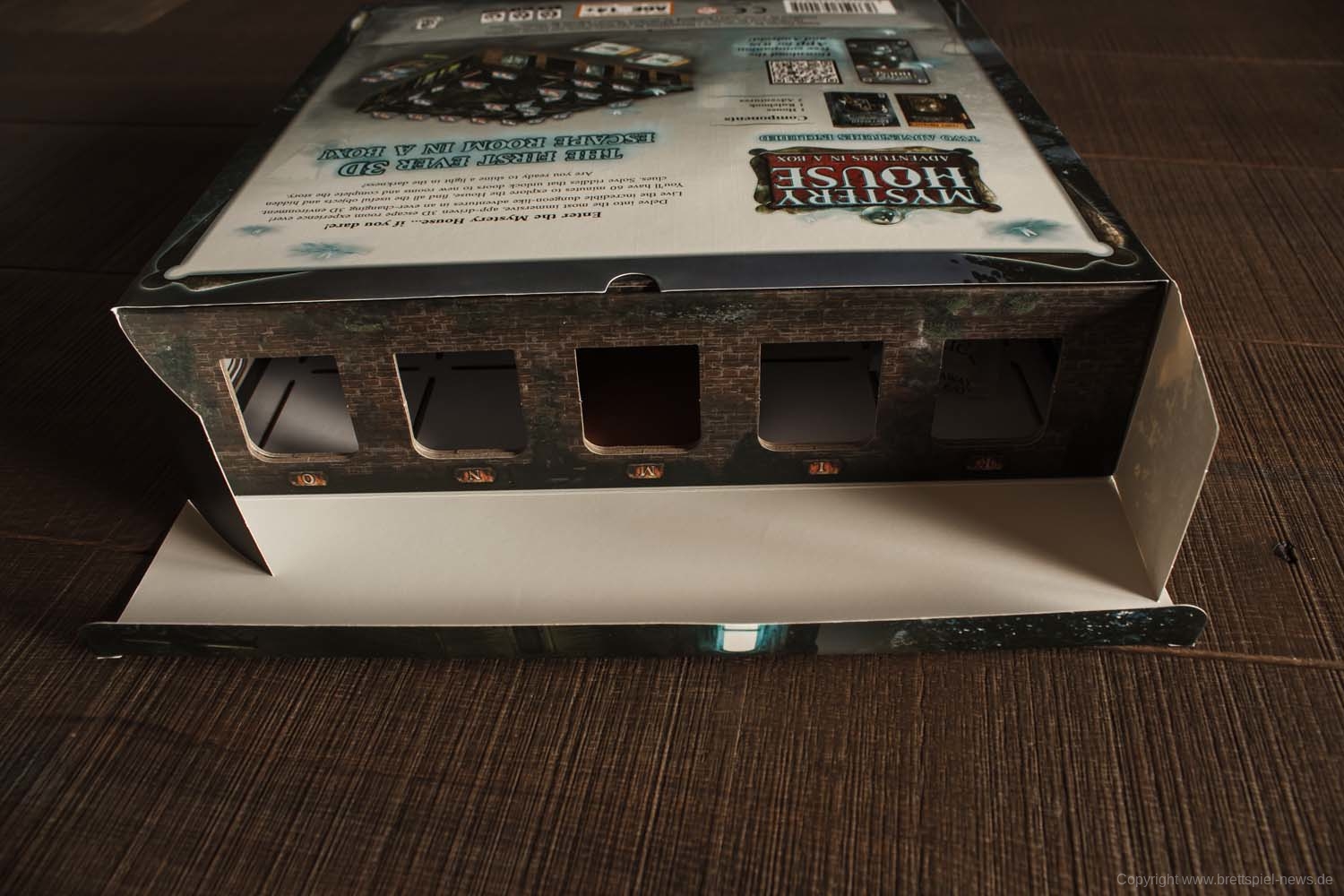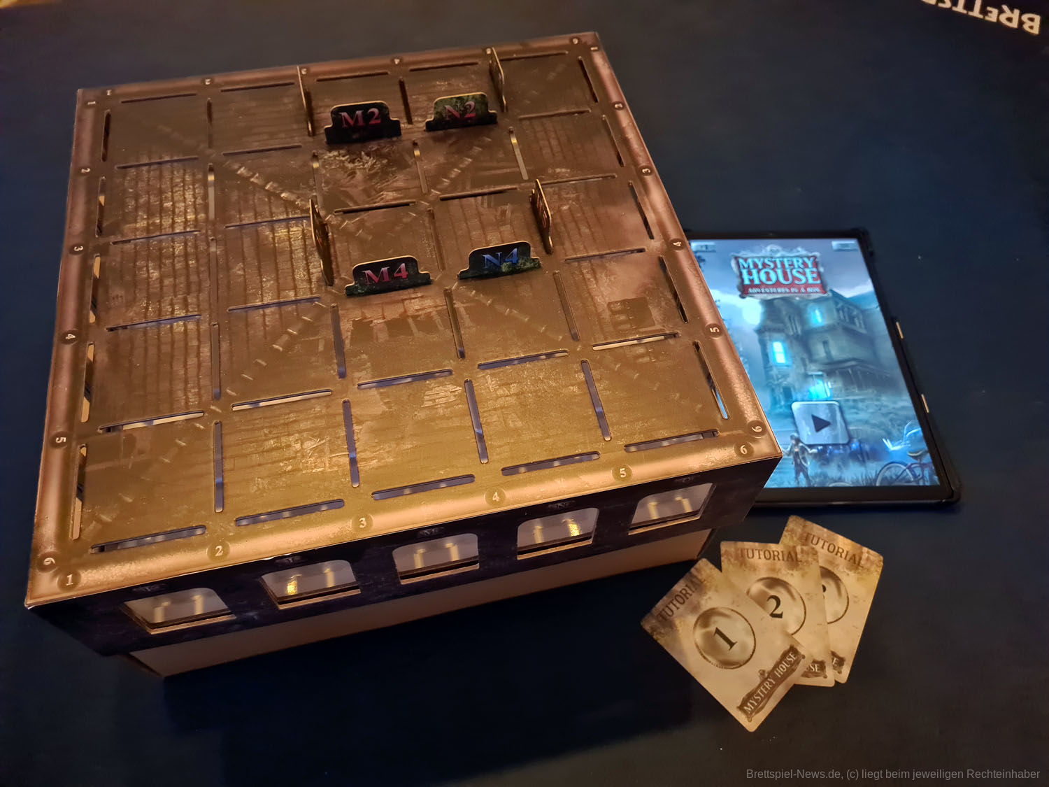 MYSTERY HOUSE von Antonio Tinto, einem der Co-Autoren von TERRAMARA, ist ein Escape Room-Spiel, das es tatsächlich schafft, sich von anderen Titeln dieser Art klar abzuheben. Der Clou bei dem Spiel ist, dass es ein dreimensionales Szenario erschafft, indem die Spielbox als Spielfeld hergenommen wird. Die SpielerInnen schauen durch Fenster an der Außenseite in die Box und mit Hilfe einer App gilt es, Rätsel zu lösen. Durch das Einsetzen von Trennern entsteht so für jedes Szenario ein neues Innenleben, das durch Entfernen von Trennern Geheimnisse Preisgeben kann.