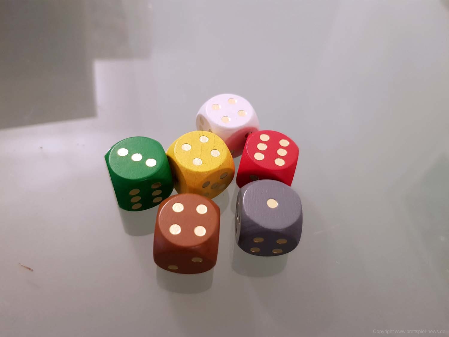 - Jeder Spieler würfelt seinerseits sechs Würfel. Der aktive Spieler kann drei Würfel wählen, dann wählen die anderen Spieler jeweils einen der restlichen Würfel.