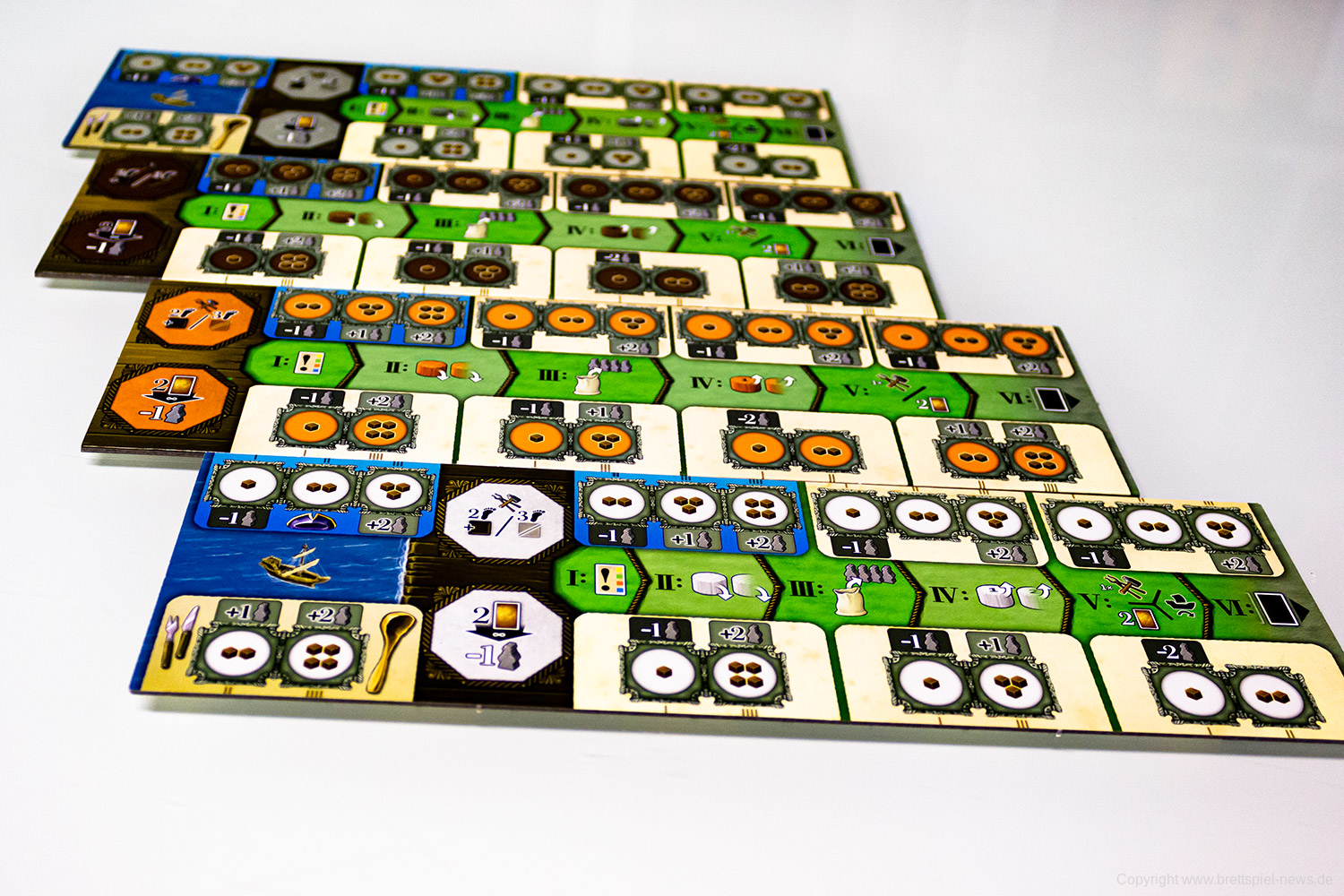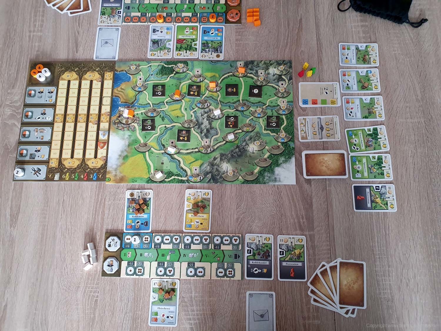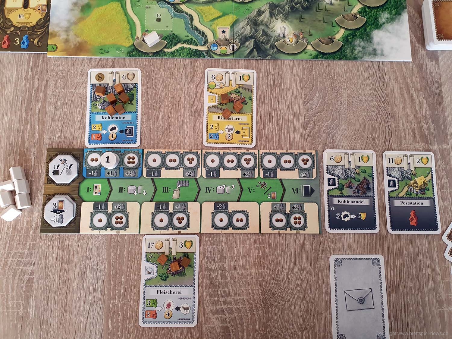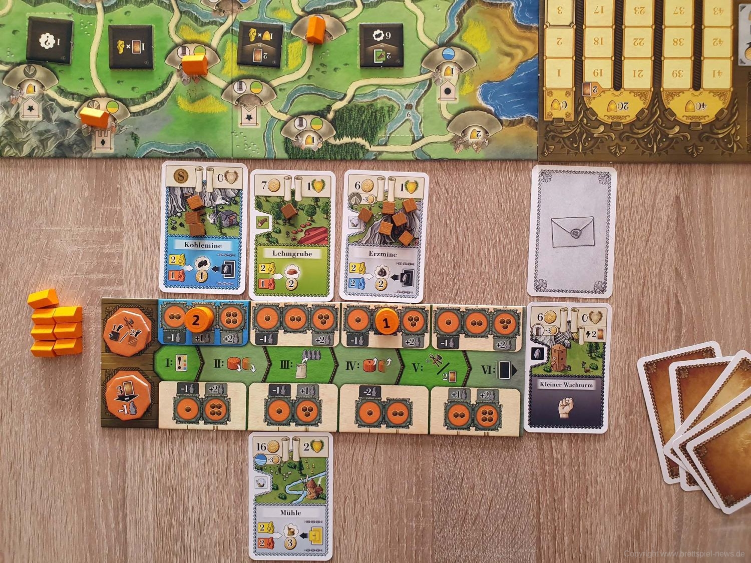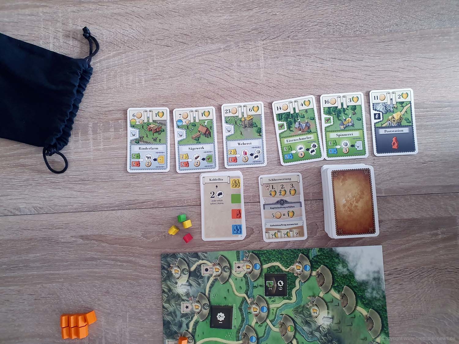 Ihr beginnt das Spiel mit eurem persönlichen Tableau, einem Köhler als Startgebäude und 5 Handkarten. Je nachdem, welches der Kapitel ihr spielt, habt ihr das entsprechende Spielbrett natürlich ebenfalls vor euch in der Tischmitte liegen. Reihum (bzw. teilweise auch parallel, sobald ihr das Spiel gut genug beherrscht) werden nun die 6 Phasen einer jeden Runde gespielt. In Phase 1 wird ein Ereignis ausgelöst, welches in den meisten Fällen etwas am Rundenablauf verändert (z. B., indem neue Gebäude ins Spiel kommen). Darüber hinaus zeigt es eine Anzahl Arbeiter, die in dieser Runde für Produktionen zur Verfügung stehen. Diese Information benötigt ihr auch, denn in Phase 2 müsst ihr eure Aktionssteine einsetzen und somit den Ablauf eures weiteren Zuges planen. Dazu sind eure Aktionssteine von 1 bis 4 durchnummeriert, was in Phase 4 wieder wichtig wird. Erstmal aber zu Phase 3. In dieser werden zufällig weitere Arbeiter aus einem Stoffbeutel gezogen und dem Arbeitsmarkt hinzugefügt, so dass Produktionen, für die vorher noch nicht ausreichend Arbeiter zur Verfügung standen, nun erfolgreich durchgeführt werden können. Es kann sich also lohnen zu pokern! Kommen wir zu Phase 4 und dazu, dass eure Aktionssteine in Reihenfolge ihrer Nummern abgearbeitet werden. Hoffentlich hattet ihr einen „Backup-Plan“, denn falls zu wenig Arbeiter zur Verfügung stehen und eure geplante Produktion nicht erfolgreich ist, kann dies eine Kette von Ereignissen auslösen. Keine Produktion bedeutet eventuell nicht ausreichend Geld, um das Gebäude zu bauen, was euer zweiter Aktionsstein machen sollte. Der dritte Aktionsstein hätte direkt in dem neuen Gebäude produzieren sollen? Tja, wo kein Gebäude ist, da kann auch nicht produziert werden. Planung, ein wenig Glück und gute Alternativpläne sind also der Weg zum Erfolg. In Phase 5 haben alle noch eine zusätzliche Bauaktion oder alternativ die Möglichkeit, neue Handkarten zu bekommen. Abschließend werden in Phase 6 die Gebäude abgehandelt, die keine Arbeiter benötigen. Das kann z. B. eine automatische Kohleproduktion oder ein Gebäude sein, das die Umwandlung bestimmter Waren in Siegpunkte ermöglicht. Anschließend geht es mit der nächsten Runde weiter. Von diesen werden insgesamt sieben gespielt, an deren Ende eine Endwertung über Sieg und Niederlage entscheidet.