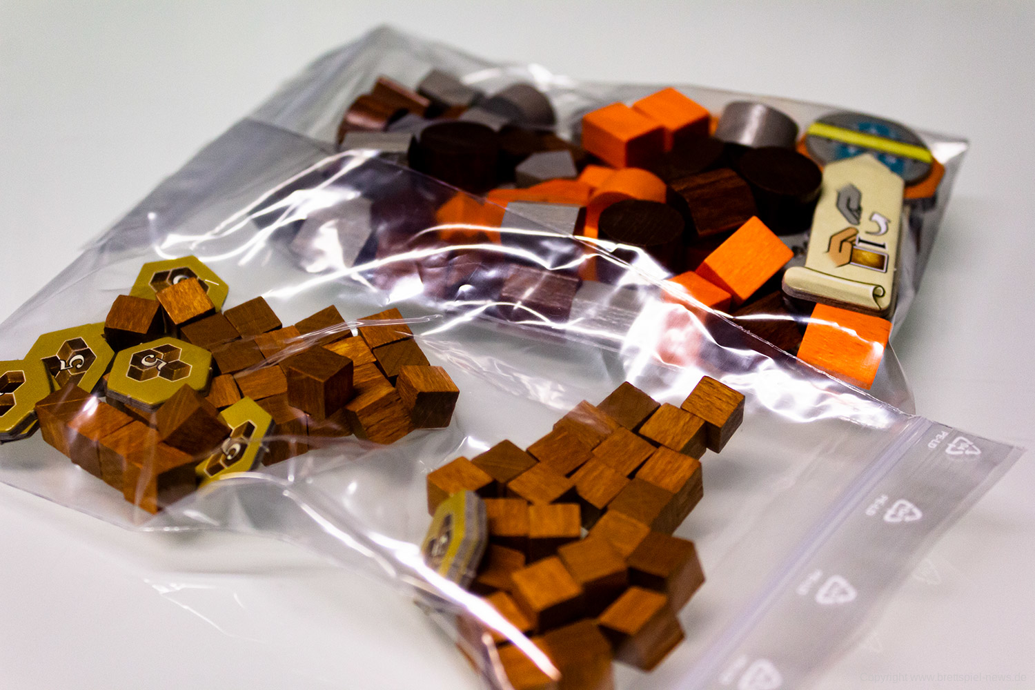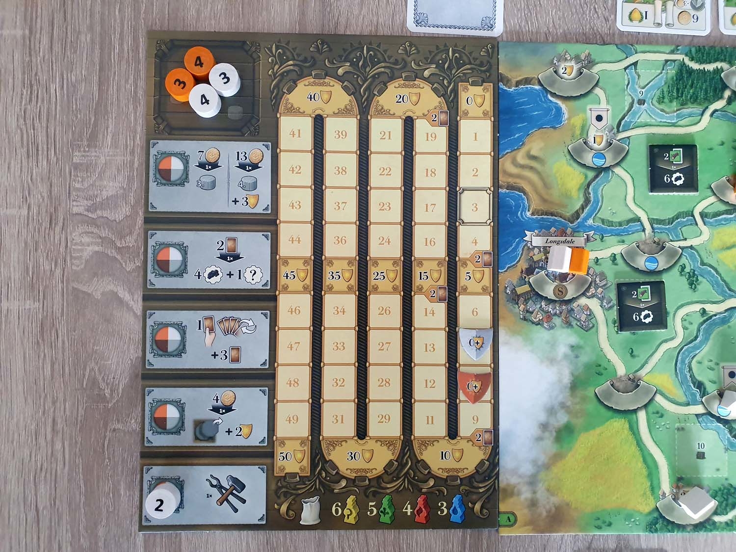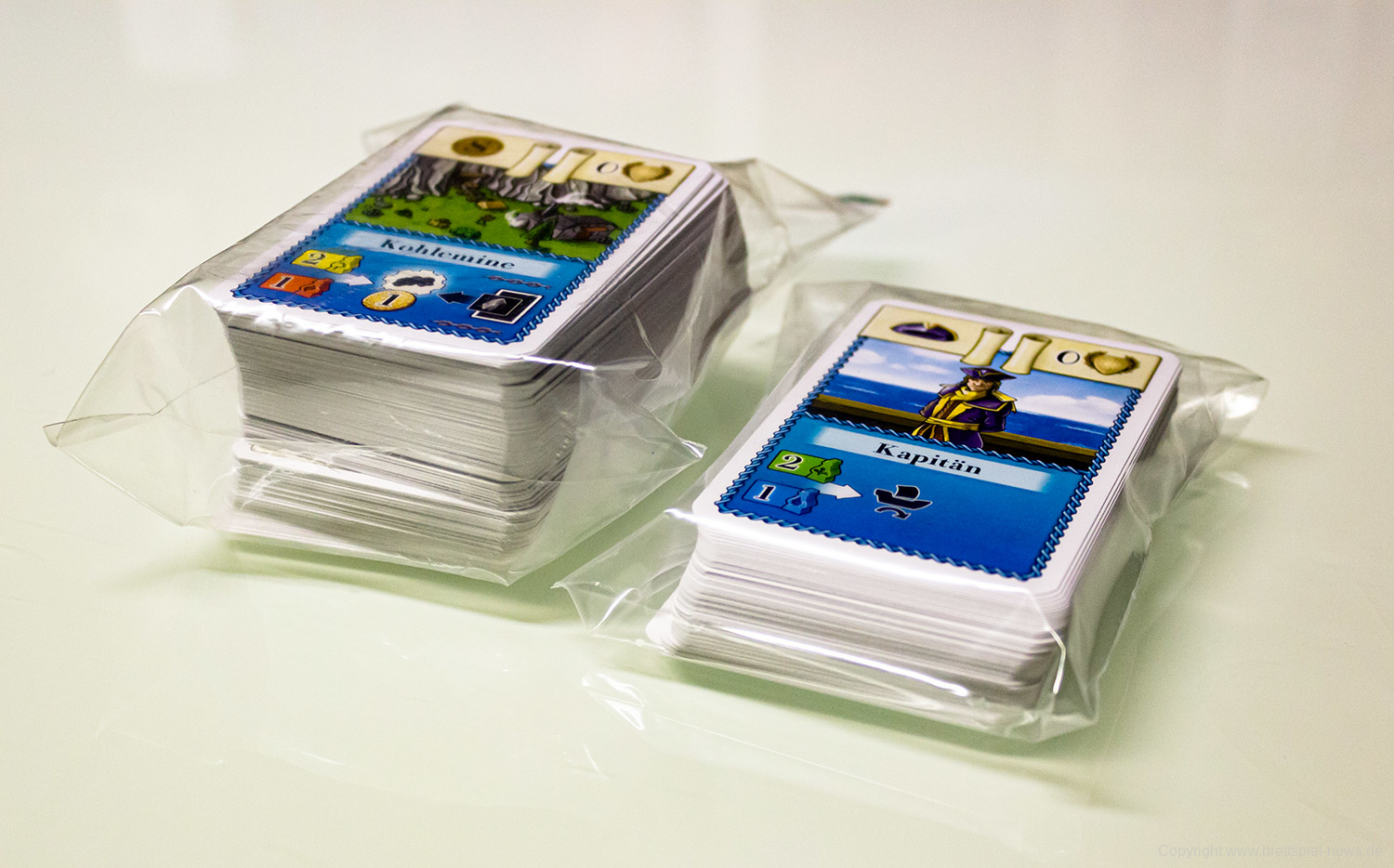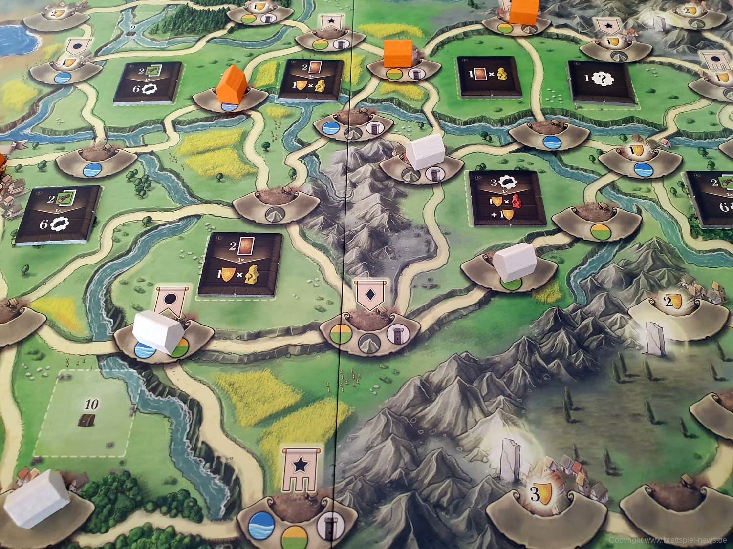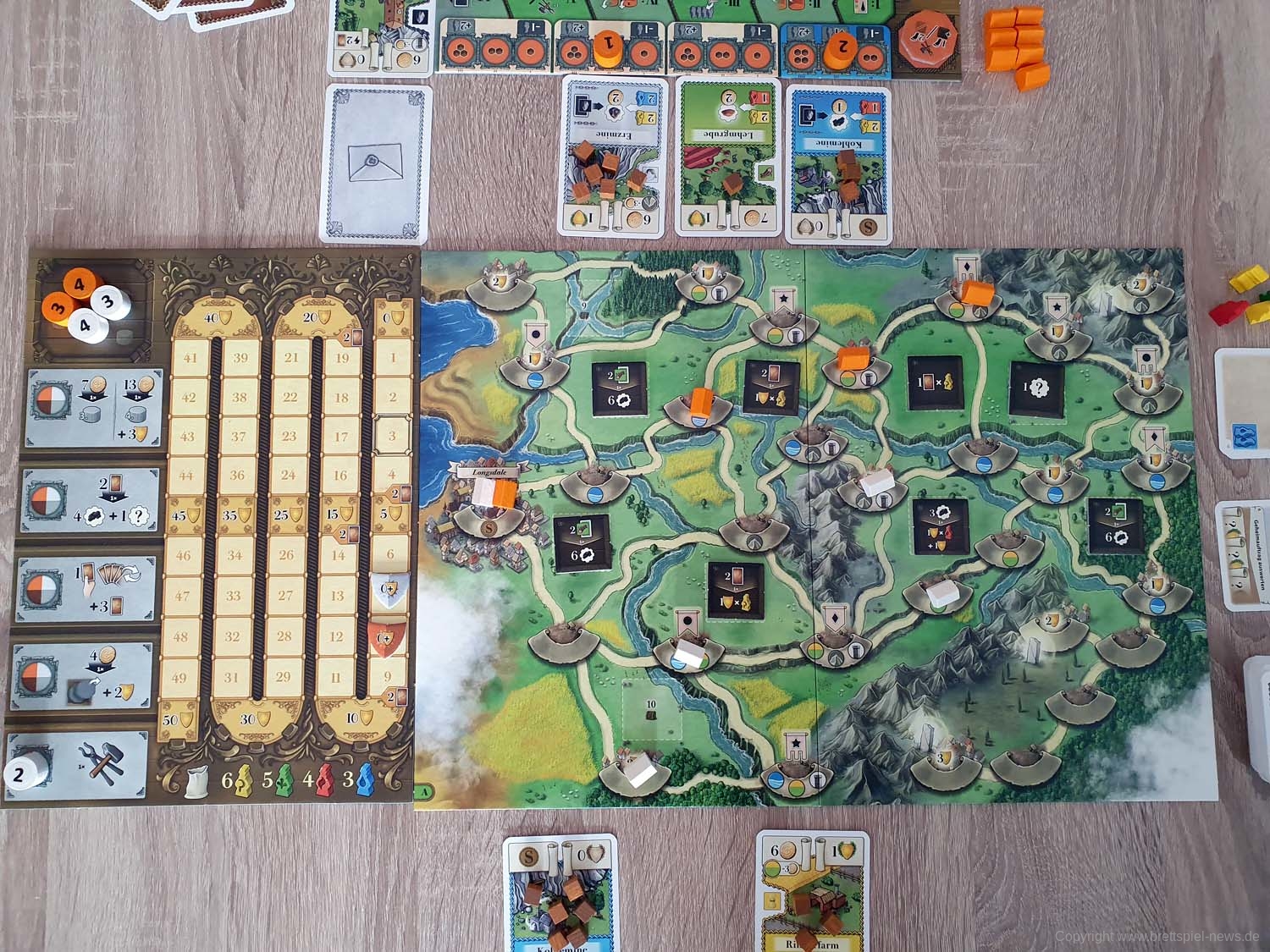 Ihr beginnt das Spiel mit eurem persönlichen Tableau, einem Köhler als Startgebäude und 5 Handkarten. Je nachdem, welches der Kapitel ihr spielt, habt ihr das entsprechende Spielbrett natürlich ebenfalls vor euch in der Tischmitte liegen. Reihum (bzw. teilweise auch parallel, sobald ihr das Spiel gut genug beherrscht) werden nun die 6 Phasen einer jeden Runde gespielt. In Phase 1 wird ein Ereignis ausgelöst, welches in den meisten Fällen etwas am Rundenablauf verändert (z. B., indem neue Gebäude ins Spiel kommen). Darüber hinaus zeigt es eine Anzahl Arbeiter, die in dieser Runde für Produktionen zur Verfügung stehen. Diese Information benötigt ihr auch, denn in Phase 2 müsst ihr eure Aktionssteine einsetzen und somit den Ablauf eures weiteren Zuges planen. Dazu sind eure Aktionssteine von 1 bis 4 durchnummeriert, was in Phase 4 wieder wichtig wird. Erstmal aber zu Phase 3. In dieser werden zufällig weitere Arbeiter aus einem Stoffbeutel gezogen und dem Arbeitsmarkt hinzugefügt, so dass Produktionen, für die vorher noch nicht ausreichend Arbeiter zur Verfügung standen, nun erfolgreich durchgeführt werden können. Es kann sich also lohnen zu pokern! Kommen wir zu Phase 4 und dazu, dass eure Aktionssteine in Reihenfolge ihrer Nummern abgearbeitet werden. Hoffentlich hattet ihr einen „Backup-Plan“, denn falls zu wenig Arbeiter zur Verfügung stehen und eure geplante Produktion nicht erfolgreich ist, kann dies eine Kette von Ereignissen auslösen. Keine Produktion bedeutet eventuell nicht ausreichend Geld, um das Gebäude zu bauen, was euer zweiter Aktionsstein machen sollte. Der dritte Aktionsstein hätte direkt in dem neuen Gebäude produzieren sollen? Tja, wo kein Gebäude ist, da kann auch nicht produziert werden. Planung, ein wenig Glück und gute Alternativpläne sind also der Weg zum Erfolg. In Phase 5 haben alle noch eine zusätzliche Bauaktion oder alternativ die Möglichkeit, neue Handkarten zu bekommen. Abschließend werden in Phase 6 die Gebäude abgehandelt, die keine Arbeiter benötigen. Das kann z. B. eine automatische Kohleproduktion oder ein Gebäude sein, das die Umwandlung bestimmter Waren in Siegpunkte ermöglicht. Anschließend geht es mit der nächsten Runde weiter. Von diesen werden insgesamt sieben gespielt, an deren Ende eine Endwertung über Sieg und Niederlage entscheidet.