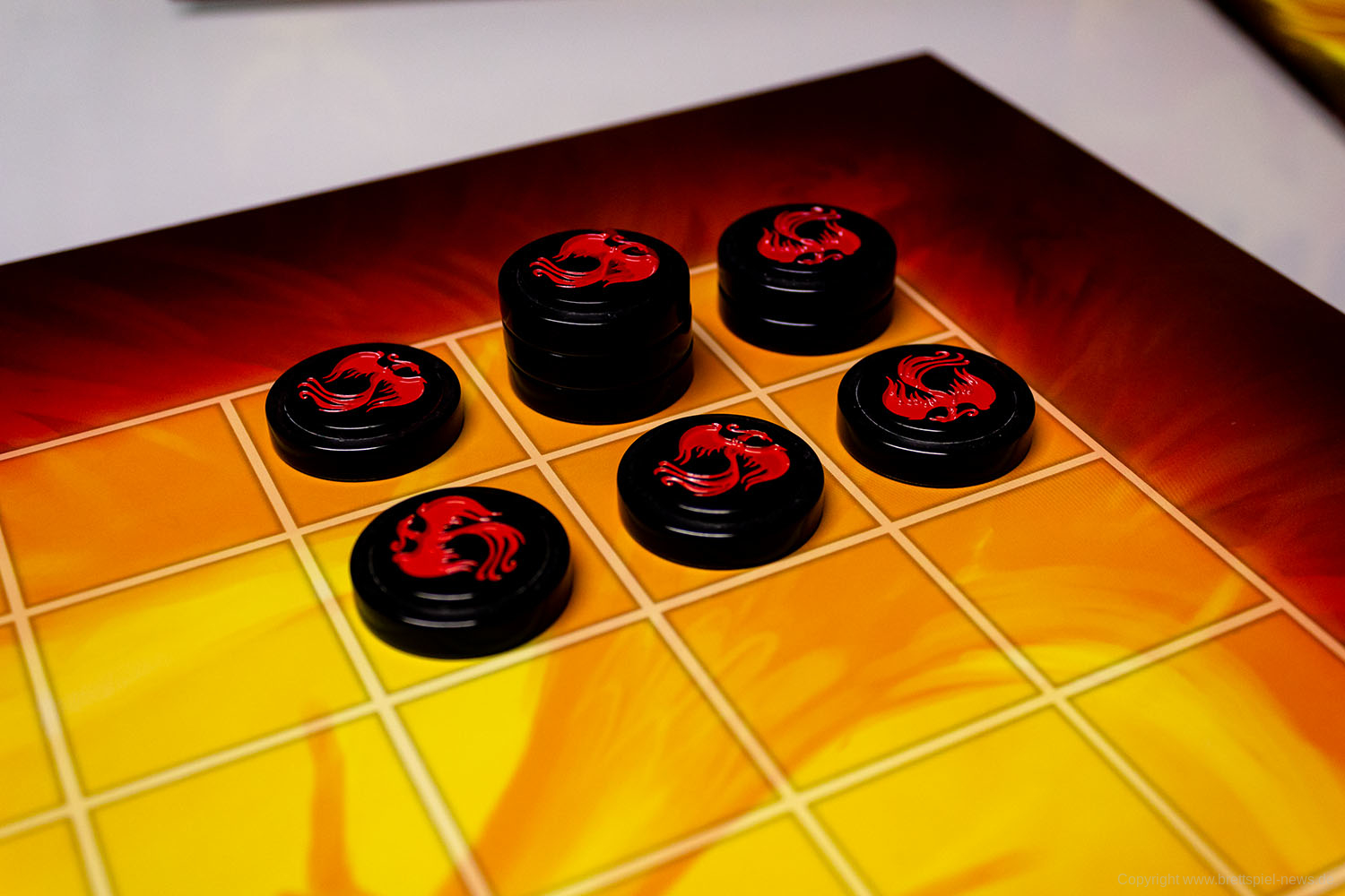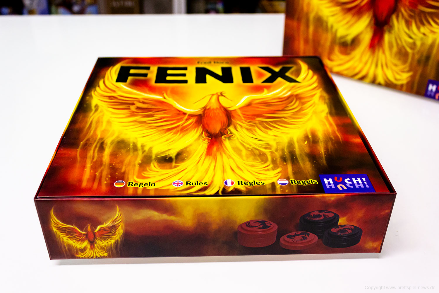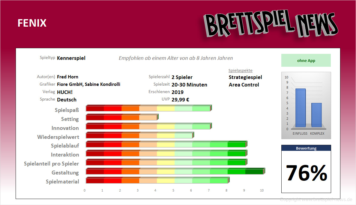 Mit Fenix hat HUCH! Ein Strategiespiel für 2 Spieler veröffentlicht. Die Spieldauer soll 20 Minuten betragen und das Spiel soll einen hohen Wiederspielwert aufweisen. Das Spielmaterial macht einen sehr guten Eindruck. Die einzelnen Spielsteine passen perfekt ineinander. Sie haben eine gute Haptik, und auch das Spielfeld ist sehr gut produziert.