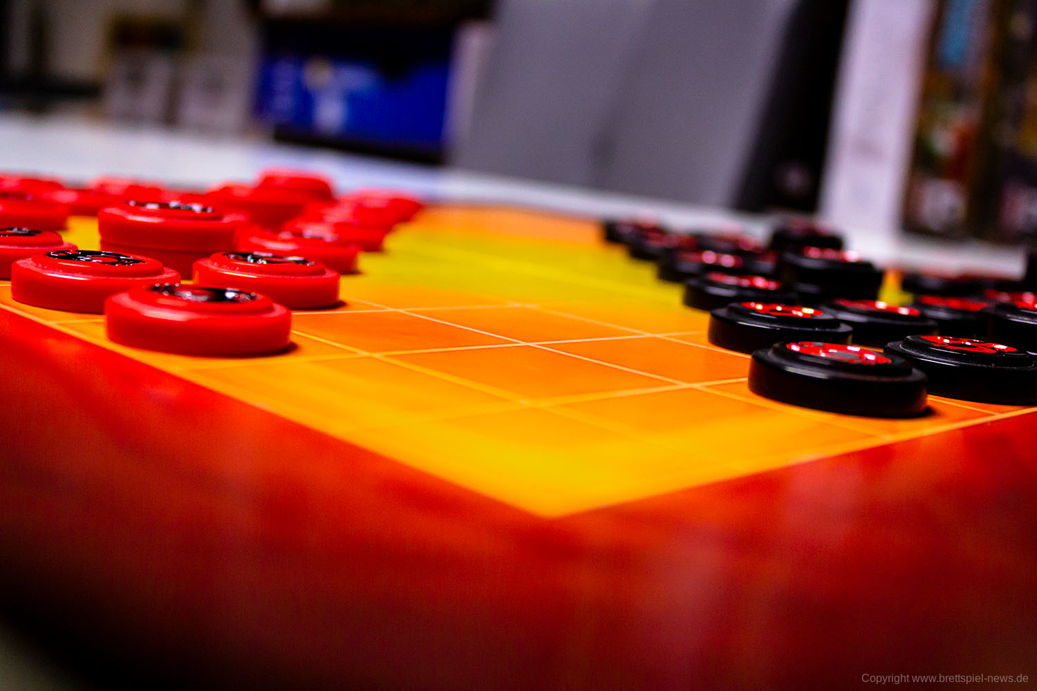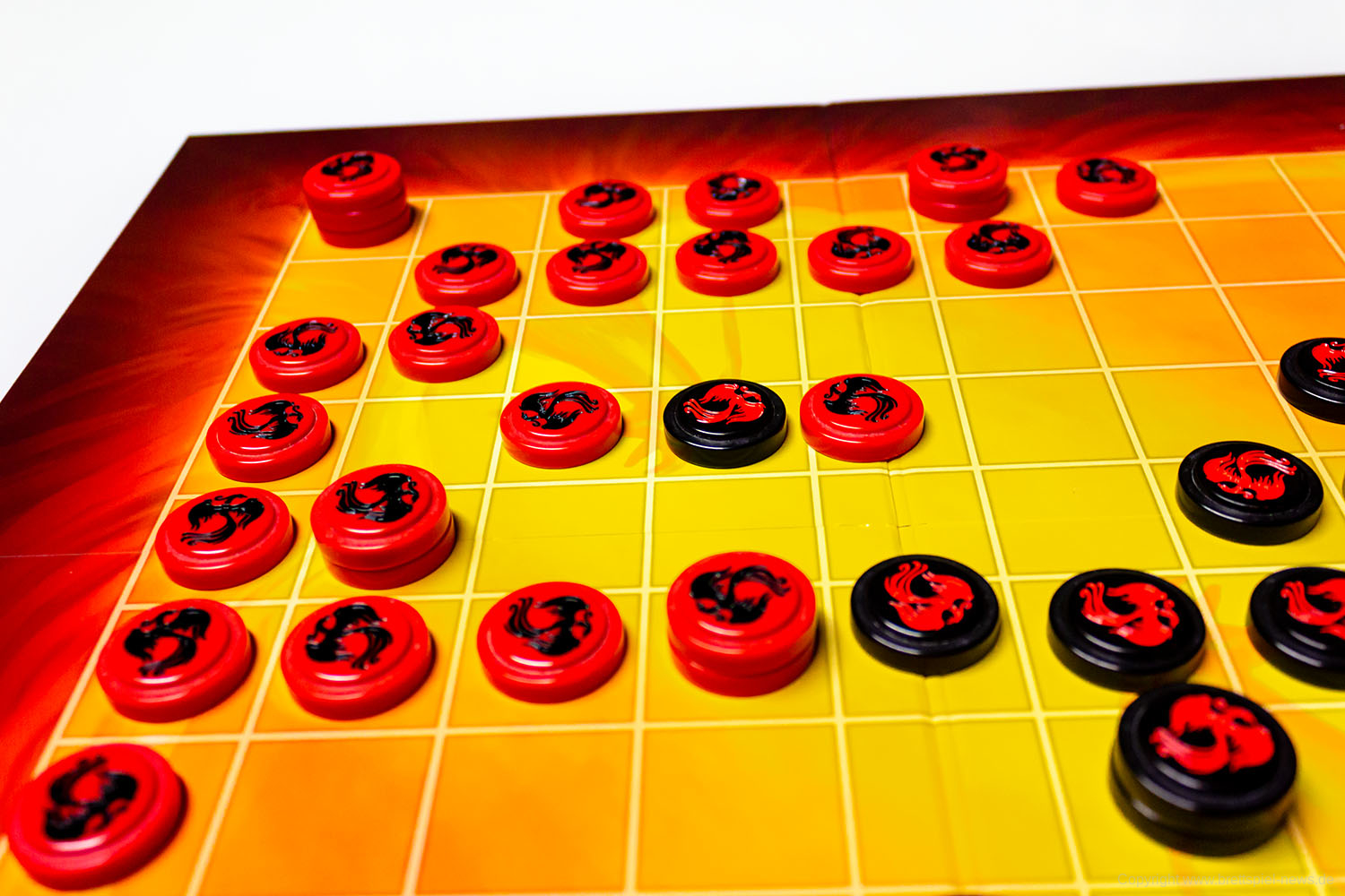 Der rechteckige Spielplan wird so auf den Tisch gelegt, dass sich beide Spieler gegenübersitzen und jeweils die Spitze des eigenen Lagers auf den entsprechenden Spieler zeigt. Der Spielplan bietet zwei Varianten im 9 x 9 oder 7 x 8 Raster.