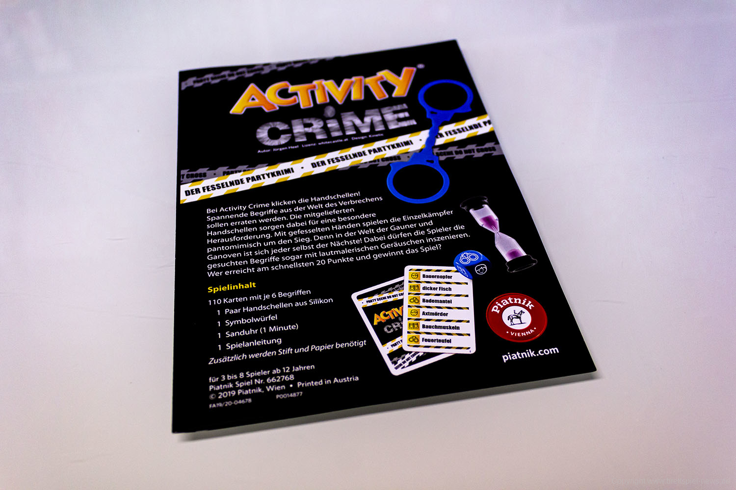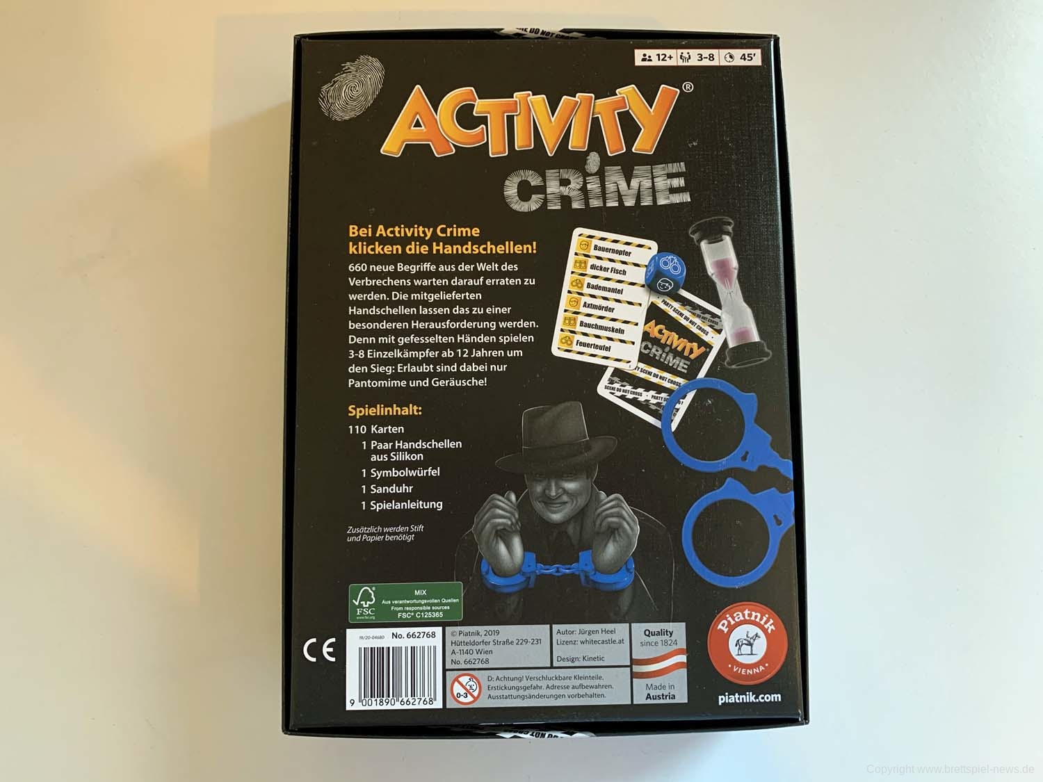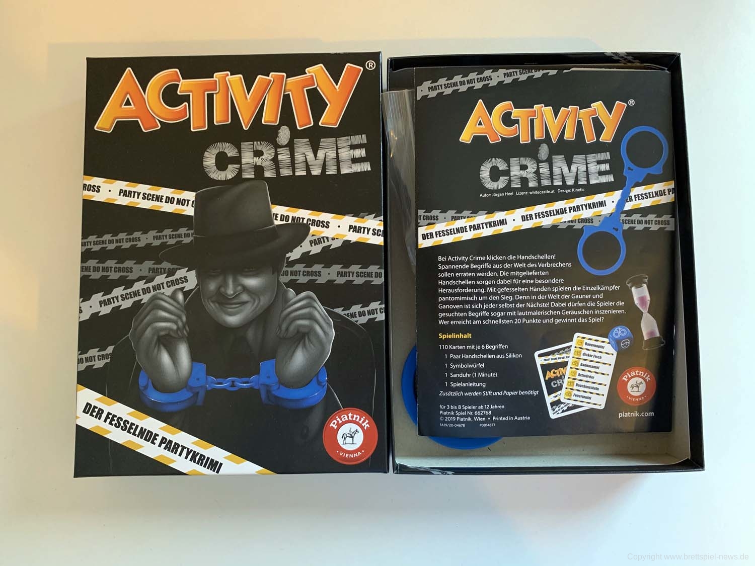 Das Prinzip von ACTIVITY ist bekannt und bewährt. Nun ist bei Piatnik die Version ACTIVITY CRIME erschienen, die sich für Spielgruppen von acht und mehr eignet. Das besondere an der Version ist, dass die MitspielerInnen die einen Begriff erklären müssen durch Handschellen sehr beschränkt und in ungewohnter Situation. Erklärt werden ausschließlich Begriffe die mit Kriminalität zu tun haben.