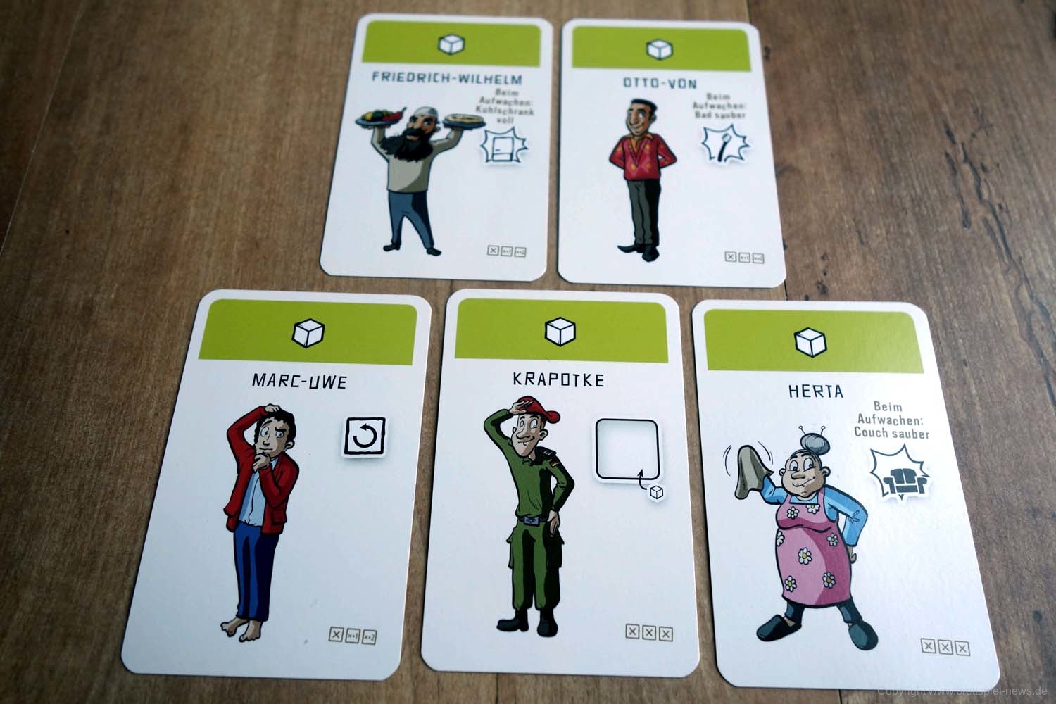Im Spiel „Würfel-WG“ werden neue Mitbewohner gesucht, die Ordnung ins Chaos bringen. Auch das Känguru von Erfolgsautor Marc-Uwe Kling ist dabei. Die Spieler würfeln, um neue WG-Mitglieder anzuwerben. Diese bringen weitere Würfel mit und helfen, punktebringende Aktivitäten zu starten. Dabei nützt das Würfelergebnis nicht nur dem Teilnehmer, der gerade spielt, sondern auch allen Mitspielern. Gewinner ist der glückliche Besitzer der Hängematte, die vergeben wird, sobald ein Spieler mindestens 14 Punkte gesammelt hat.