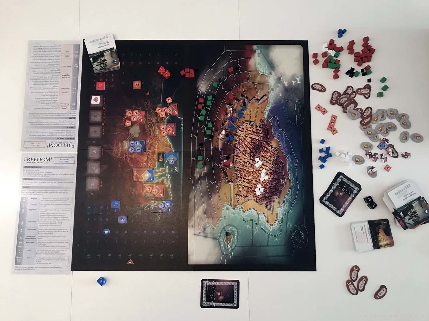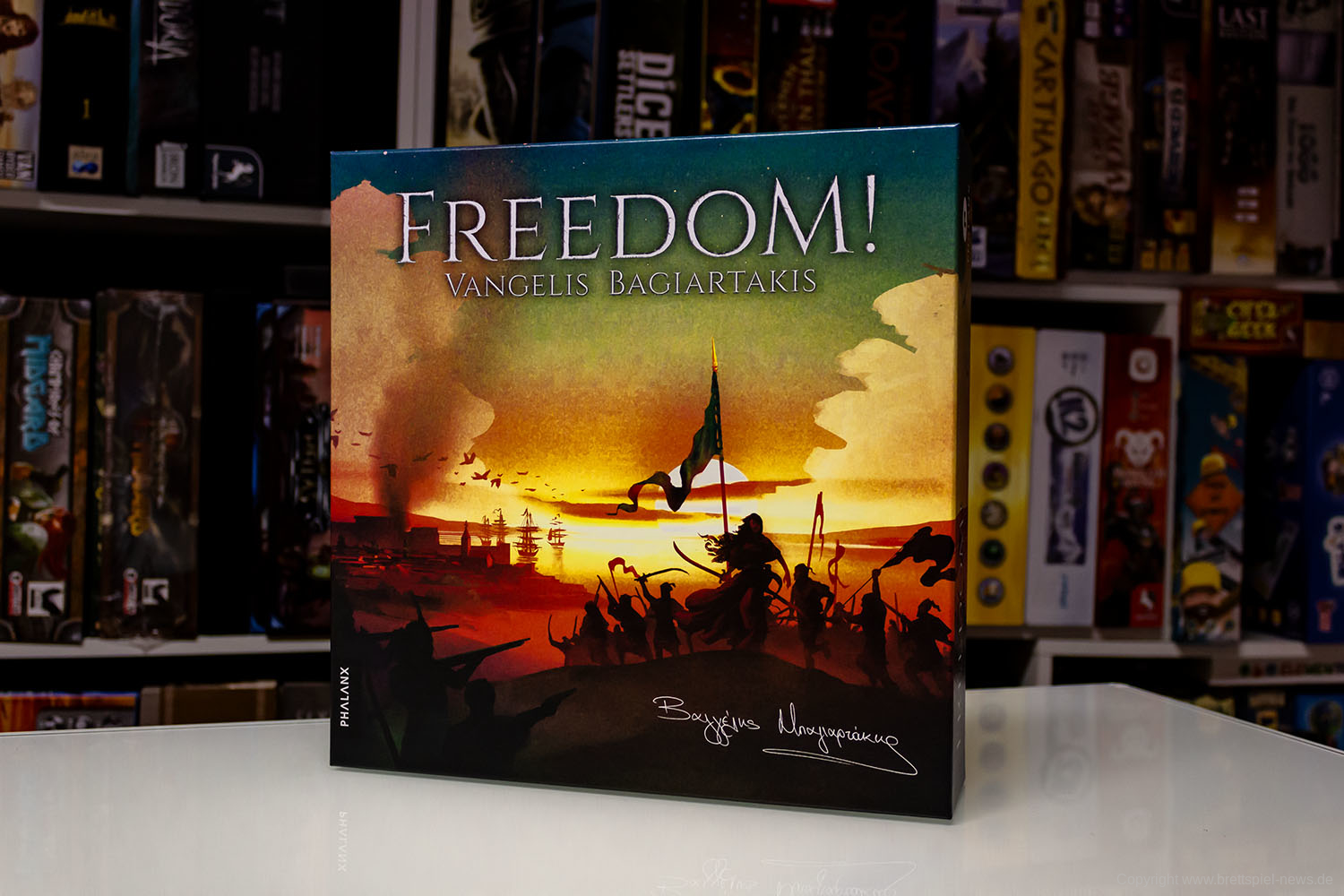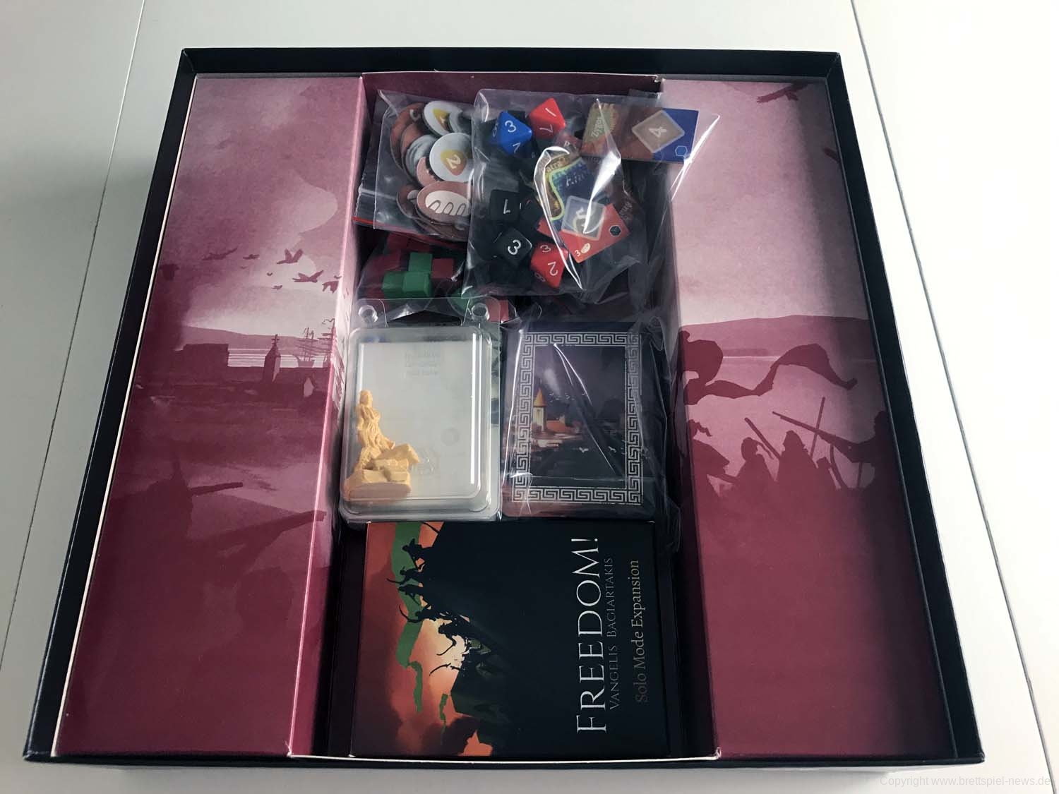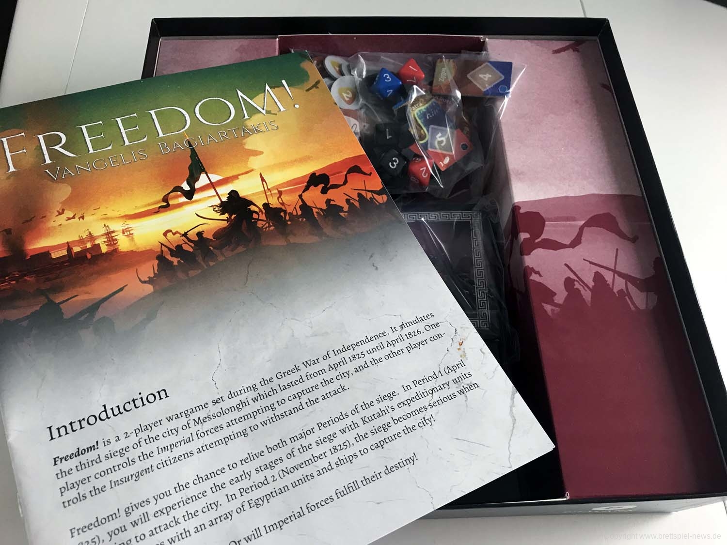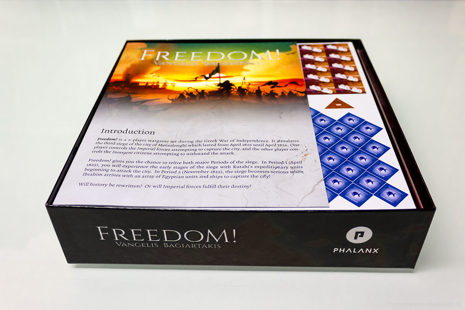 Das Spiel Freedom ist gerade dabei ausgeliefert zu werden. Wir haben ein Exemplar erhalten und zeigen Bilder vom Spiel, dass eine Belagerung einer griechischen Heiligen Stadt (Messolonghi) durch osmanische Truppen während des griechischen Unabhängigkeitskrieges dargestellt. Es ist ein reines Zweispieler-Spiel, das asymmetrisch ausgerichtet ist. Es ist bei PHALANX erschienen und vorerst nur in englischer Sprache verfügbar.