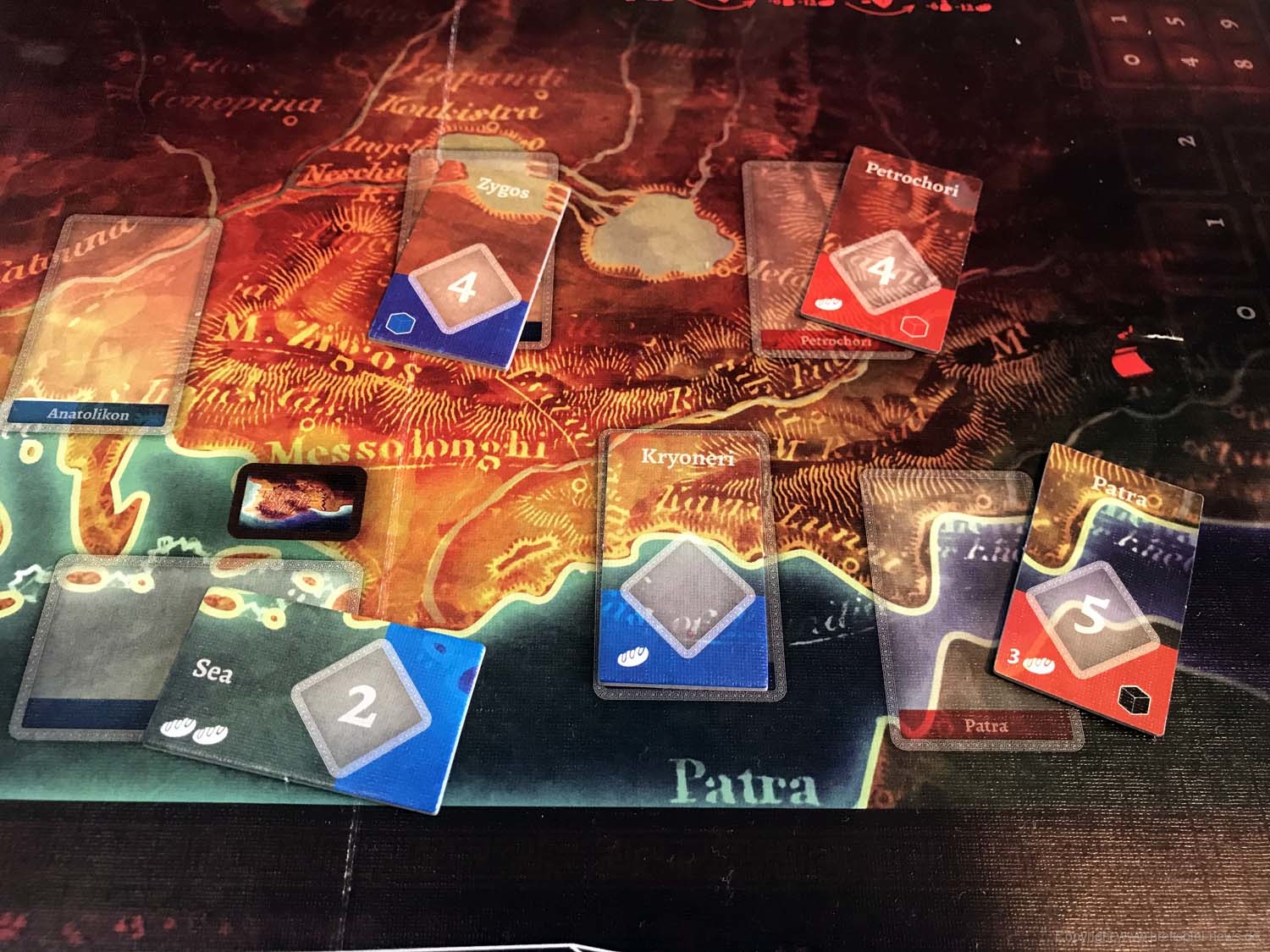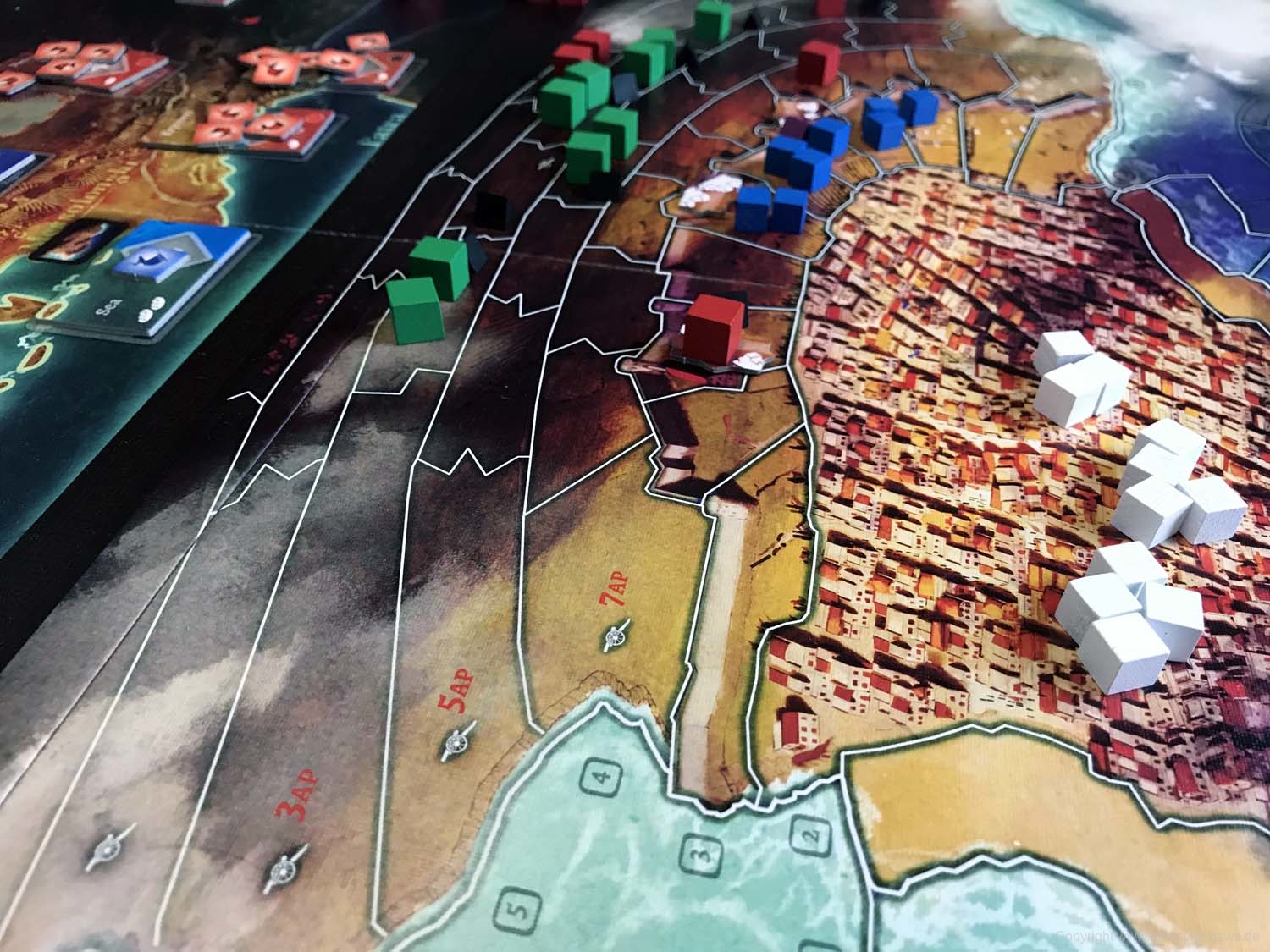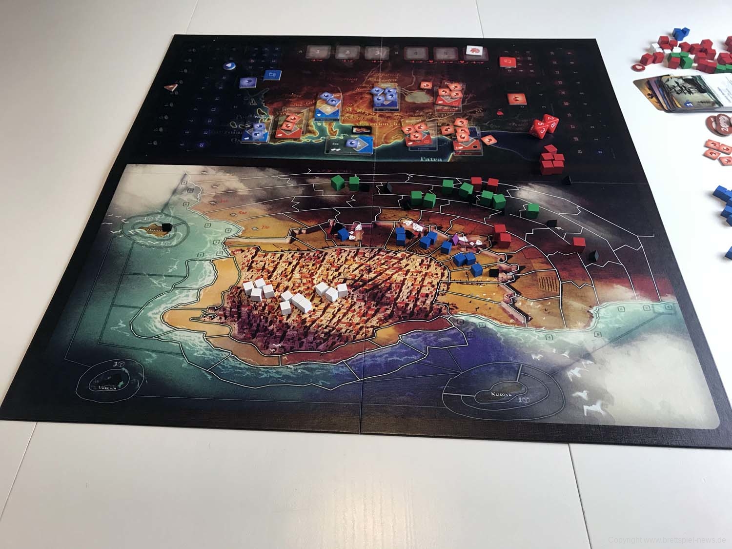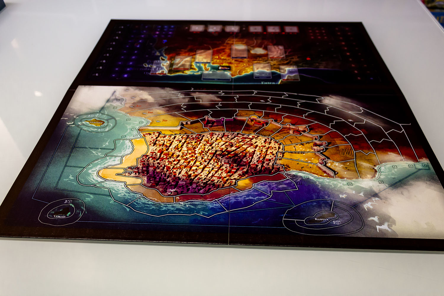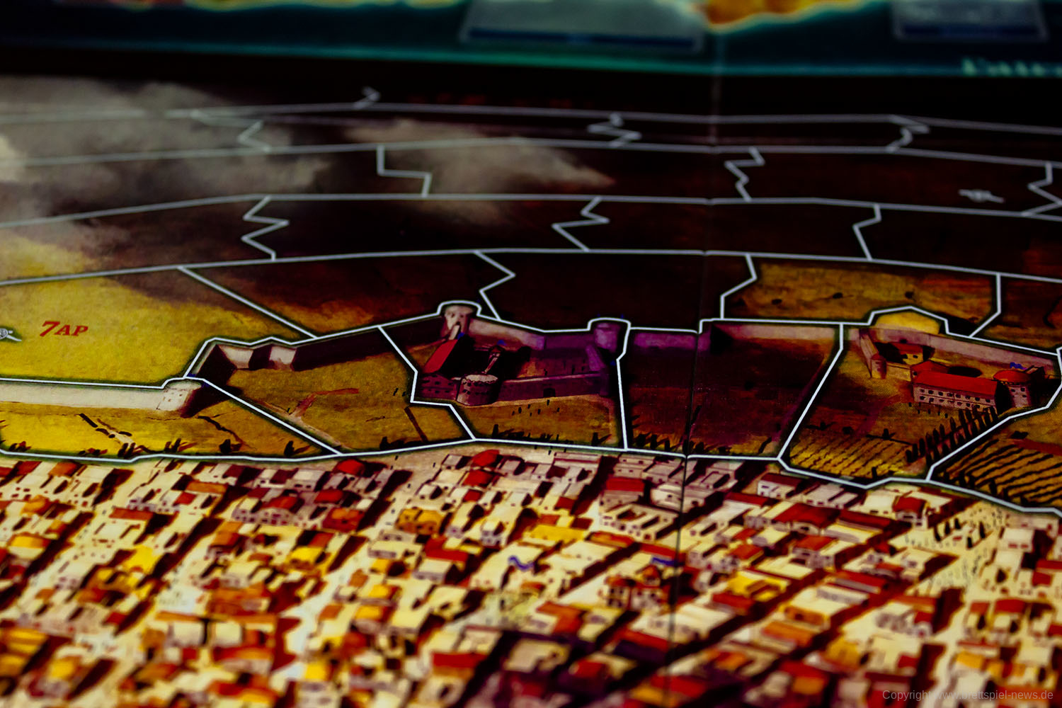 Die Schlacht findet in zwei Karten statt: eine zeigt die tatsächliche Stadt und die an der Belagerung beteiligten Kräfte, eine mit den umliegenden Gebieten und unterstreicht die Unterstützung, die jeder von ihnen beiden Spielern bietet.