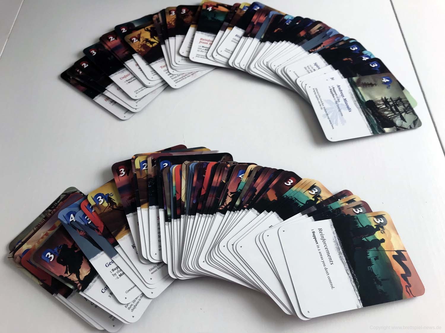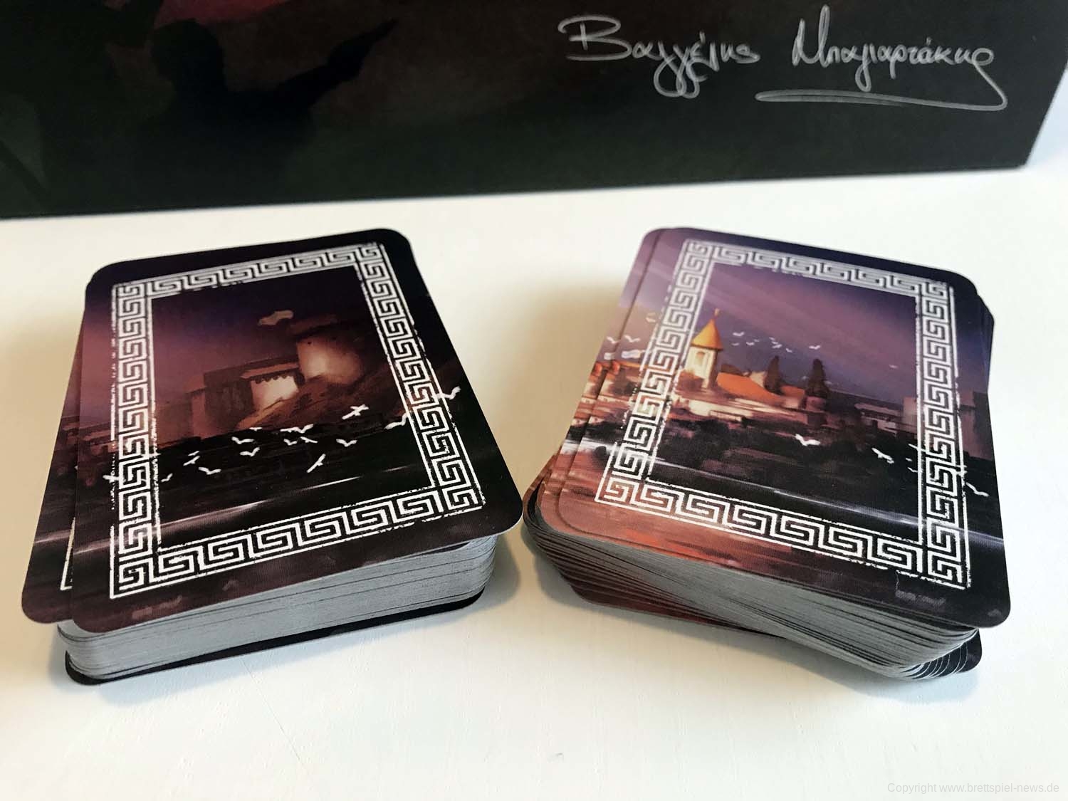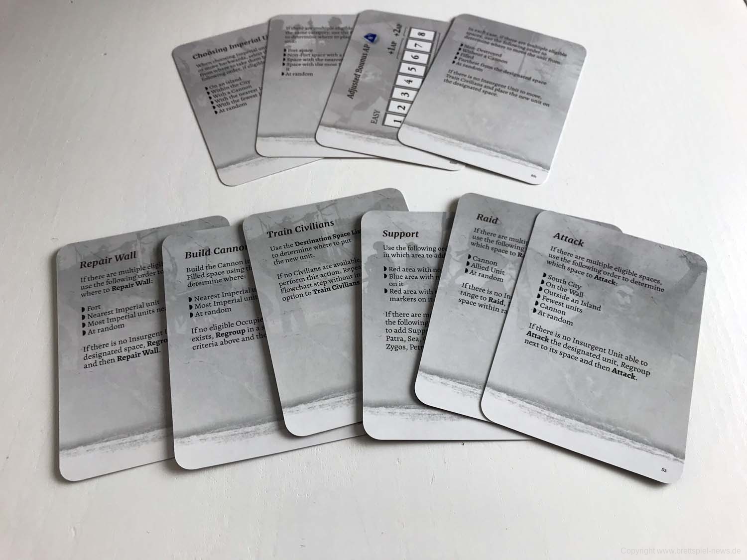 Es fällt das düstere ernste Design auf, das sich von anderen Spielen damit abhebt. Auch die Karten fallen durch die kontrastreichen Motive mit viel Schatten und Schwärze auf. Das alles transportiert ein bedrückendes Gefühl, das dem Spielgefühl vielleicht zuträglich ist.