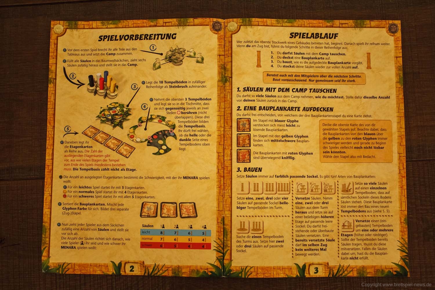 Wie im Basisspiel Menara holen sich die Tempelbauer vor jedem Spielzug Informationen und Ratschläge ihrer Mitspieler ein. Bauplankarten geben vor, in welcher Weise Tempelböden mit Säulen zu bestücken sind. Die neuen Rituale stellen die Spieler vor neue Herausforderungen, denen mit kluger Kooperation, statischer Raffinesse und ruhigen Händen zu begegnen ist.