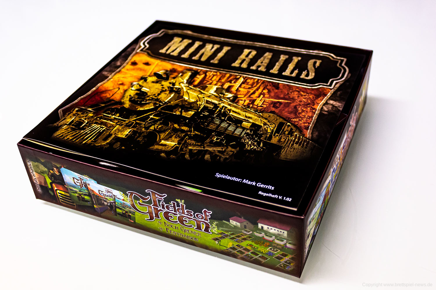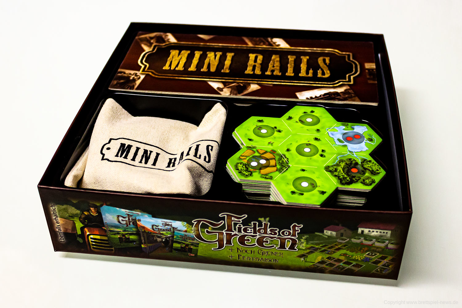 Das Spiel Mini Rails von Mark Gerrits wurde im Oktober 2018 in der Spieleschmiede finanziert. Das Zugspiel für den kleinen Tisch war schon auf der Spiel'17 zu sehen, damals noch mit englischer Version. Im Herbst 2019 ist die kleine Box erschienen und das Spielmaterial macht einen guten Eindruck. Es gibt ein Inlay, alles ist bereits ausgestanzt und das Spielmaterial aus Holz gefertigt.