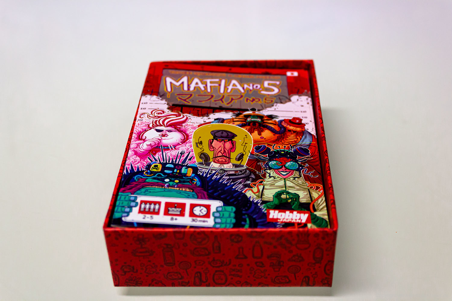 Das skurrile Kartenspiel Mafia No.5 ist im Herbst 2019 bei Hobby Japan erschienen. Es lässt sich mit 2-5 SpielerInnen spielen und bietet rund 30 Minuten Spielzeit. Der Anspruch soll recht gering sein. Die Optik ist durch einen sehr eigenen Comic-Stil geprägt, der gemocht werden muss. In der kleinen Schachtel befindet sich unter anderem auch eine deutsche Anleitung.