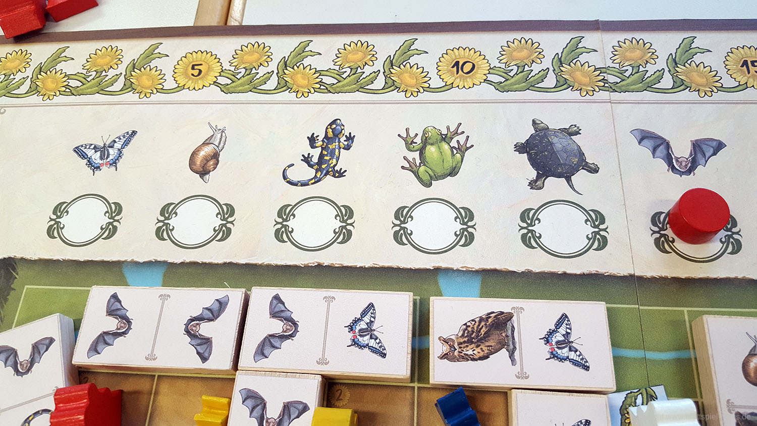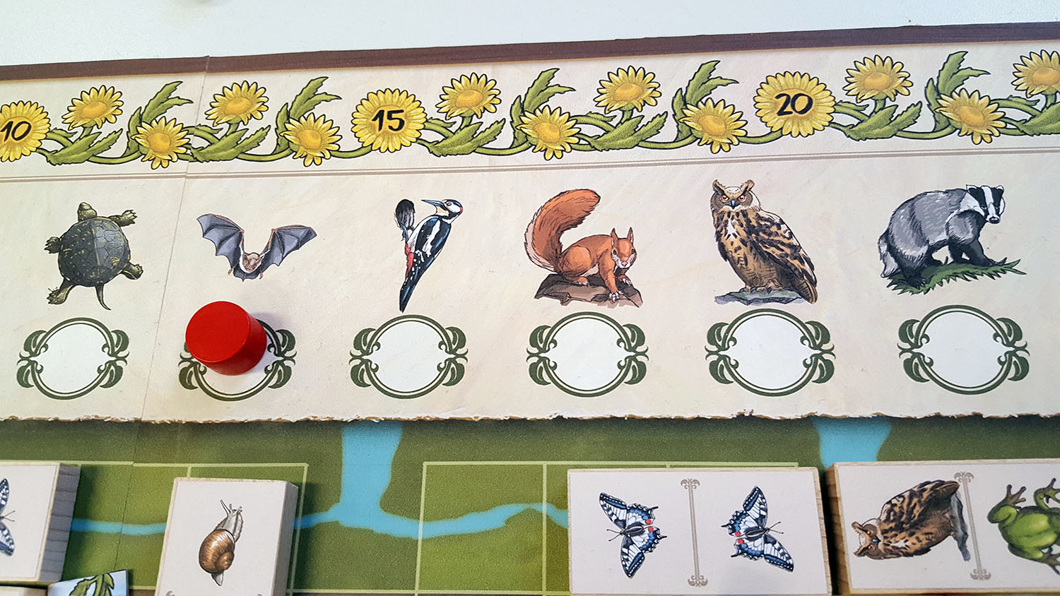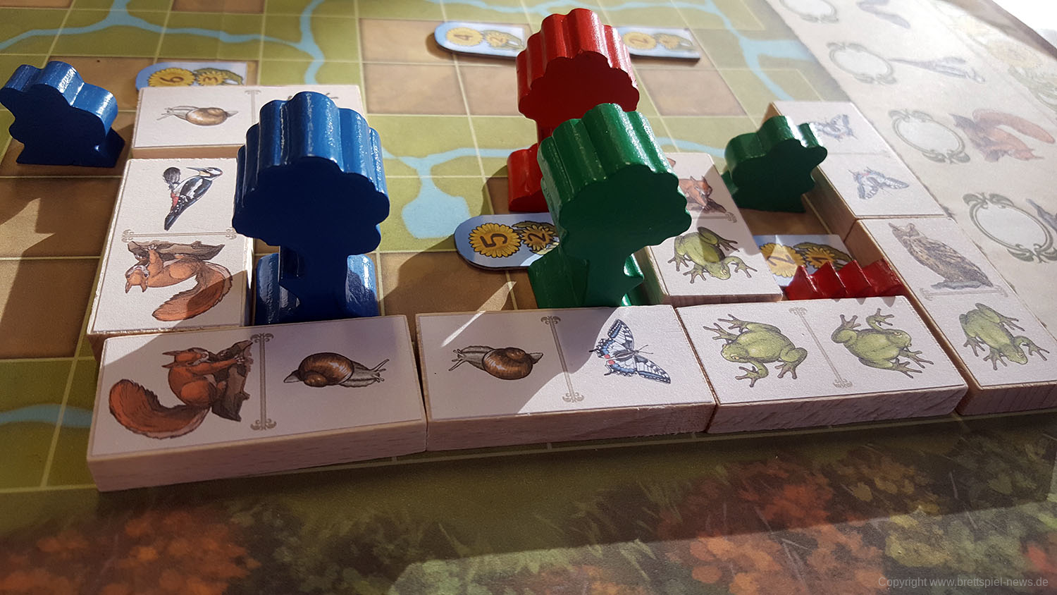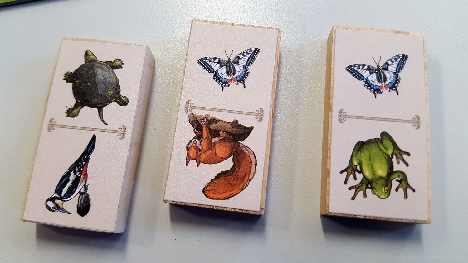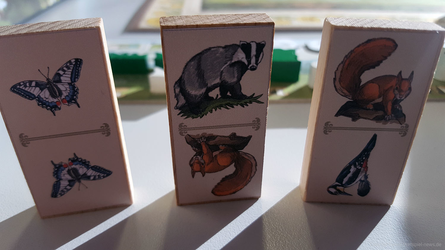 Diese werden für die Mehrheiten auf dem großen Waldspielplan gebraucht und sind in weiss und in der jeweiligen Spielerfarbe vorhanden. Zusätzlich bekommt jeder dreizehn Dominosteine mit jeweils zwei von zehn Tiermotiven darauf. Wer dran ist setzt einen von drei gezogenen Dominosteinen auf ein grünes Feld auf dem Waldspielplan ein. Weiter Steine müssen natürlich das gleiche Tier zeigen wie das auf dem Stein an den angelegt wird. Grenzt der Stein an ein braunes Feld im Wald kann der Spieler entscheiden ob ein Grasbüschel, oder etwas anderes auf das Feld gesetzt werden soll. Grasbüschel haben eine Wertigkeit von 1, Büsche 2, Tannen 3 und Bäume zählen 4 Punkte für die Mehrheit, wenn es zu einer Wertung kommt. Für jedes Holzteil das sich bereits in diesem braunen Gebiet befindet und die gleiche, oder eine niedrigere Wertigkeit, als das gerade eingesetzte Teil hat gibt es einen Punkt.