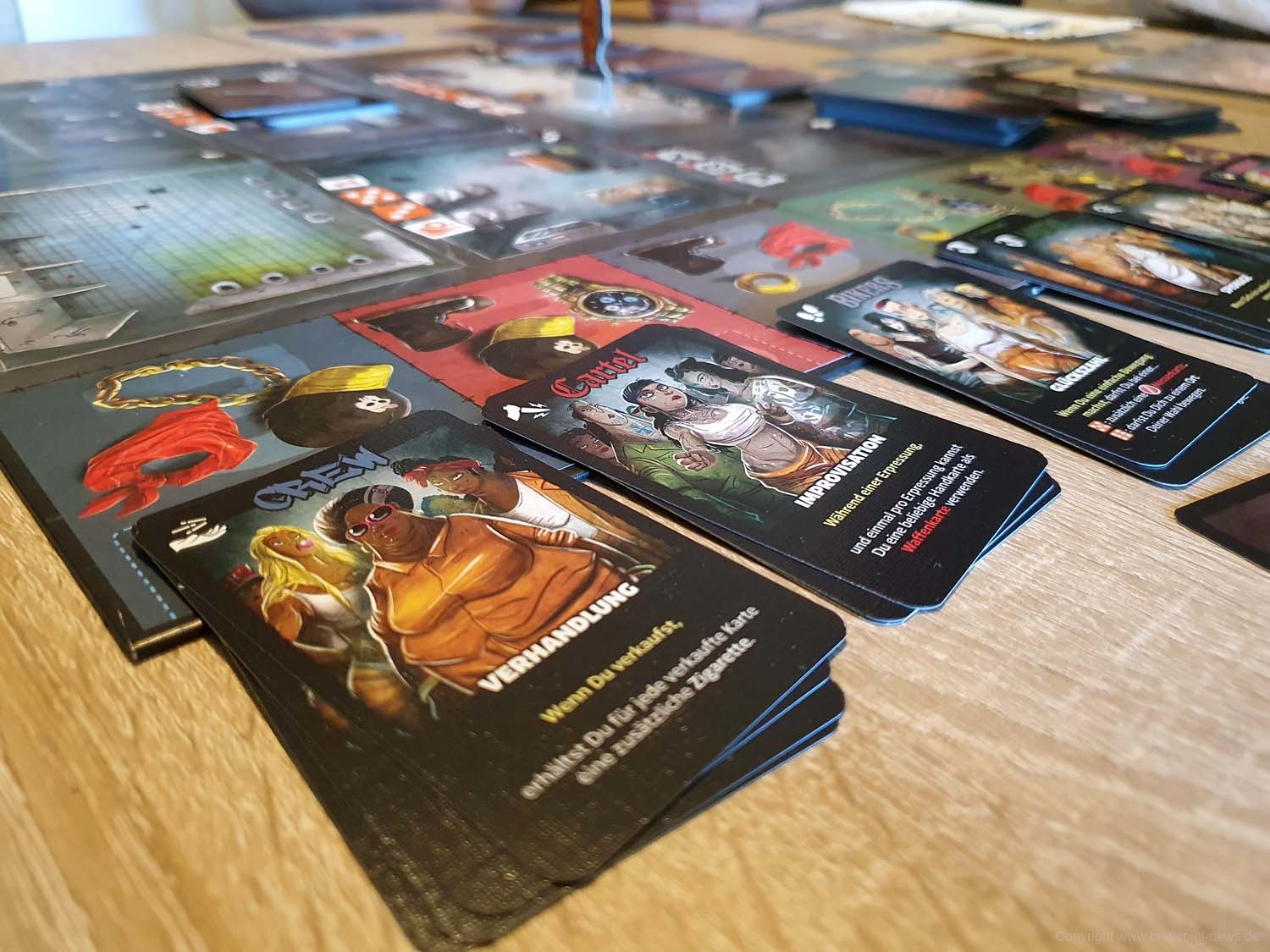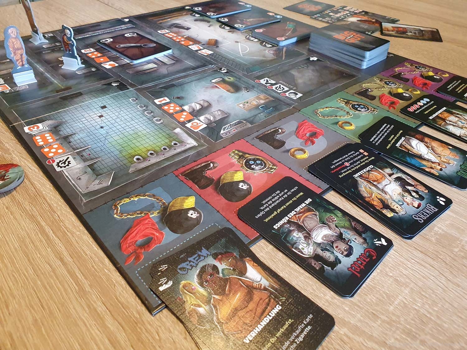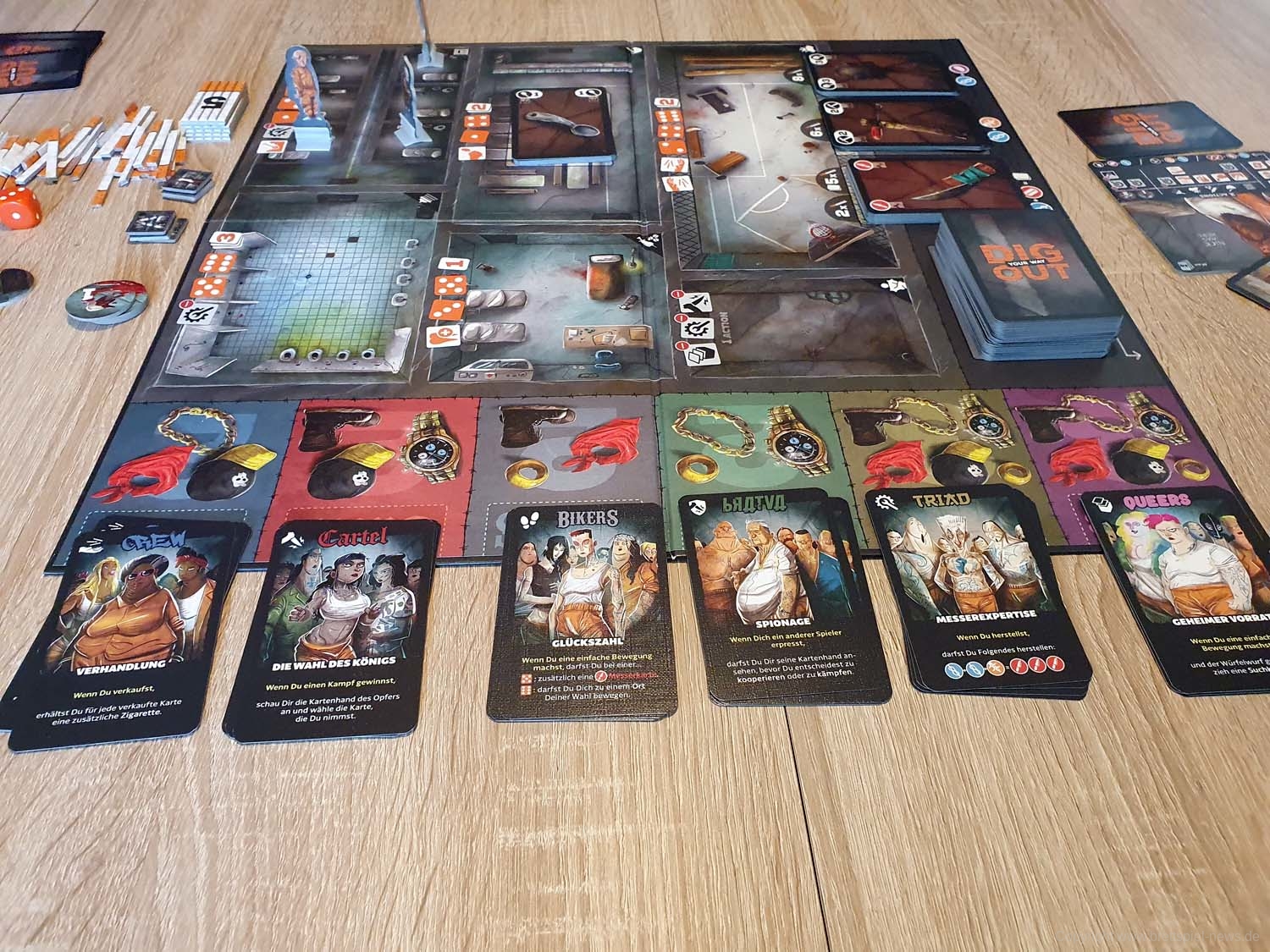 Wenn man sich einen Ausweg sucht, muss man sich ständig darüber im Klaren sein, was andere Spieler auf der Hand haben. So kannst du wissen, wen du erpressen sollst und wer eine Bedrohung für dich ist. Obwohl das Aufheben von Werkzeugen oder Waffen für alle sichtbar ist, gibt es viele Möglichkeiten, um zu verhindern, dass andere Häftlinge zu aufdringlich werden: Aktionskarten, passive Bandenfähigkeiten und vor allem Ihre Hintergrundkarte. Hintergrundkarten sind mächtige One-Shot-Fähigkeiten, die das Spiel verändern können, wenn sie zum richtigen Zeitpunkt verwendet werden. Und das gilt umso mehr, wenn man der entsprechenden Gang angehört.