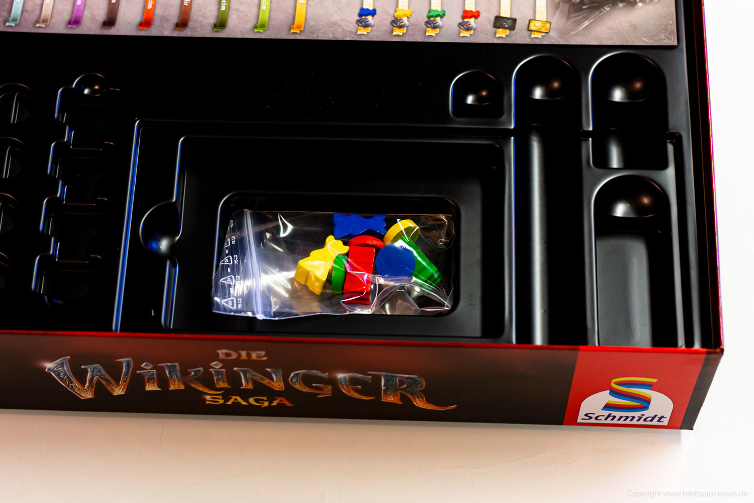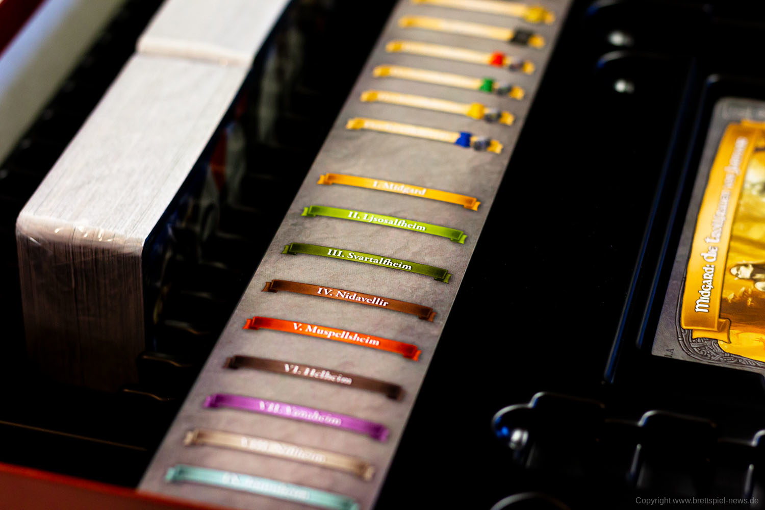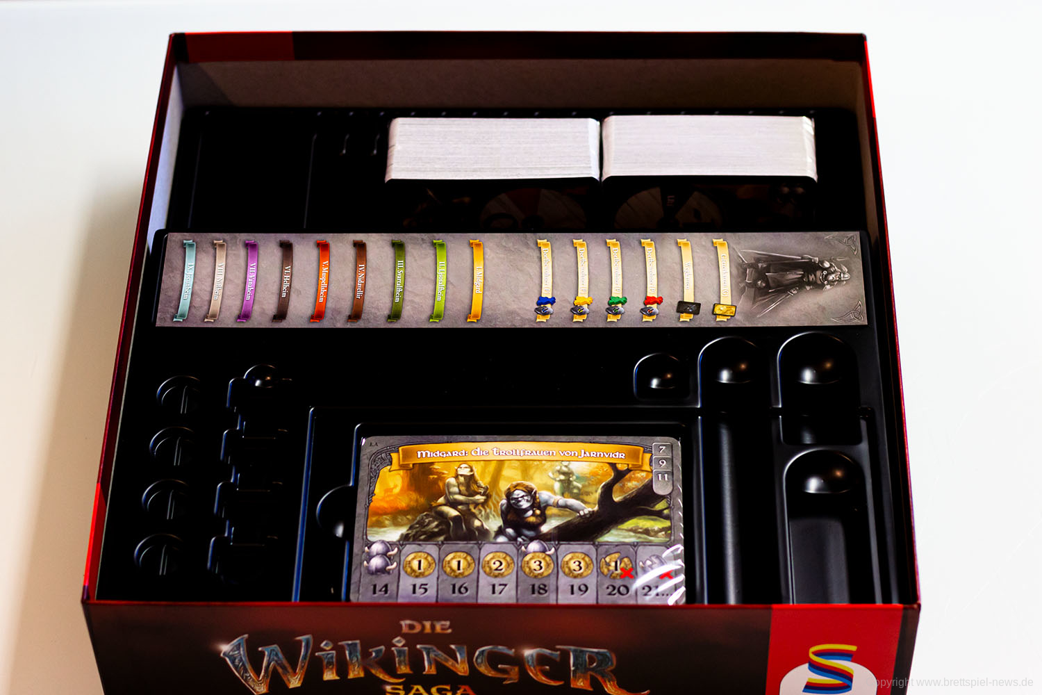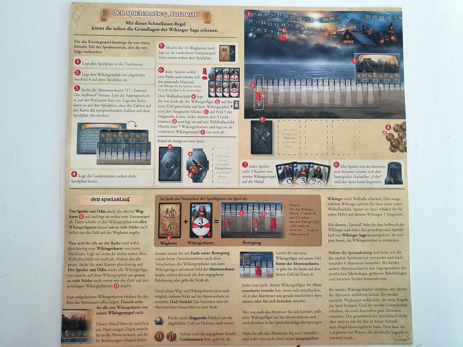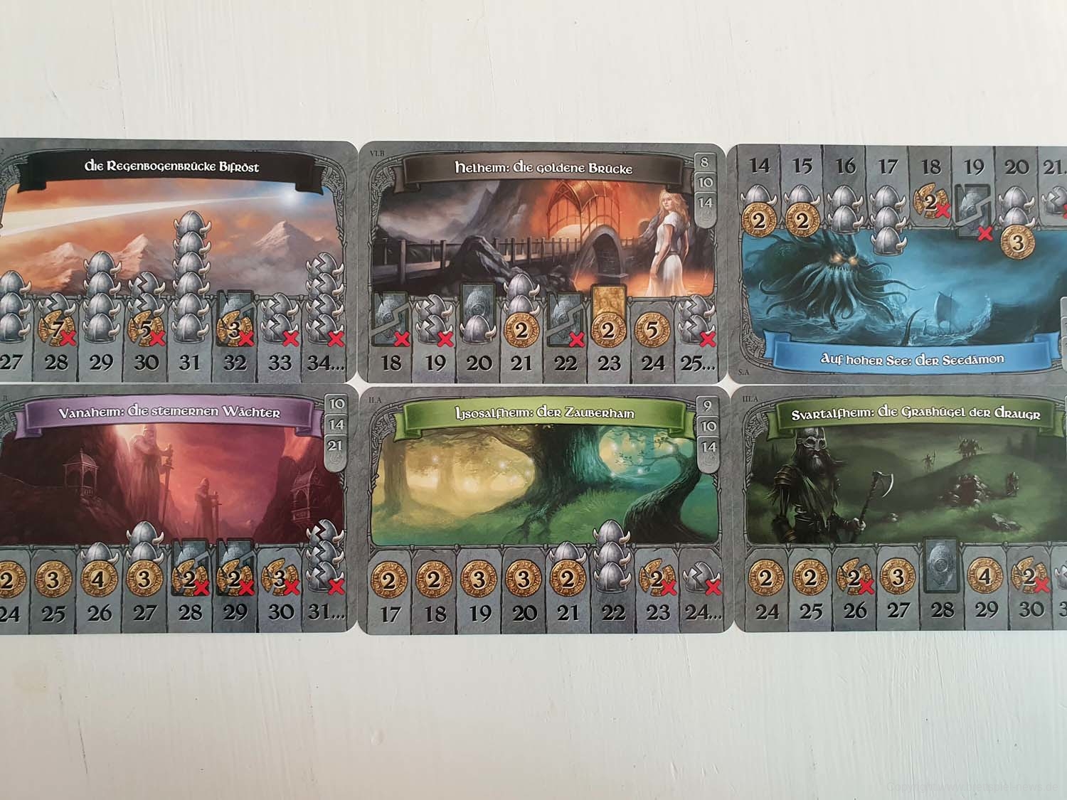 Das durch ein „Tutorial“ kurz und knapp erklärte Grundspiel lässt sich durch zusätzliches Spielmaterial fast beliebig erweitern und ist modular aufgebaut. Zwar werden immer 8 Abenteuer (also Runden) gespielt, diese lassen sich aber aus 35 verschiedenen Abenteuern von Spiel zu Spiel fast beliebig zusammenstellen. Nach und nach kommen neue und anspruchsvollere Regeln ins Spiel, wobei die Spieler durch die Auswahl der Abenteuer den Anspruch des Spiels und auch die Spieldauer selbst bestimmen können. So wird die Reise durch die Welten der Wikinger bei jedem Spiel eine andere sein. Und: Mit jedem Abenteuer erfahren die Spieler mehr über die Sagen der nordischen Mythologie, die von Grafiker Michael Menzel auf mehr als 250 Karten und Spieltafeln mit eindrucksvollen Illustrationen zum Leben erweckt wurde.