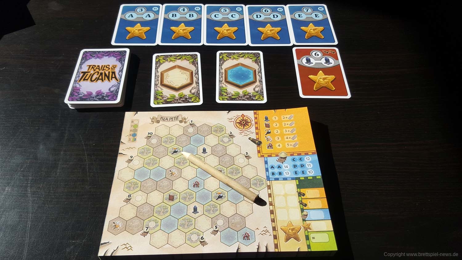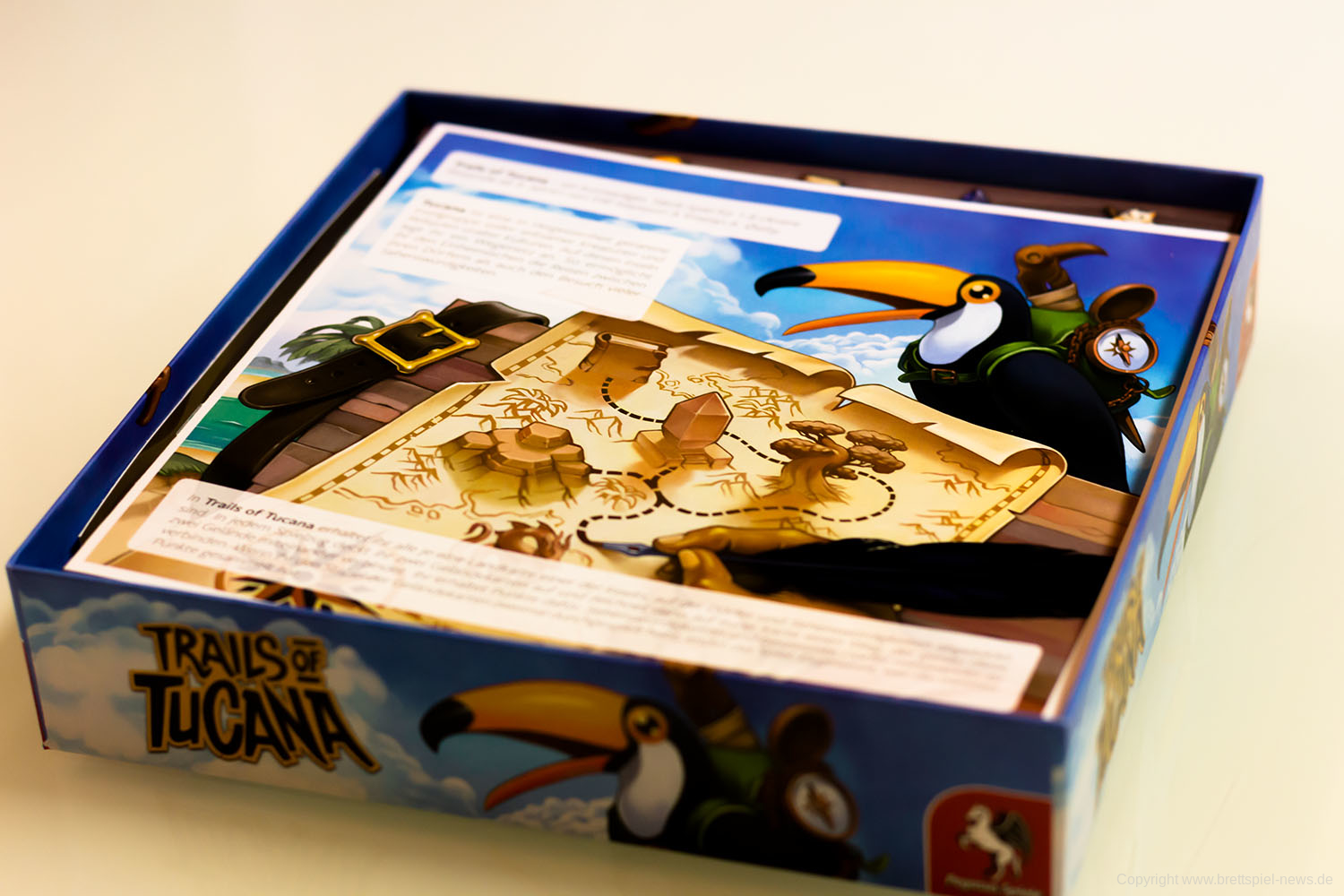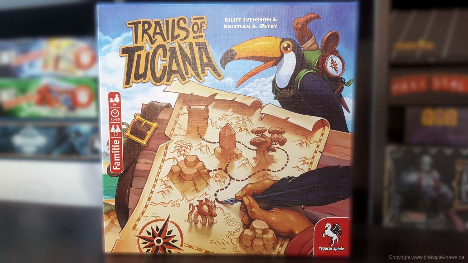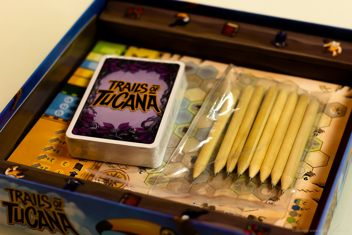 Bei uns ist die Pegasus Spiele Neuheit TRAILS OF TUCANA eingetroffen und wir haben es gleich vor die Kamera gezerrt um erste Bilder zeigen zu können. Das Spielmaterial und auch die Innenverpackung machen einen guten Eindruck. Der Block wird gut in der Packung gehalten, Stifte liegen bei, einige Karten und die Anleitung. Das Familienspiel richtet sich an 1-5 Spieler ab 8 Jahren. Eine Partie beansprucht gerade einmal 15-30 Minuten Spielzeit. Der UVP liegt bei 19,95 €.