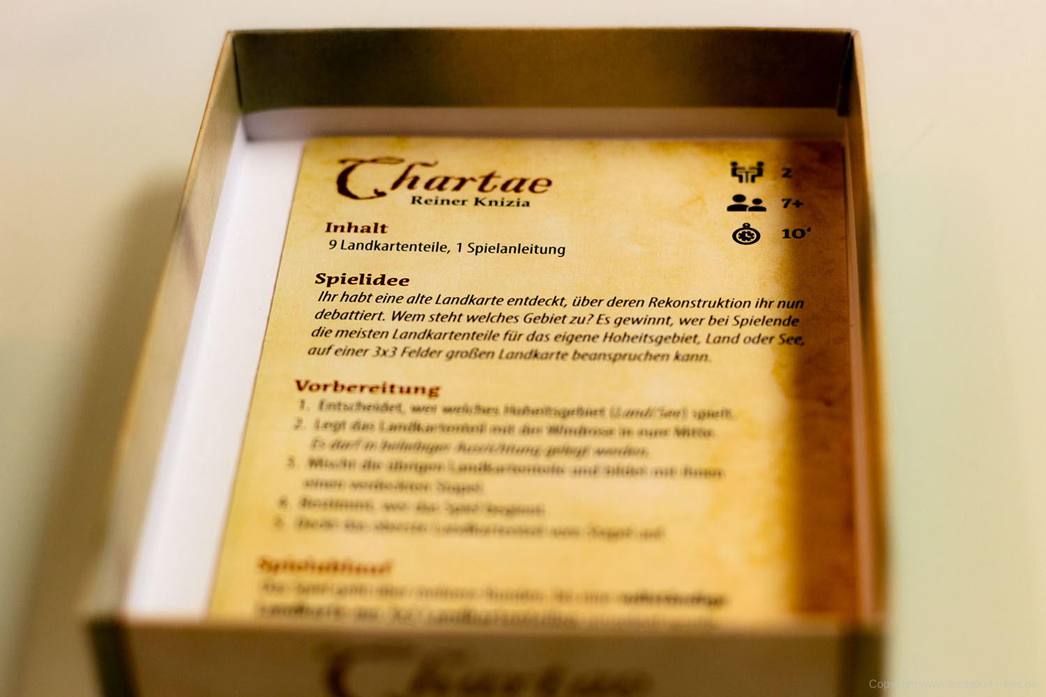 Wir haben die Neuheit Chatae vom Autor Dr. Reiner Knizia vom Verlag erhalten und zeigen erste Bilder vom Spielmaterial. Das ist im Umfang minimalistisch, aber sehr stimmungsvoll gestaltet. Die Neuheit erscheint bei Board Game Circus, die in einer kleinen Schachtel zum kleinen Preis daherkommt. Chartae ist ein reines Zwei-Spieler Spiel dass in 10 Minuten gespielt ist.