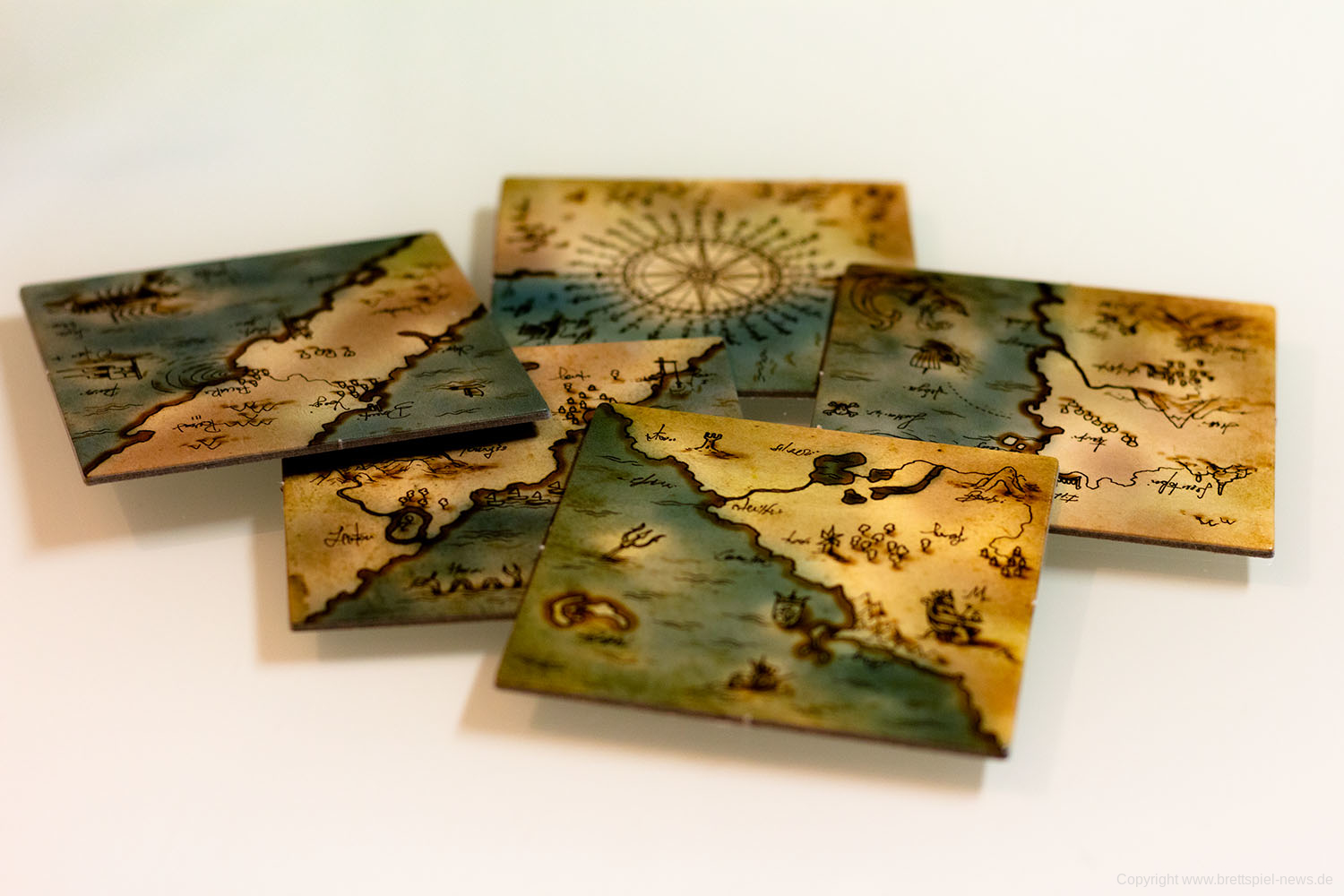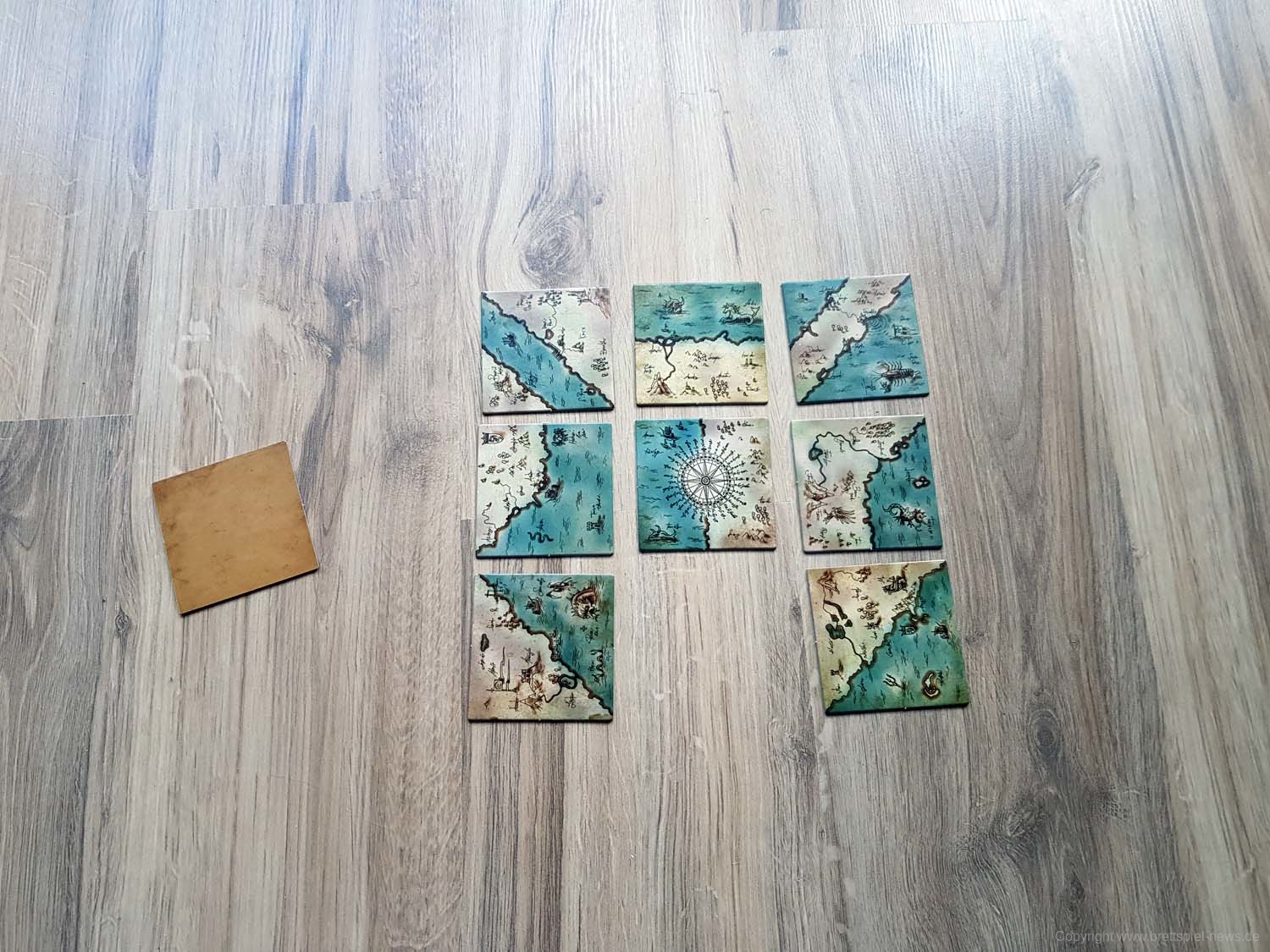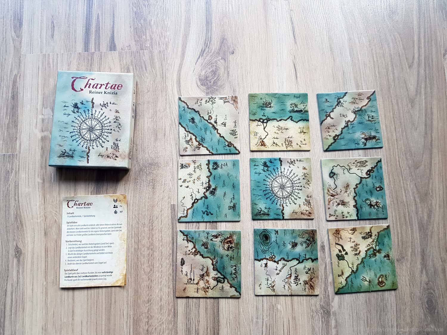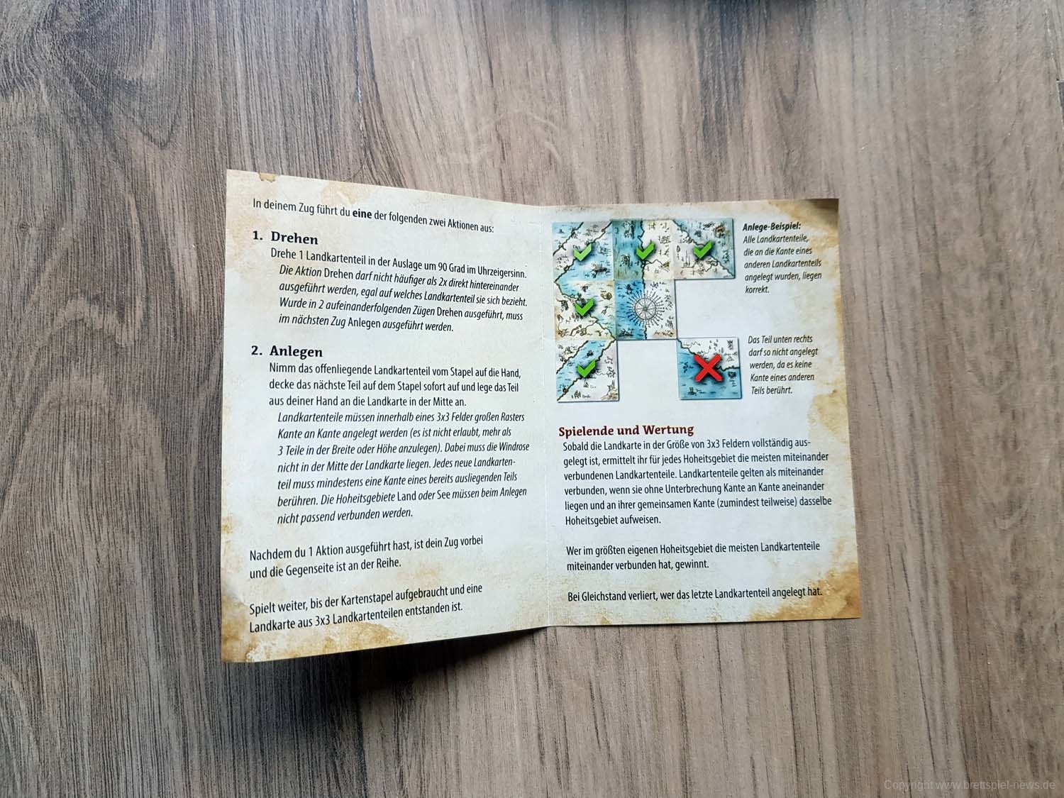Ihr habt eine alte Landkarte entdeckt, über deren Rekonstruktion ihr nun debattiert. Wem steht welches Gebiet zu? Jedes der 9 Landkartenteile hat zwei Gebiete, die jeweils von einer Person kontrolliert werden. In jedem Zug müsst ihr neu entschieden, ob ihr ein bereits ausliegendes Landkartenteil drehen möchtet, oder ob ihr ein weiteres dazu legt. Es gewinnt, wer bei Spielende die meisten Landkartenteile für das eigene Hoheitsgebiet, Land oder See, auf einer 3x3 Felder großen Landkarte beanspruchen kann.