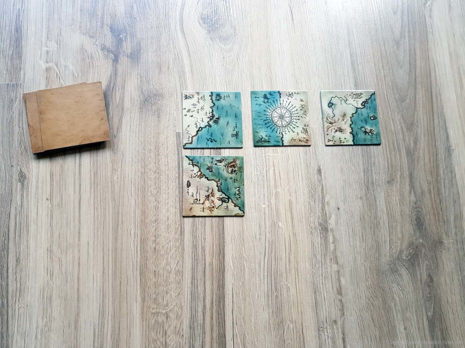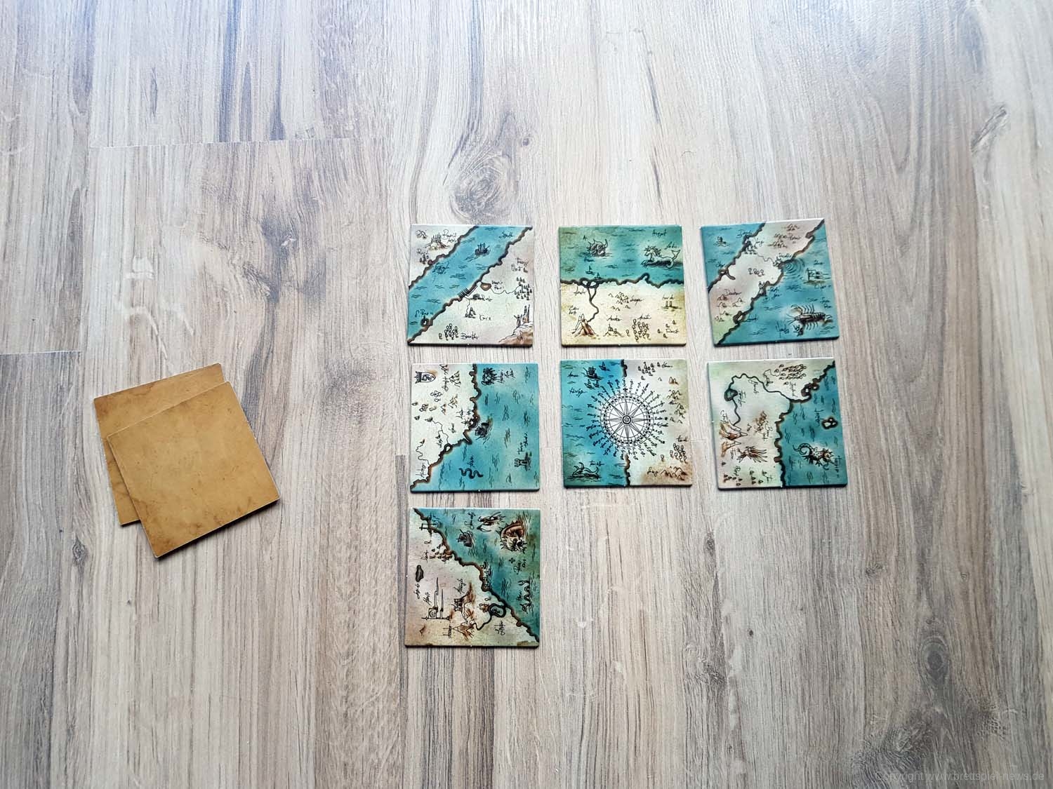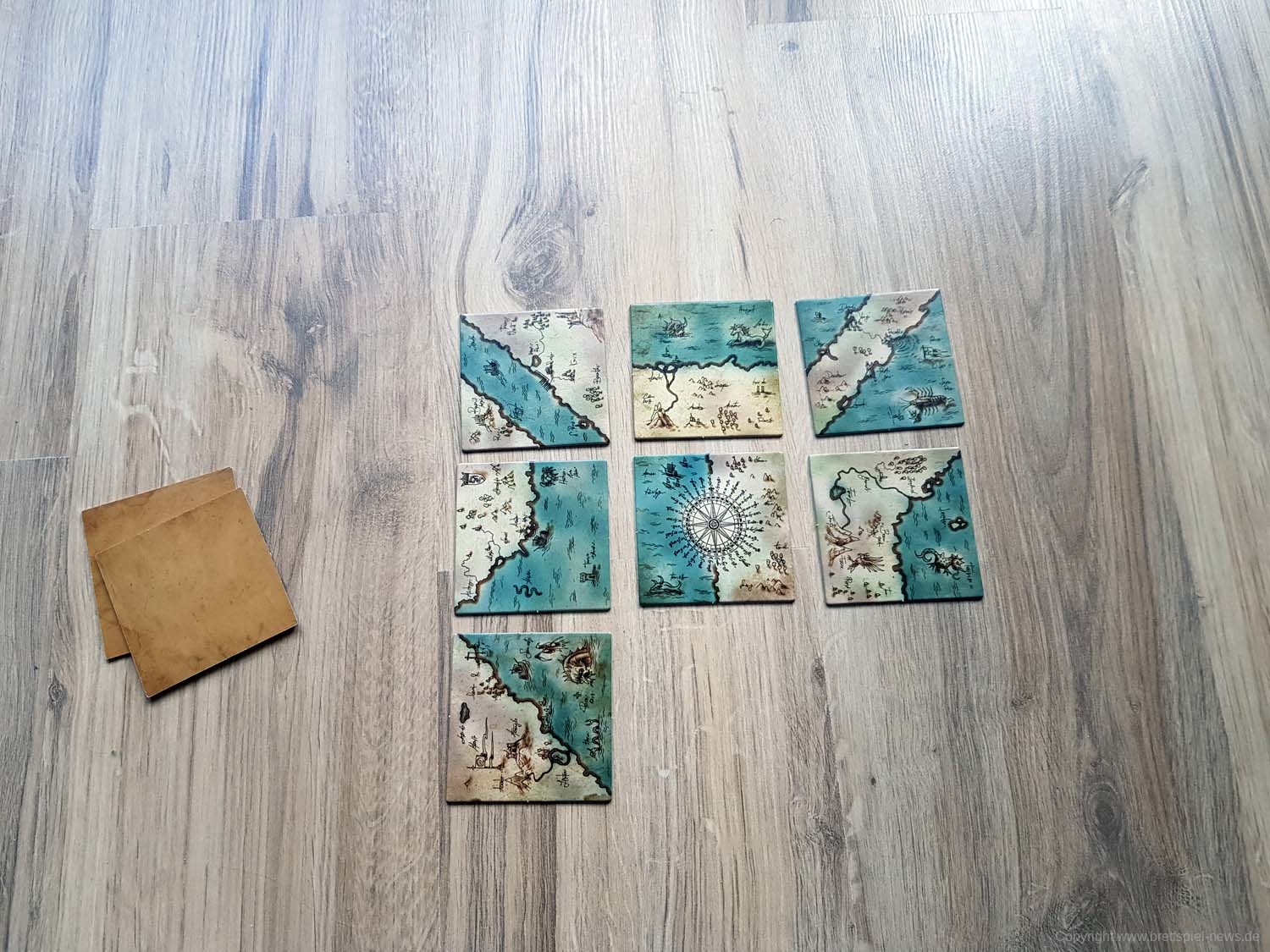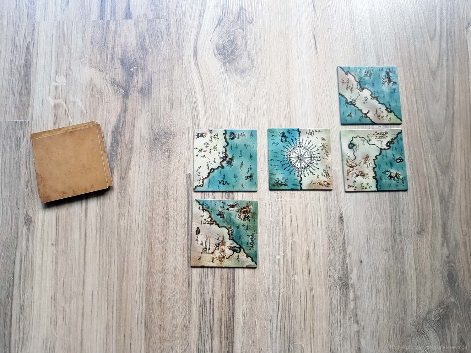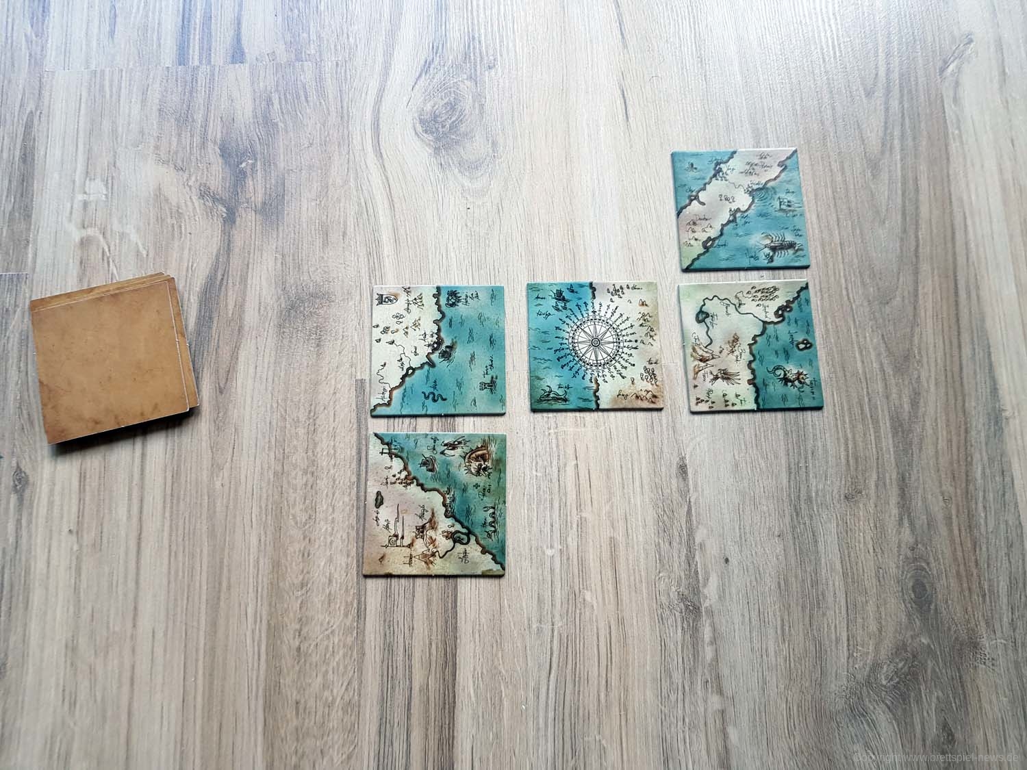 Ihr habt eine alte Landkarte entdeckt, über deren Rekonstruktion ihr nun debattiert. Wem steht welches Gebiet zu? Jedes der 9 Landkartenteile hat zwei Gebiete, die jeweils von einer Person kontrolliert werden. In jedem Zug müsst ihr neu entschieden, ob ihr ein bereits ausliegendes Landkartenteil drehen möchtet, oder ob ihr ein weiteres dazu legt. Es gewinnt, wer bei Spielende die meisten Landkartenteile für das eigene Hoheitsgebiet, Land oder See, auf einer 3x3 Felder großen Landkarte beanspruchen kann.