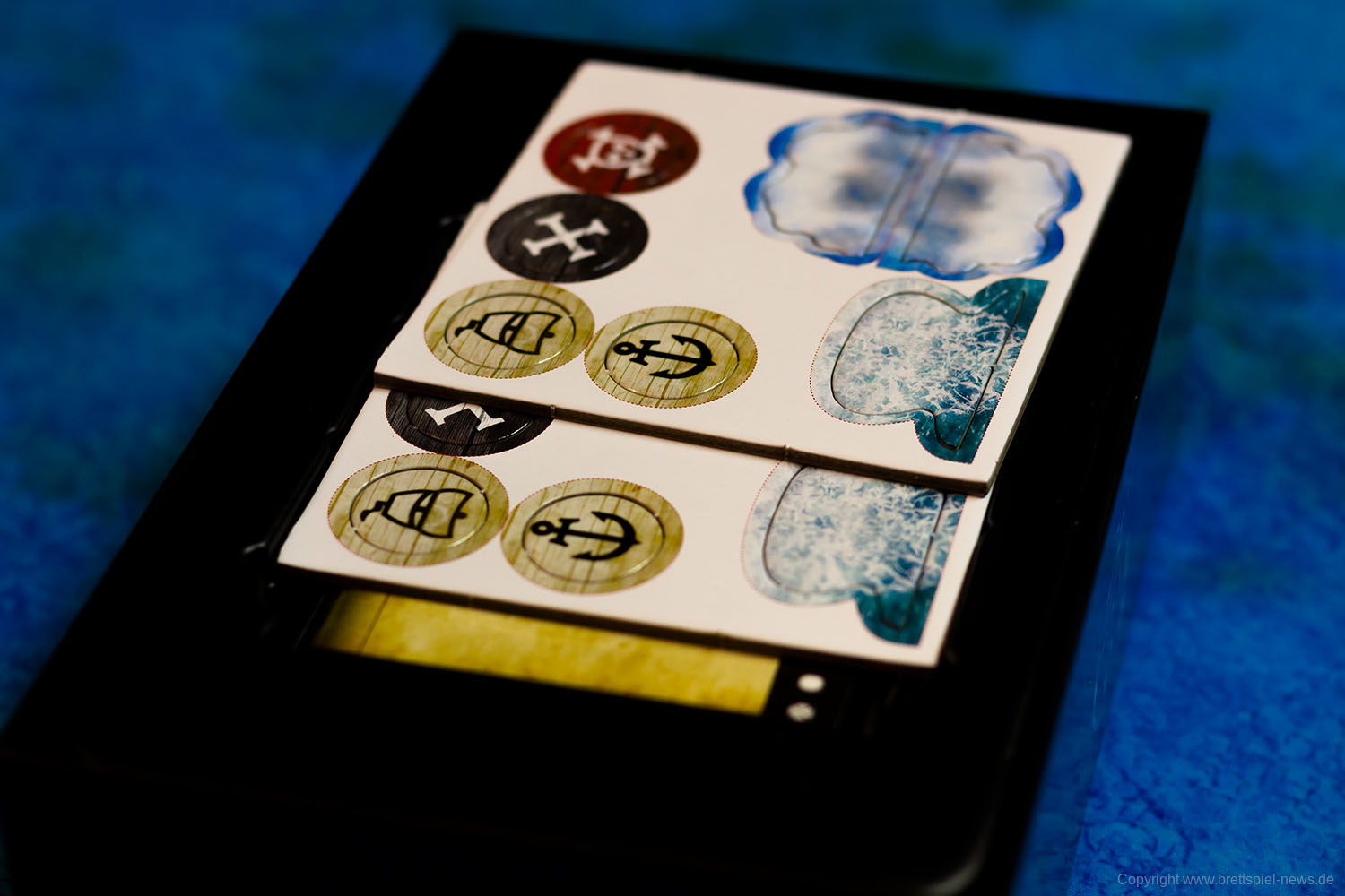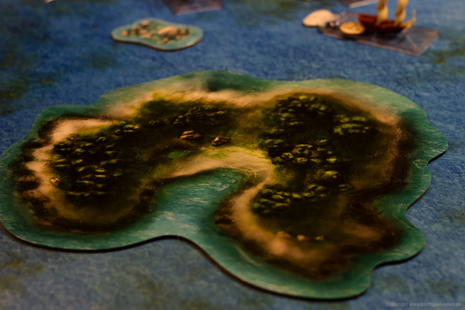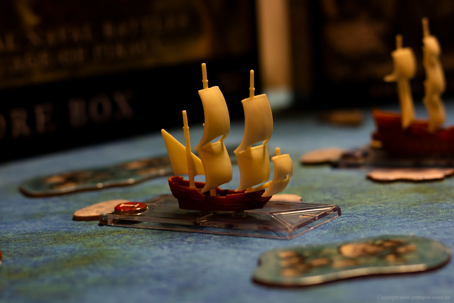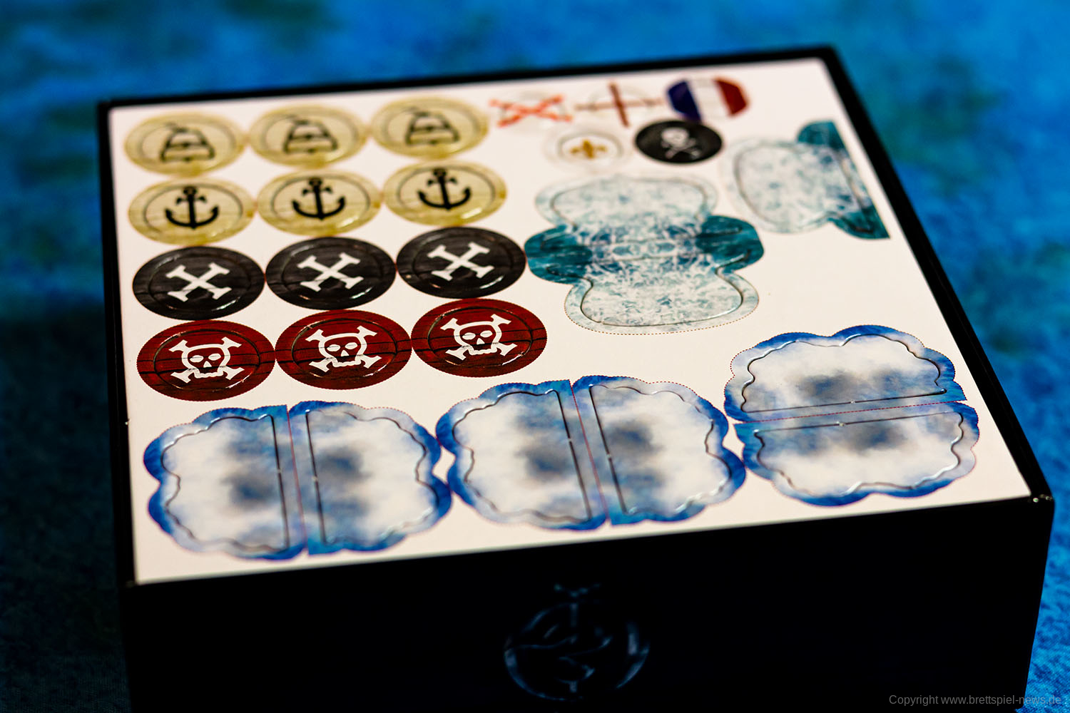Im Grundspiel ist auch ein auf Papier gedruckter Spielplan enthalten. Für die Fotos wurde jedoch eine Spielmatte verwendet, die nicht zum Spielumfang gehört. Die Inseln und Felsen sind vom Spiel selber und können verwendet werden, um die Navigation schwerer zu machen.