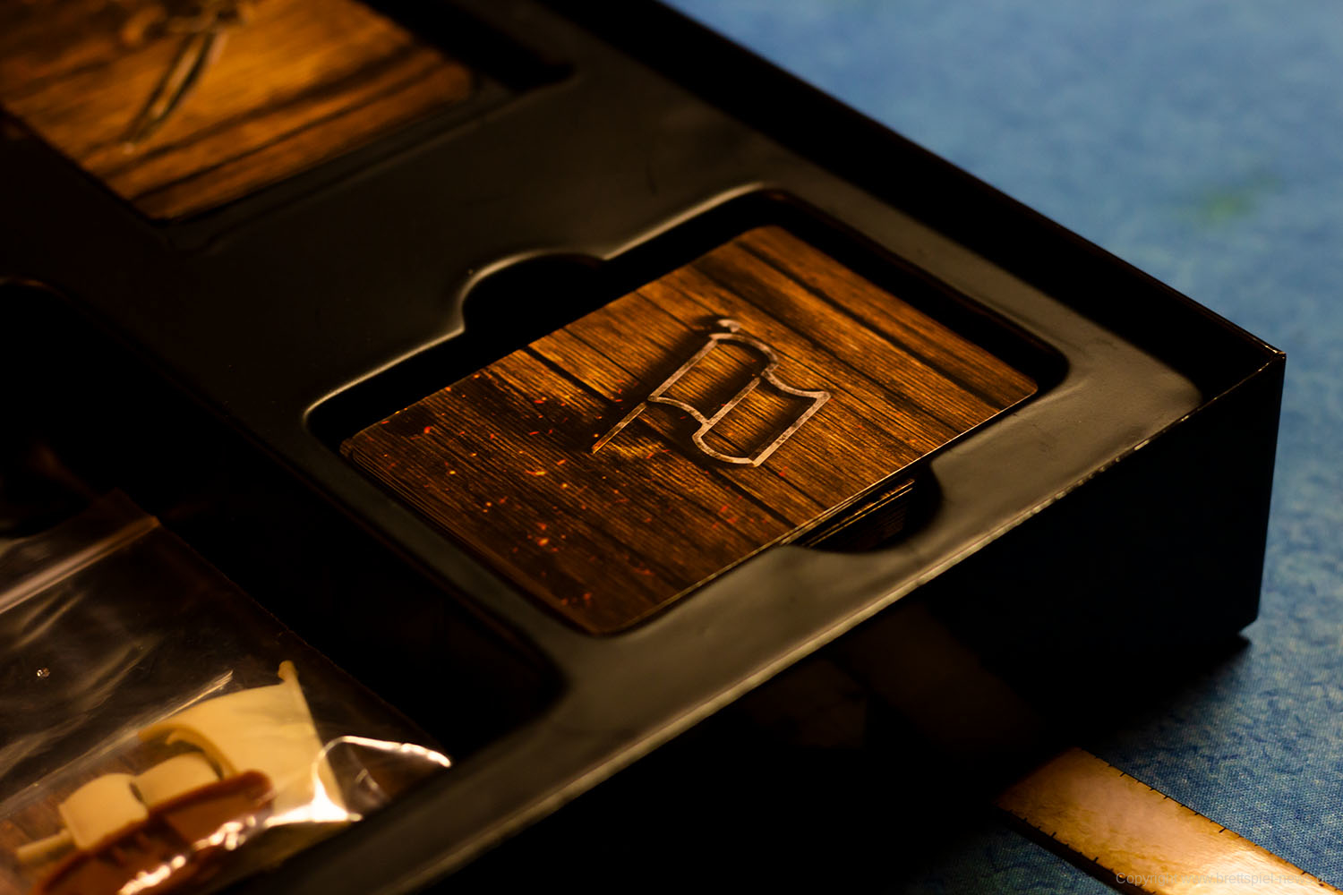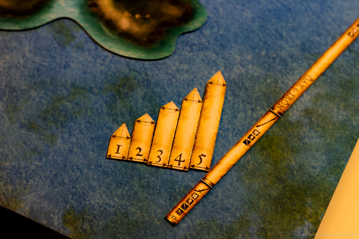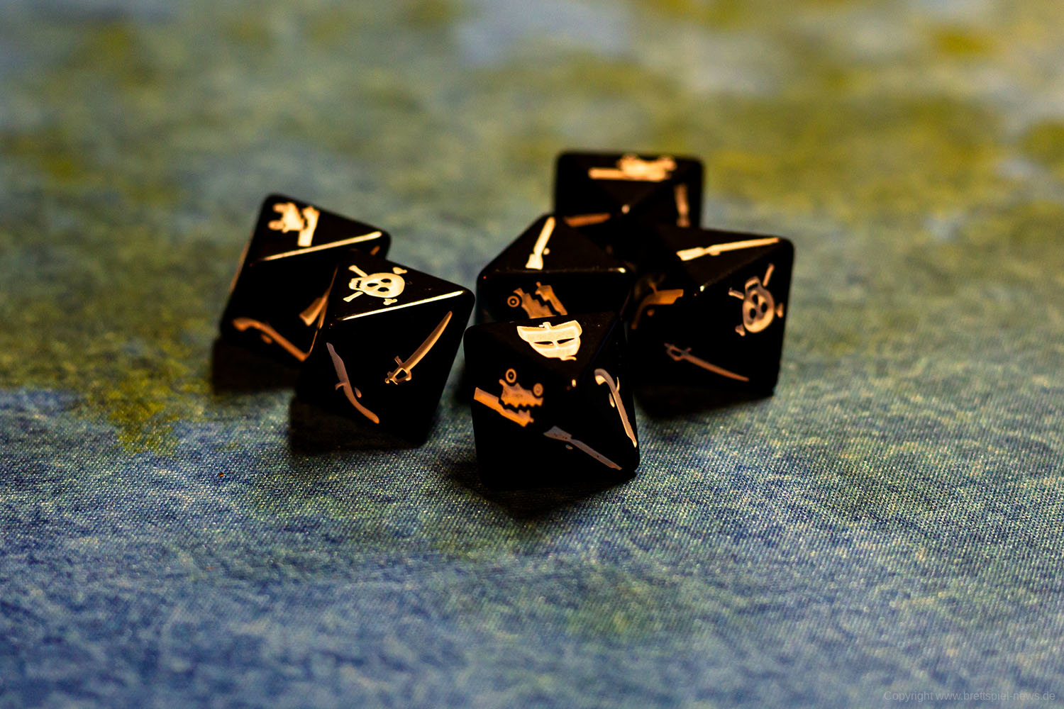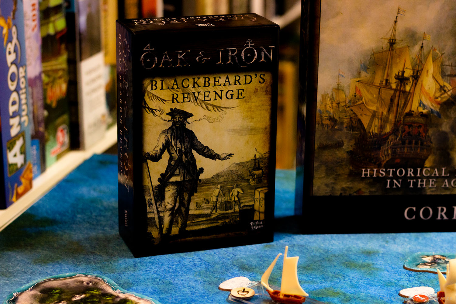 Im Grundspiel ist auch ein auf Papier gedruckter Spielplan enthalten. Für die Fotos wurde jedoch eine Spielmatte verwendet, die nicht zum Spielumfang gehört. Die Inseln und Felsen sind vom Spiel selber und können verwendet werden, um die Navigation schwerer zu machen.