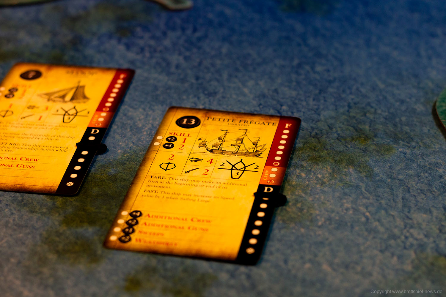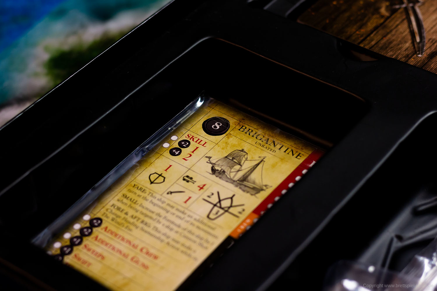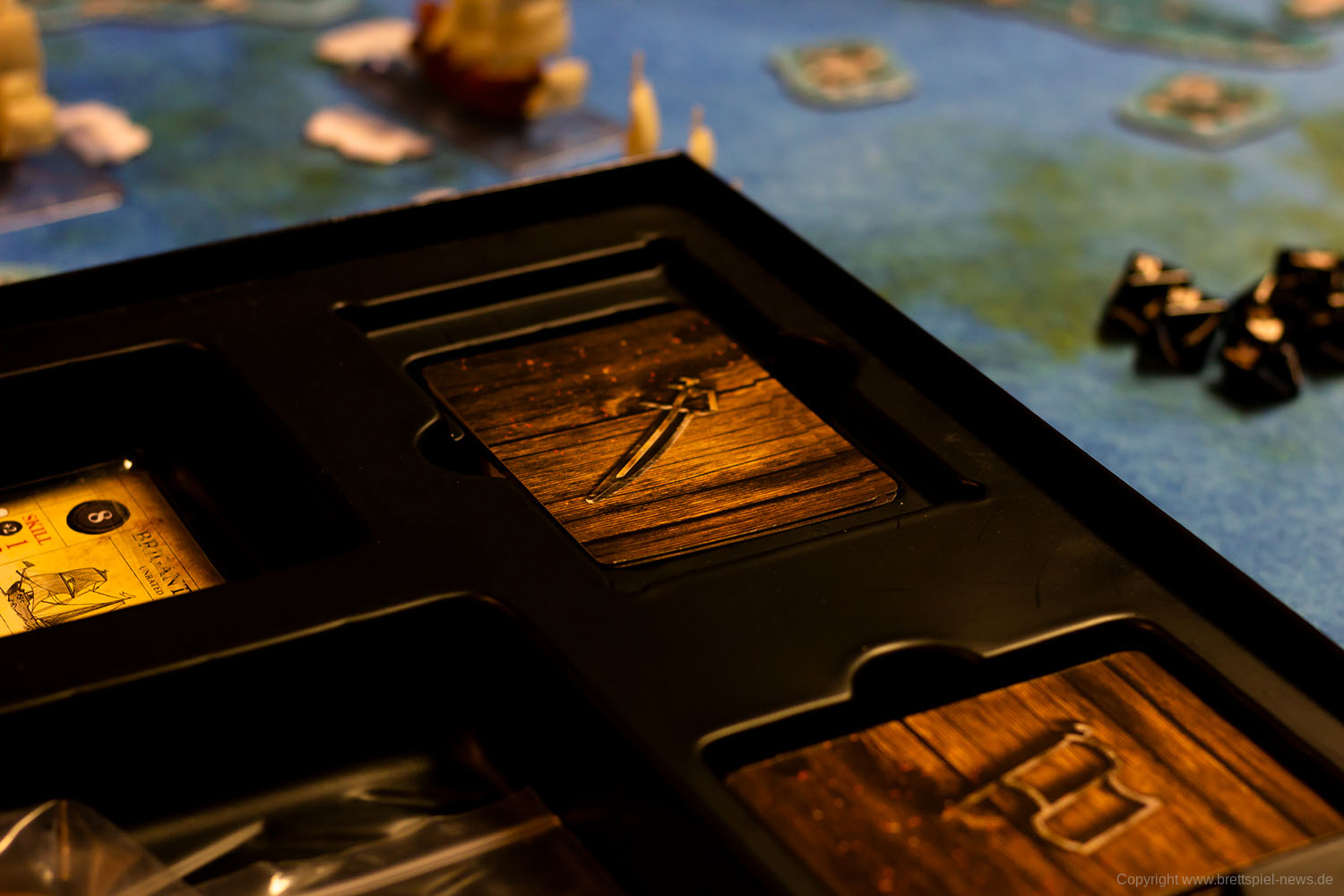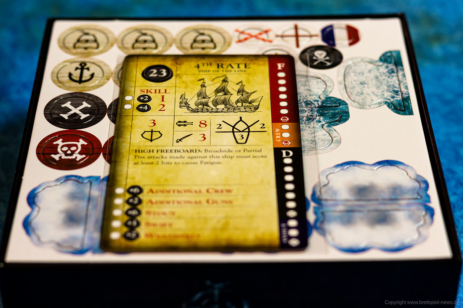 Das Spielmaterial macht einen guten Eindruck, kann aber nicht mit einem Star Wars: X-Wing mithalten, da die Miniaturen nicht bemalt sind. Verglichen zu anderen Tabletop Spielen ist es aber eher die Regel, dass Spiele mit unbemalten Miniaturen ausgeliefert werden. Immerhin sind der Rumpf und die Segel bereits zweifarbig. Bei unserem Spiel fehlte eine Karte, da für die Startpartie eigentlich zwei Admirale mit der Stärke 0 eingesetzt werden sollen. Ansonsten machte alles einen sehr guten Eindruck.