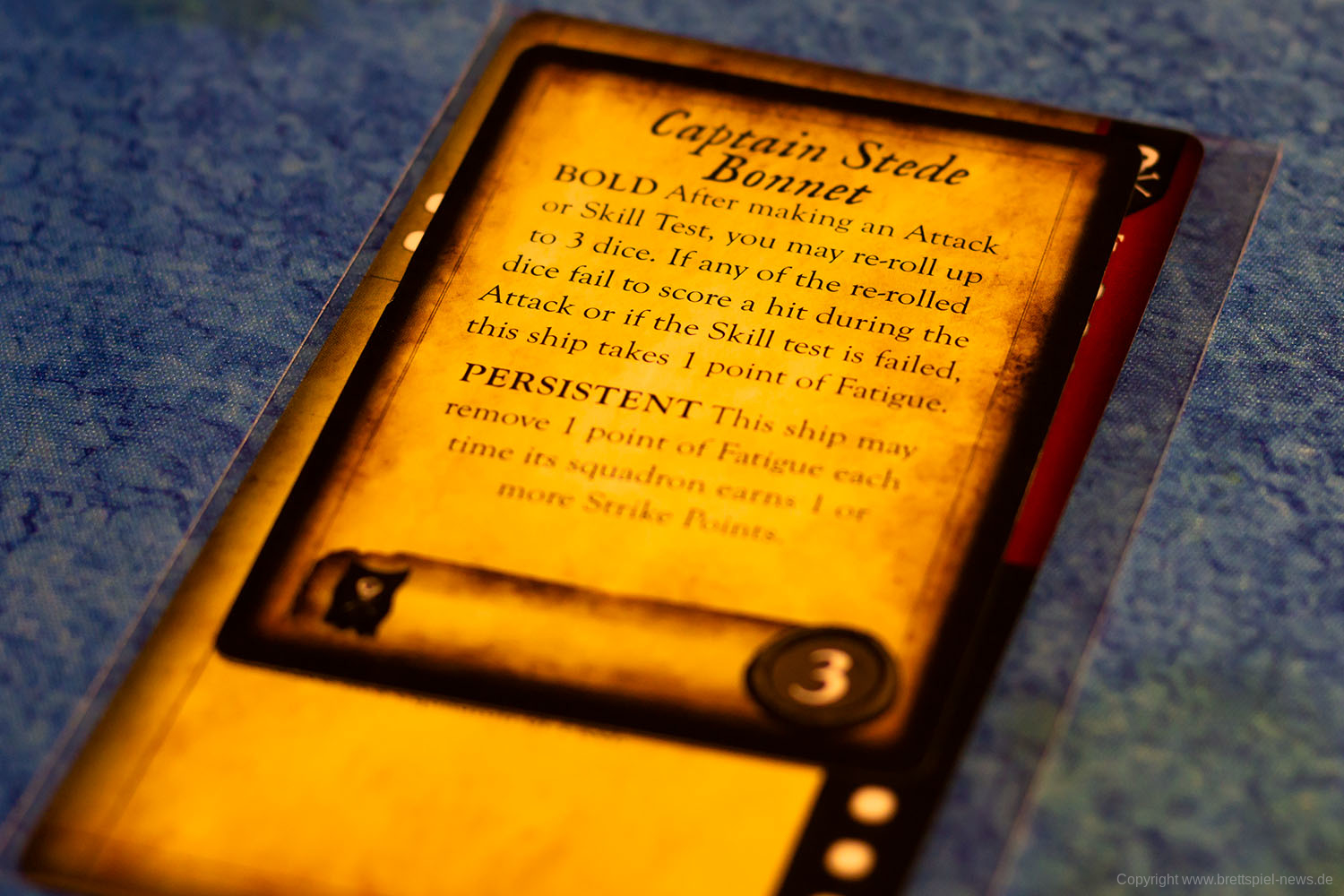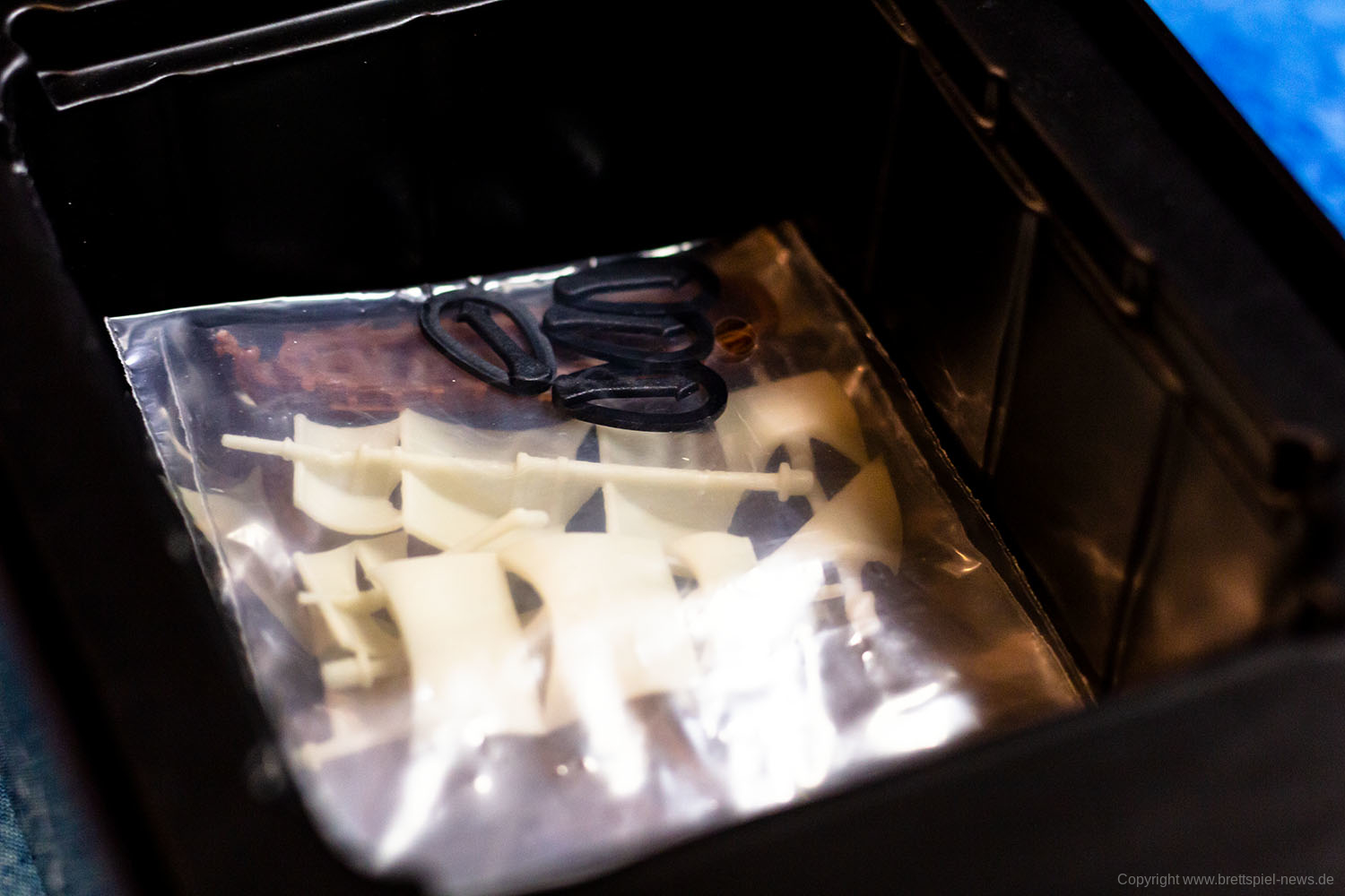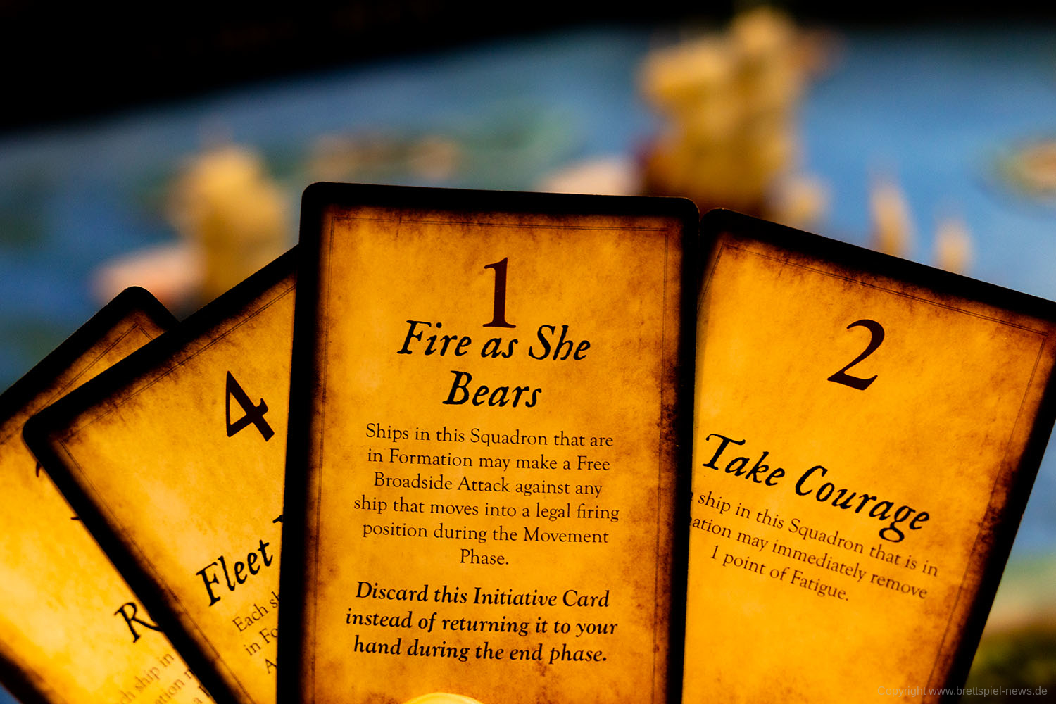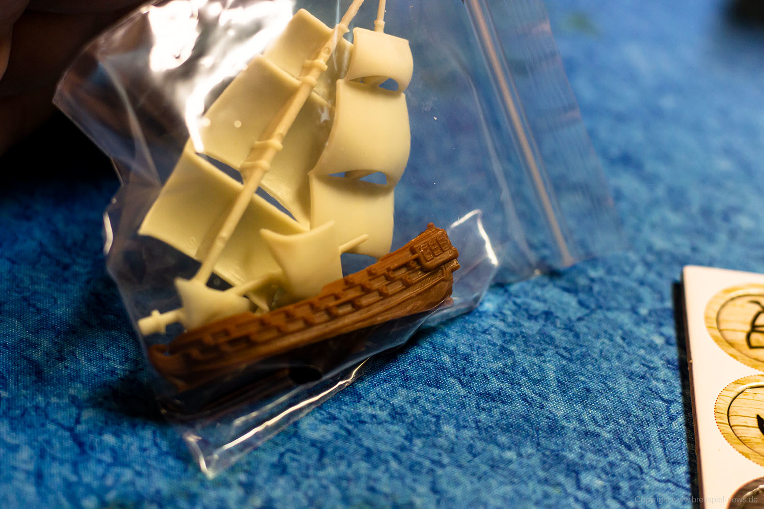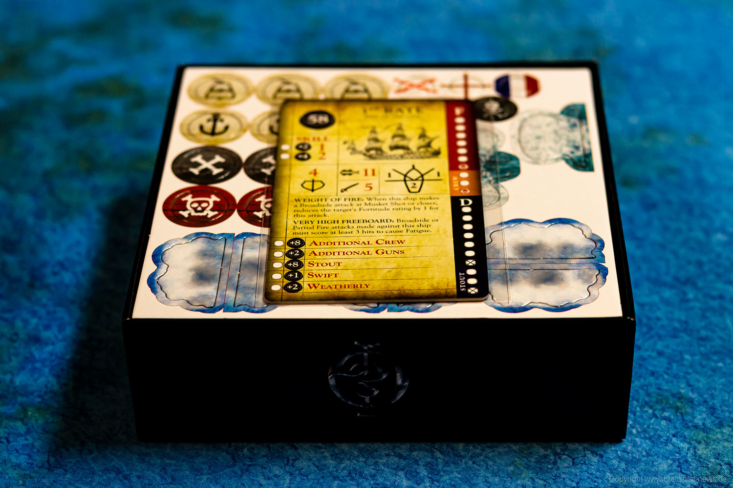 Das Spielmaterial macht einen guten Eindruck, kann aber nicht mit einem Star Wars: X-Wing mithalten, da die Miniaturen nicht bemalt sind. Verglichen zu anderen Tabletop Spielen ist es aber eher die Regel, dass Spiele mit unbemalten Miniaturen ausgeliefert werden. Immerhin sind der Rumpf und die Segel bereits zweifarbig. Bei unserem Spiel fehlte eine Karte, da für die Startpartie eigentlich zwei Admirale mit der Stärke 0 eingesetzt werden sollen. Ansonsten machte alles einen sehr guten Eindruck.
