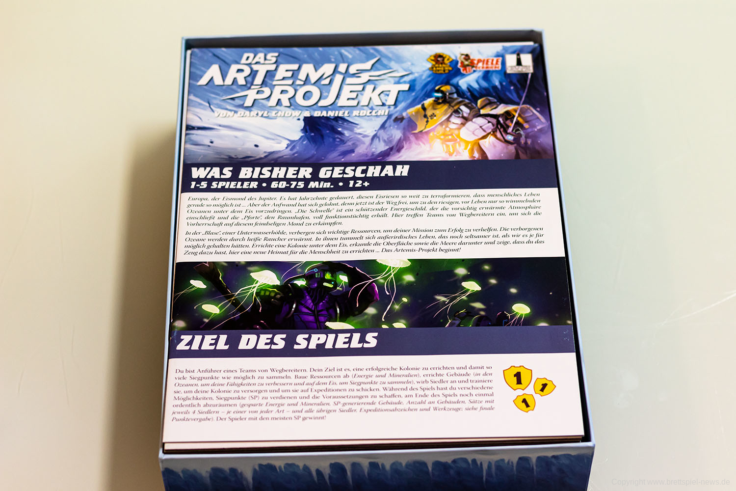Mittlerweile ist die deutsche Version vom Spiel „Das Artemis Projekt“ bei GRIMSPIRE erschienen. Es ist für knapp 55 € zu haben und bietet dafür einiges an Spielmaterial. Das Spiel ist für 1-5 Spieler ab 12 Jahren. Eine Partie dauert 60-75 Minuten. Es hat ein sehr hübsches Design und interessantes Setting. Zu kaufen gibt es das Spiel in der Spiele-Offensive oder als englische Version bei Amazon.