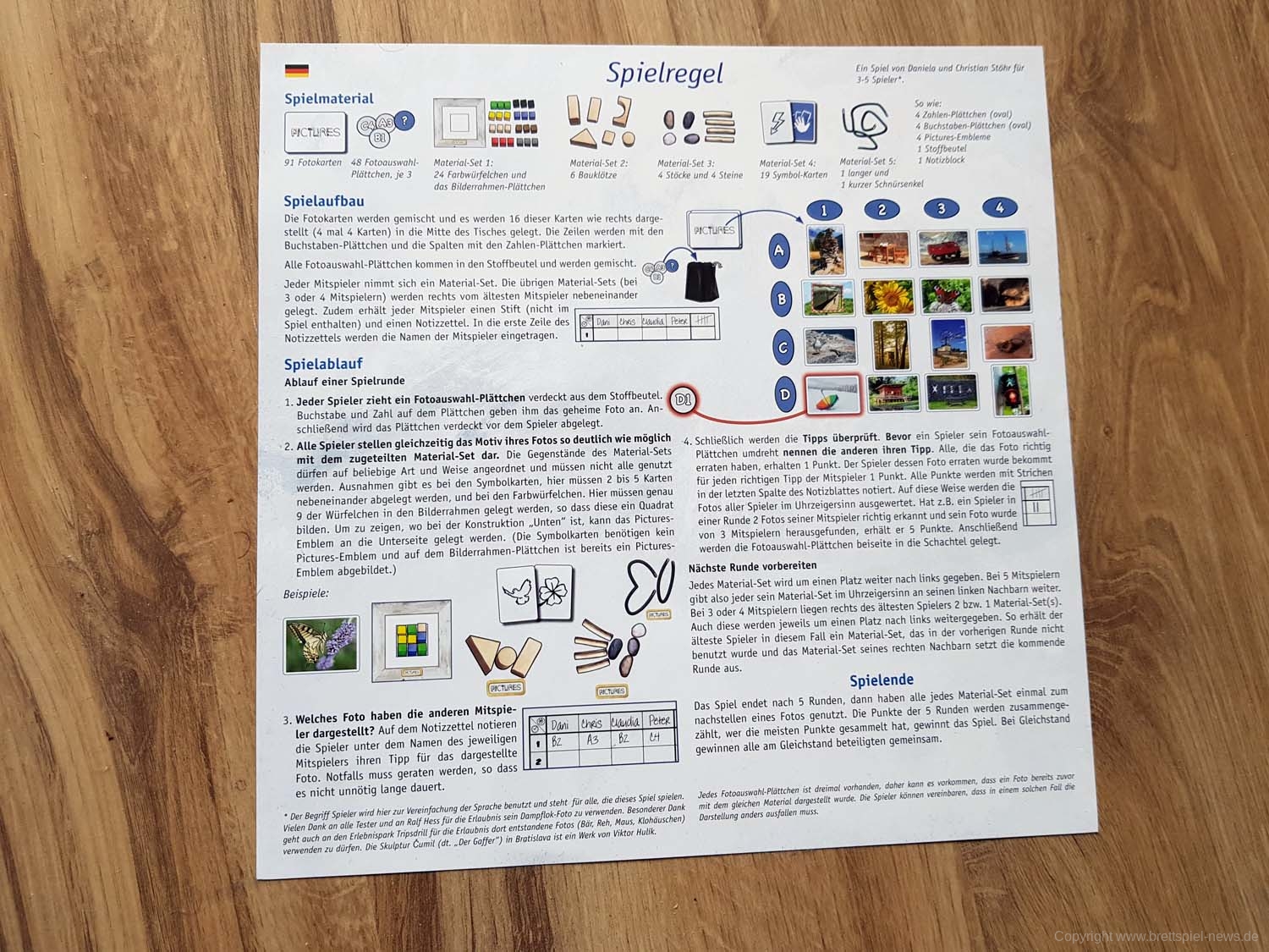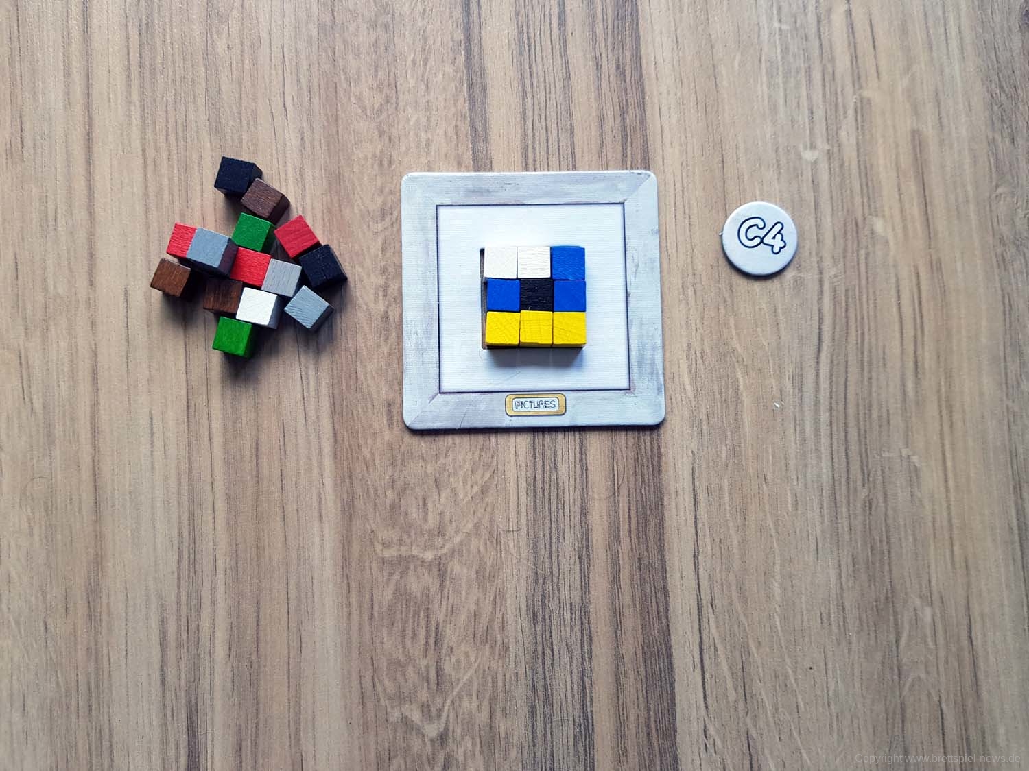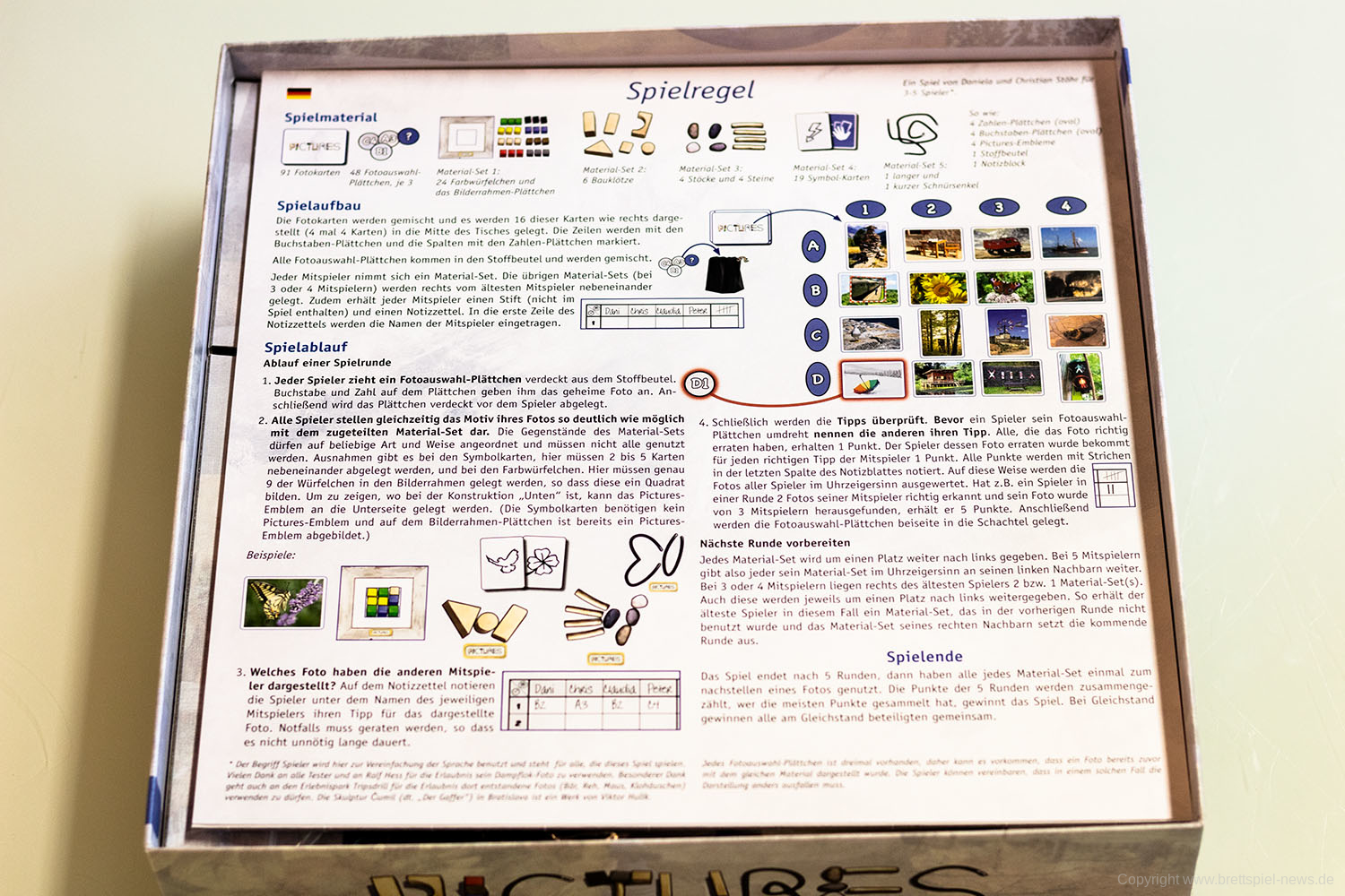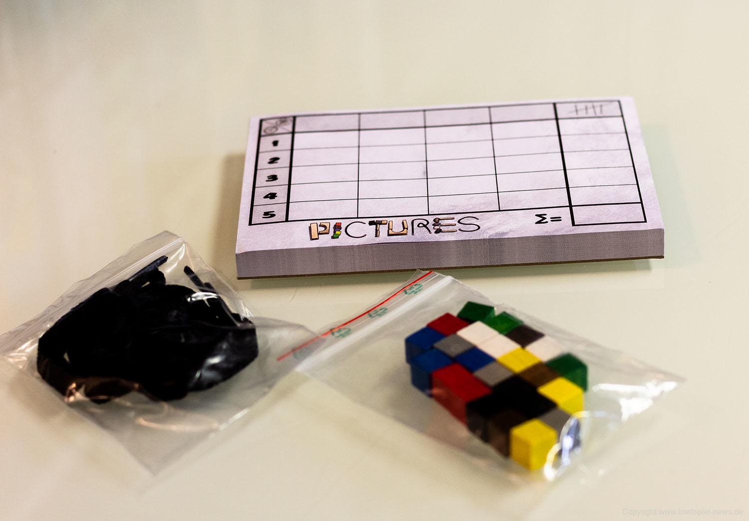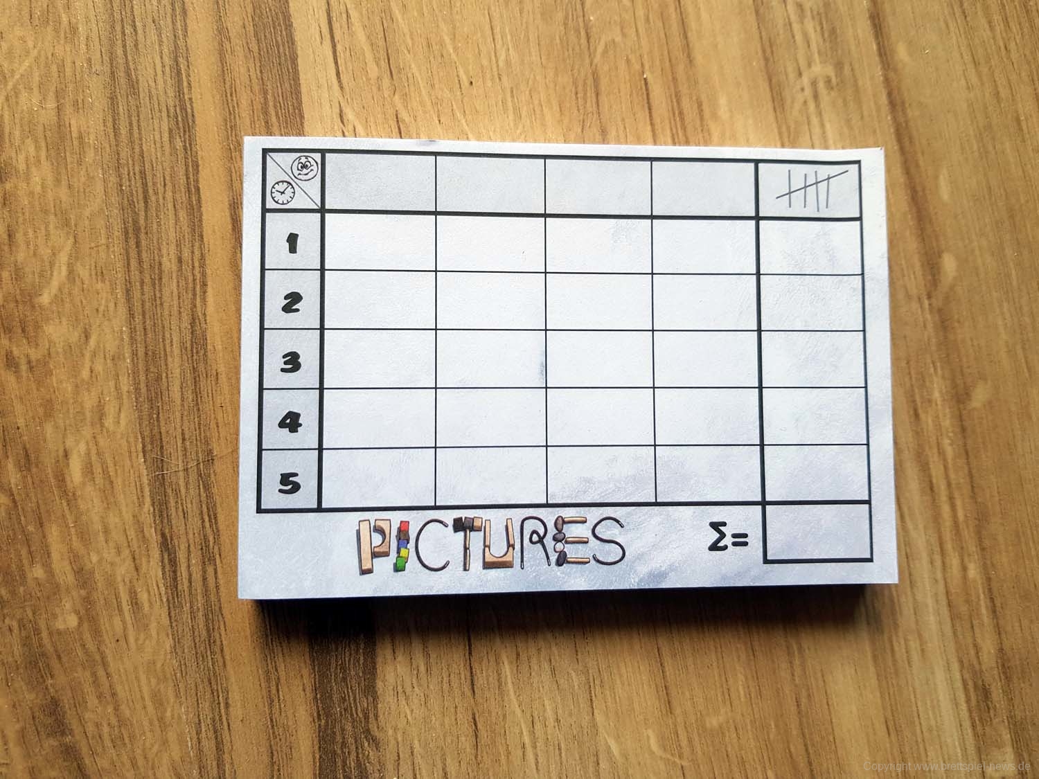 Pictures ist ein kurzweiliges Familienspiel mit viel Spielspaß und sehr einfachen Regeln. Baut mit eurem Spielmaterial, entweder Bauklötze, farbige Würfelchen, Schnürsenkel, Steine und Stöcke oder Symbolkarten, eines der Fotos möglichst treffend nach und rätselt, was eure Mitspieler so gebaut haben: