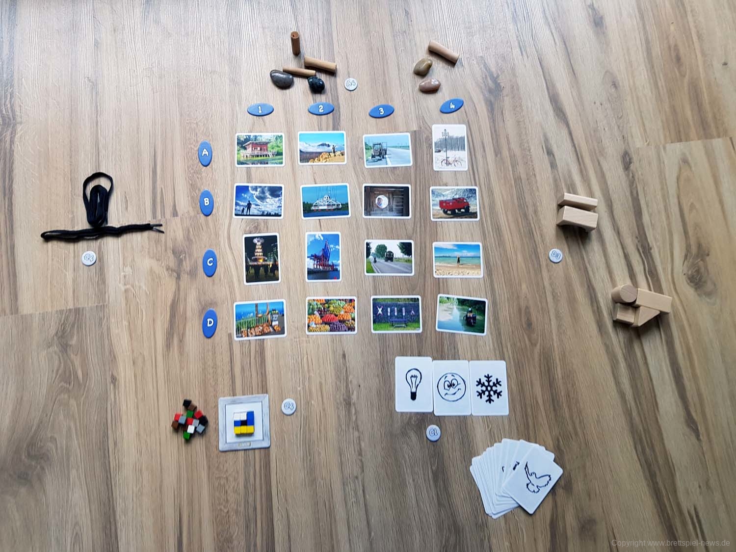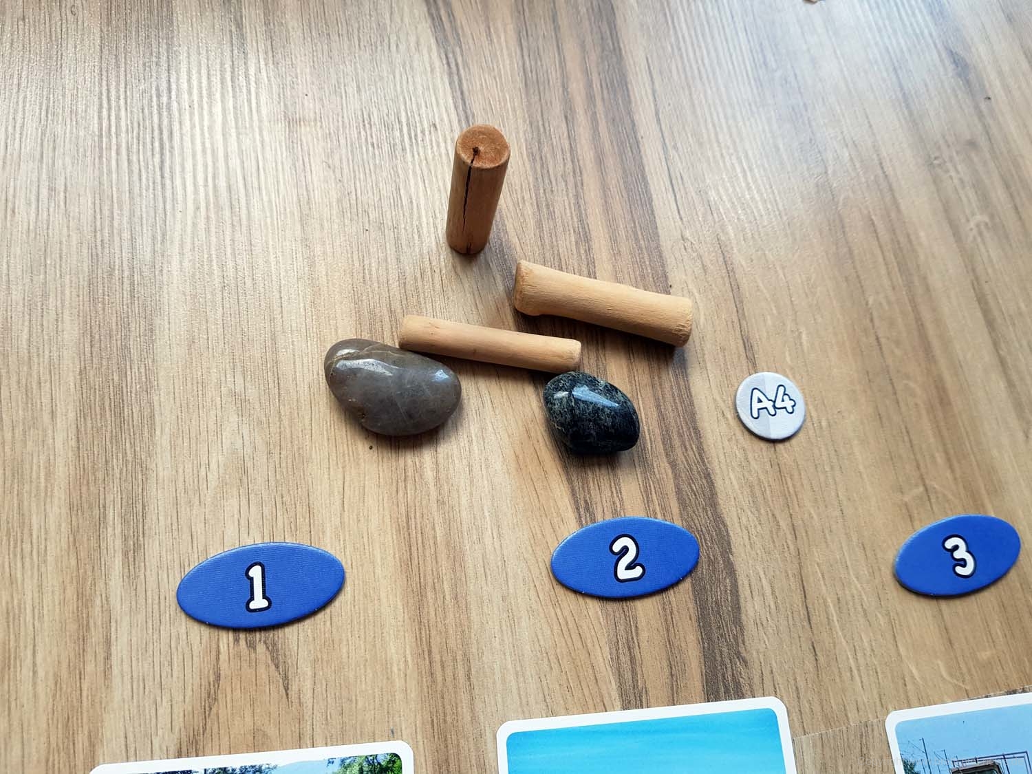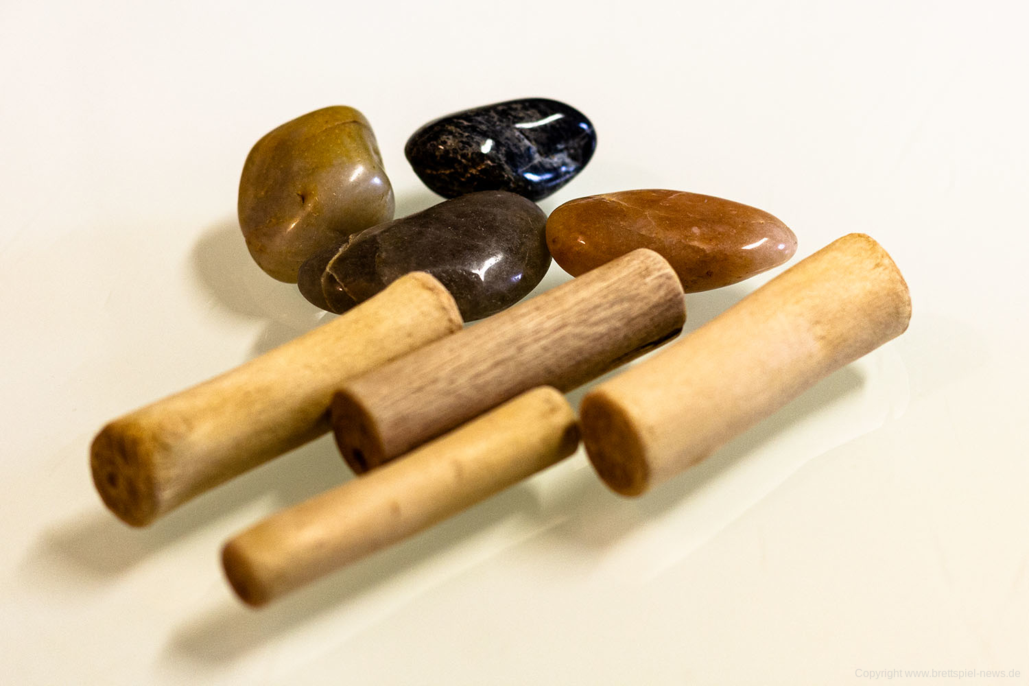 Dieses besteht zum Teil aus Holzteilen und polierten Steinen. Das alles hat eine ausgesprochen gute Haptik und kann sehr überraschen, denn solches Spielmaterial haben wir noch nie in einer Box gefunden. Ansonsten sind zahlreiche Karten mit bunten Motiven und einige Pappmarker enthalten. Einziger negativer Punkt bei der ersten Sichtung des Spielmaterials: die Box hätte auch kleiner ausgeliefert werden können.