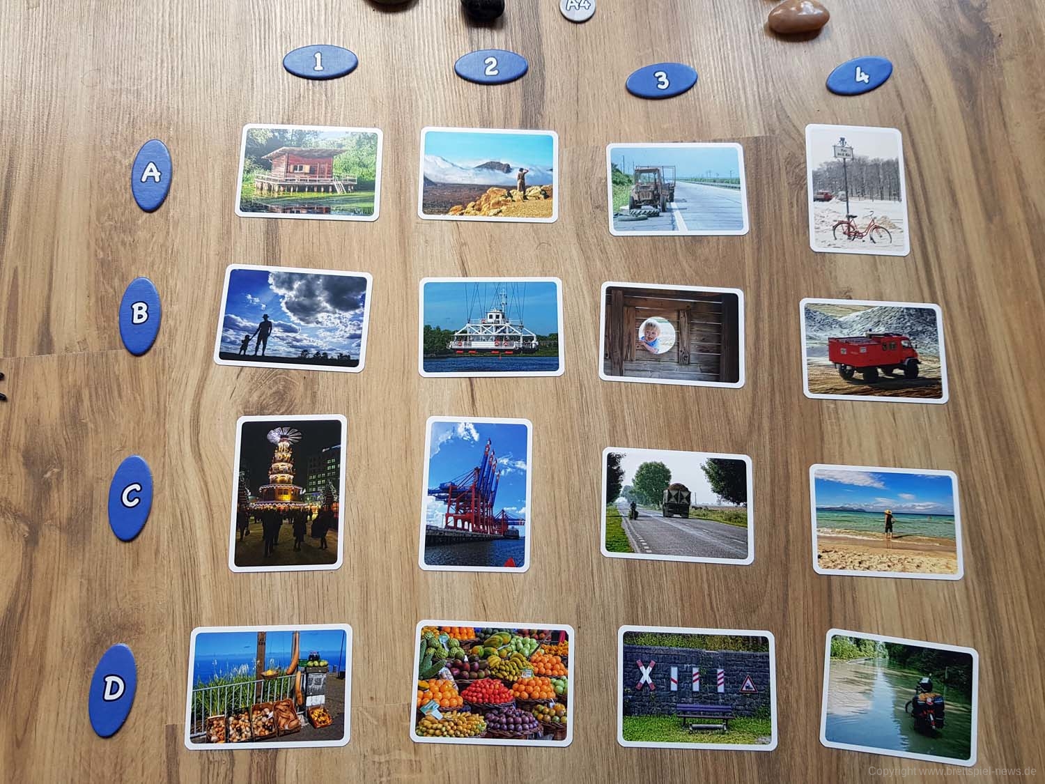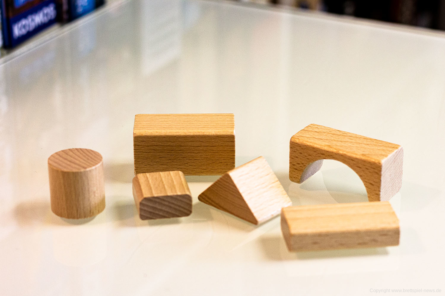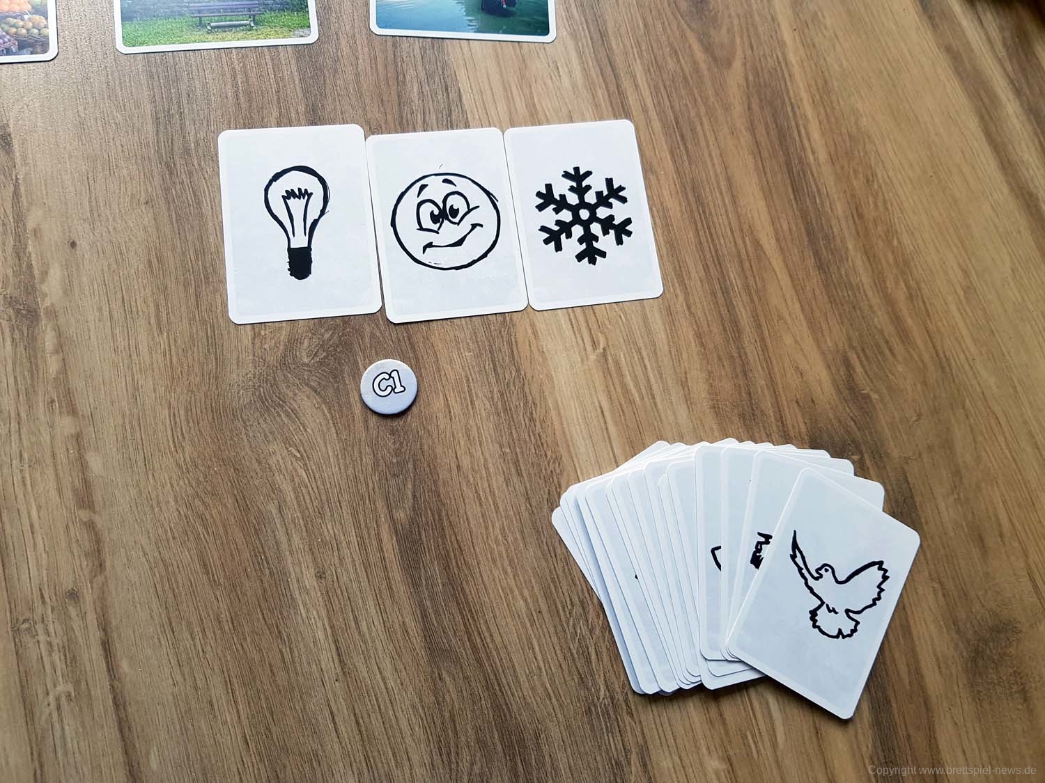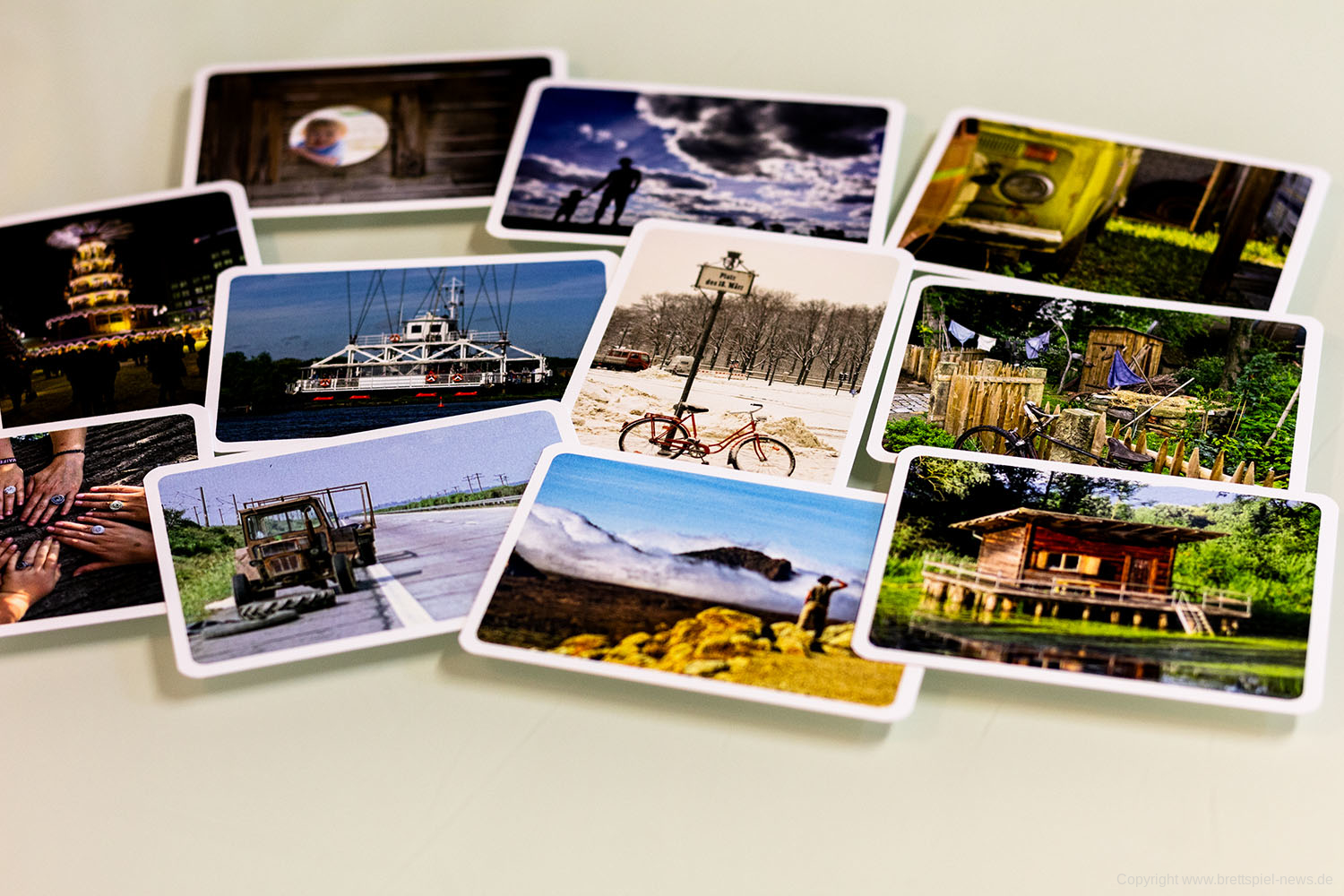 Dieses besteht zum Teil aus Holzteilen und polierten Steinen. Das alles hat eine ausgesprochen gute Haptik und kann sehr überraschen, denn solches Spielmaterial haben wir noch nie in einer Box gefunden. Ansonsten sind zahlreiche Karten mit bunten Motiven und einige Pappmarker enthalten. Einziger negativer Punkt bei der ersten Sichtung des Spielmaterials: die Box hätte auch kleiner ausgeliefert werden können.