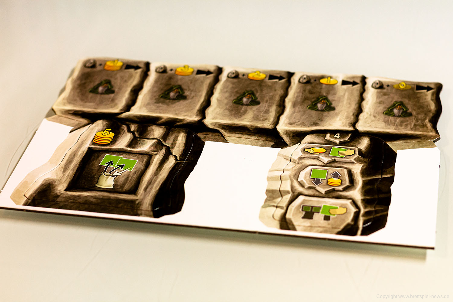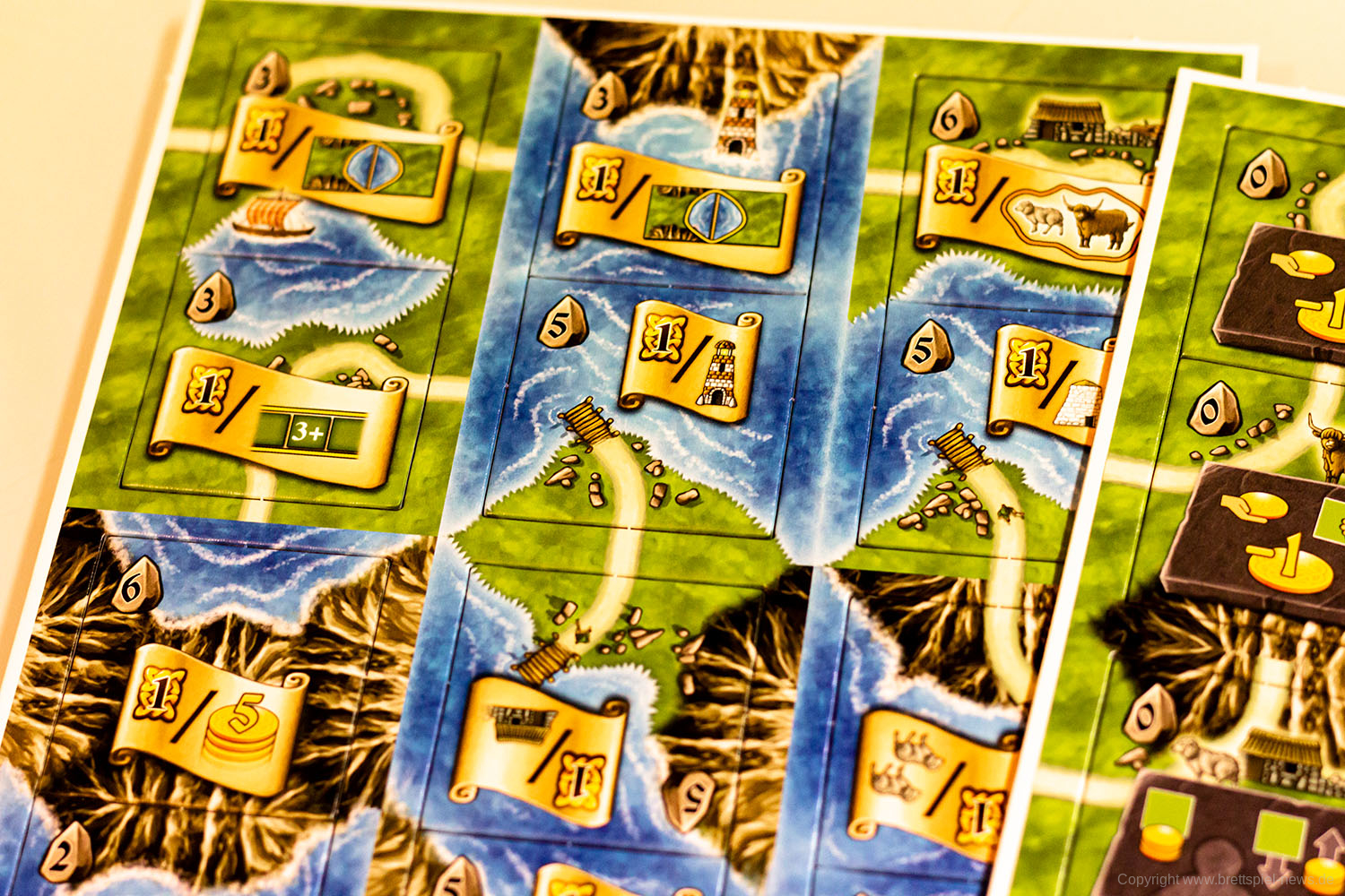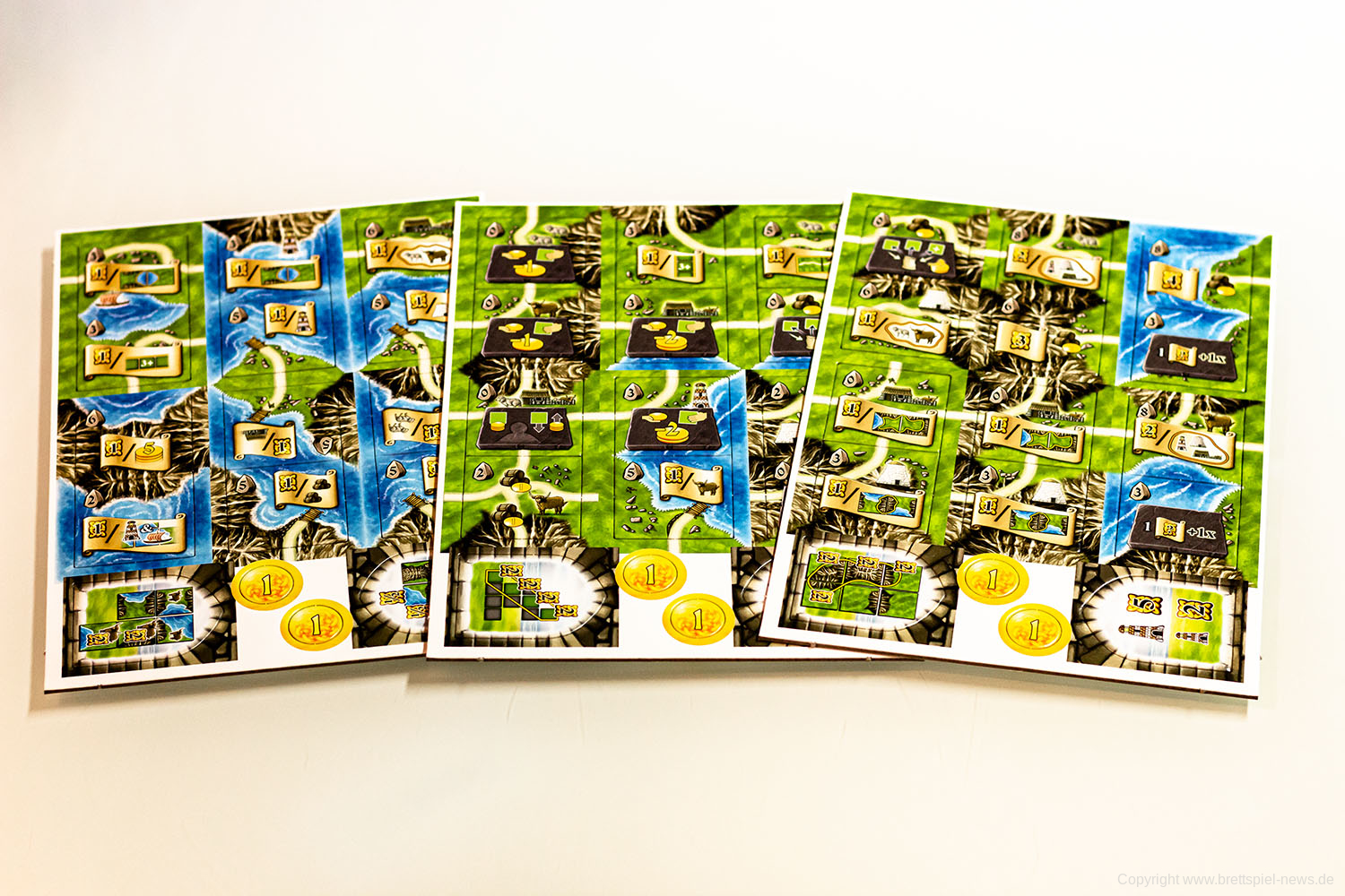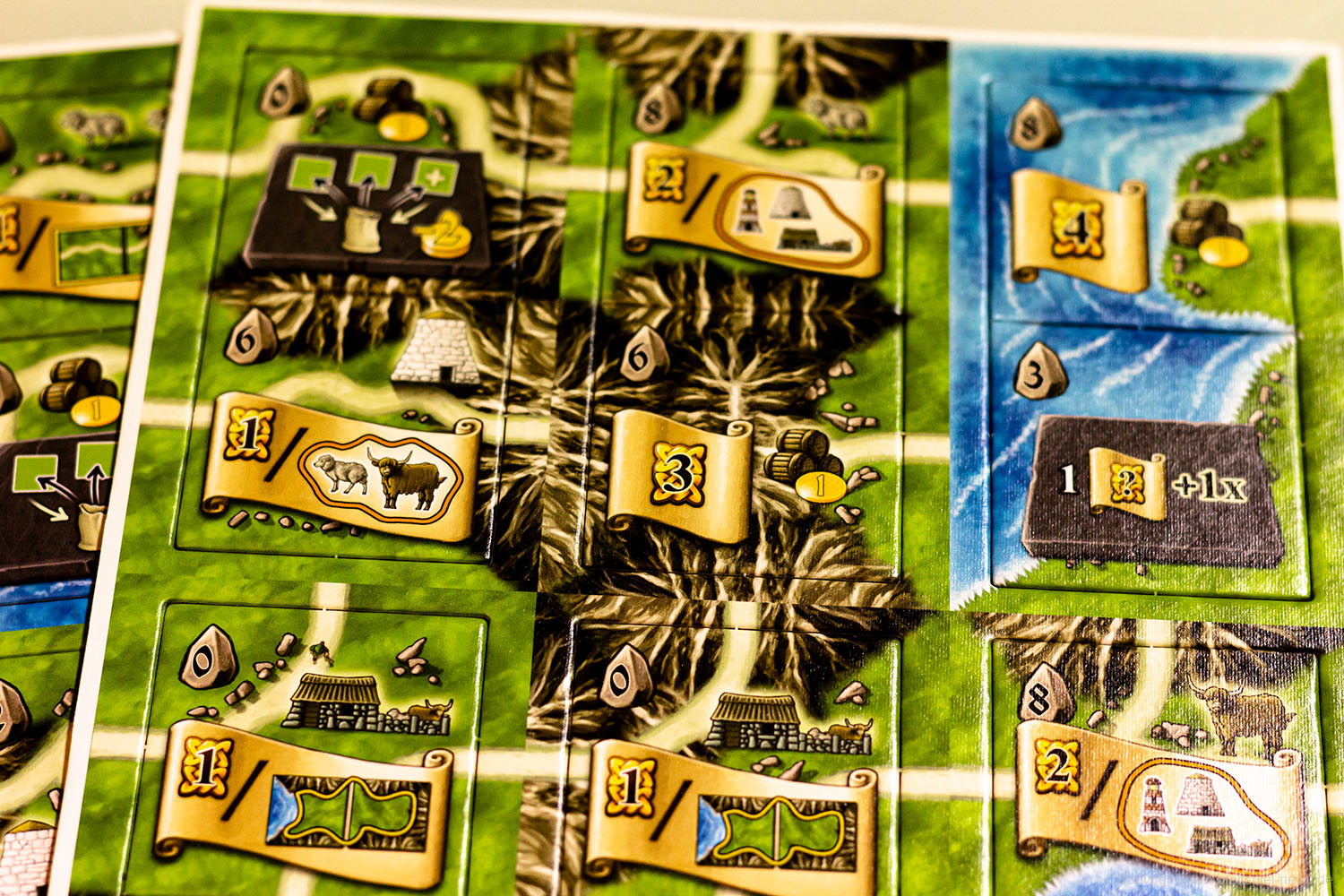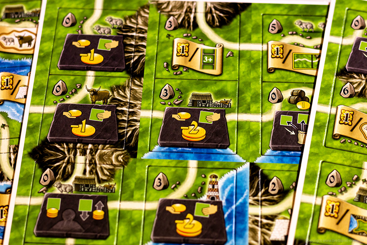 Die Druiden-Erweiterung ändert den gewohnten Spielablauf nur geringfügig, indem die Kaufphase (Phase 4) in zwei Kaufdurchgänge aufgeteilt wird. Im ersten Kaufdurchgang kauft ihr wie gewohnt ein Plättchen von euren Mitspielern. Im zweiten Kaufdurchgang könnt ihr ein Plättchen vom Dolmen-Spielplan kaufen. Diese so genannten Druidenplättchen sind ganz normale Landschaftsplättchen, die eine Steintafel oder Schriftrolle aufweisen können. Steintafeln verleihen euch Sondereffekte, die ihr bis Spielende einsetzen könnt. Für Schriftrollen gelten dieselben Regeln wie im Grundspiel.