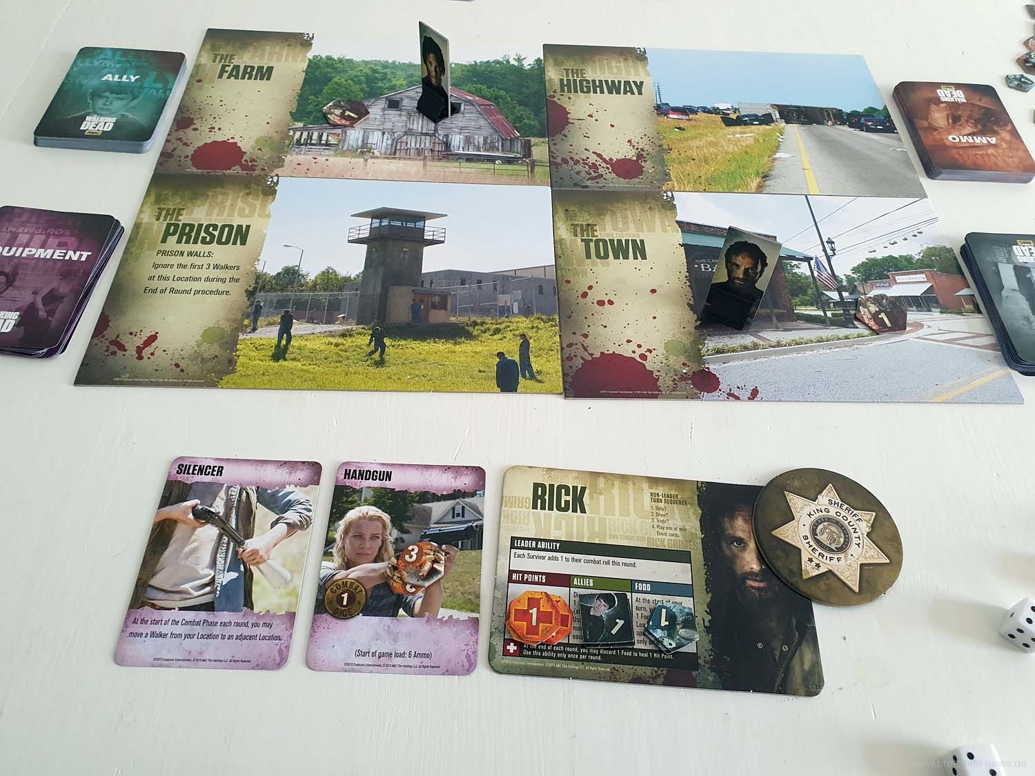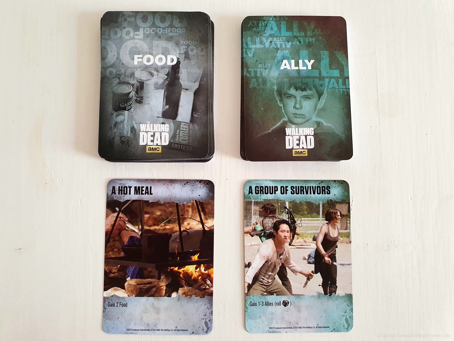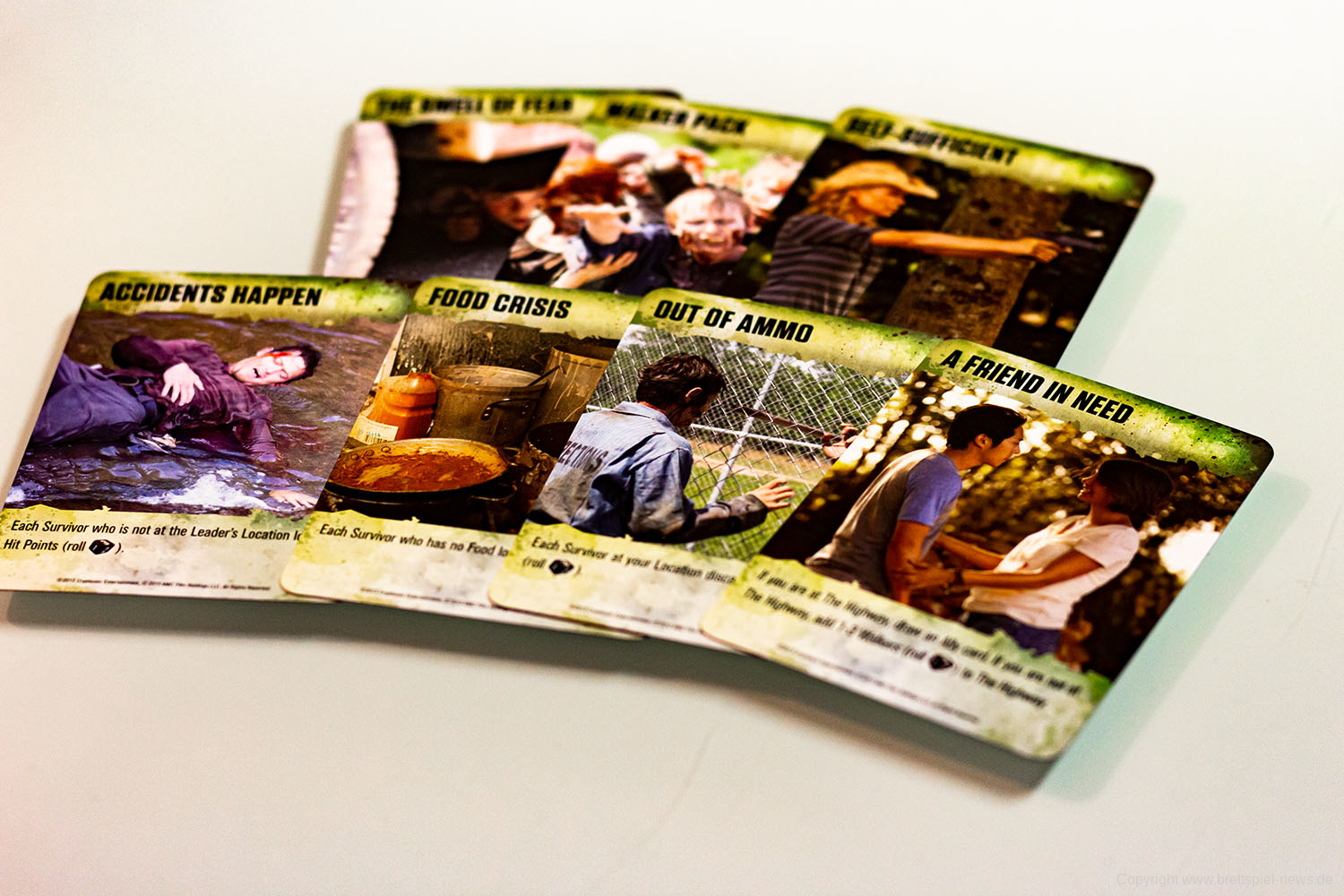 Wanderer und andere Notlagen werden an verschiedenen Orten durch ein 48-Karten-Ereignisdeck (jede Karte ist einzigartig!) ausgelöst, das die Spieler aus jeder Runde ziehen. Sie müssen dann herausfinden, wie sie die Auswirkungen dieser Ereignisse minimieren können, indem sie Würfel verwenden, um Kämpfe aufzulösen und den Ausgang einiger Ereignisse zu bestimmen. Die Überlebenden können zusammenarbeiten, um ihre Kampffähigkeiten zu kombinieren oder sich aufteilen, um ein größeres Gebiet abzudecken. Wenn die Survivors die Walker nicht von einem Ort vertreiben, verlieren sie Ressourcen - und wenn ein Ressourcendeck zu Ende geht, verlieren die Spieler das Spiel. Daher müssen die Spieler die Walker in Schach halten, ohne selbst zu viele Ressourcen zu verbrauchen.