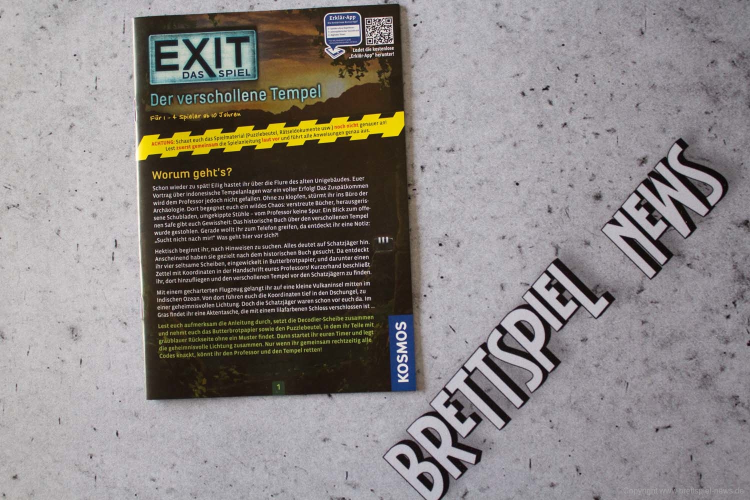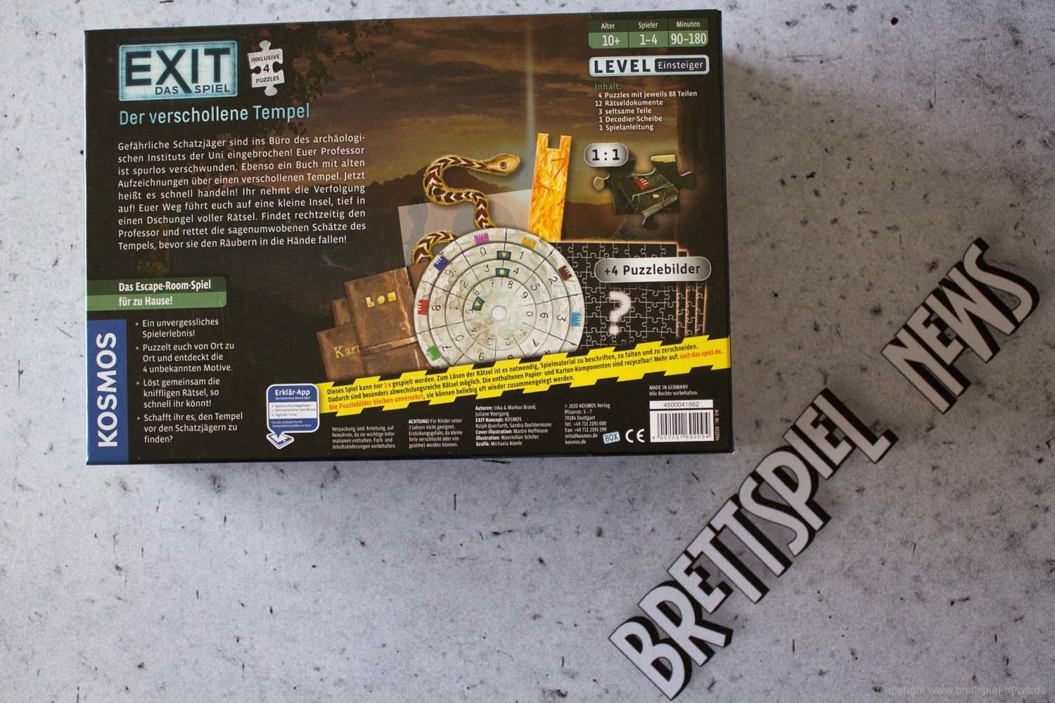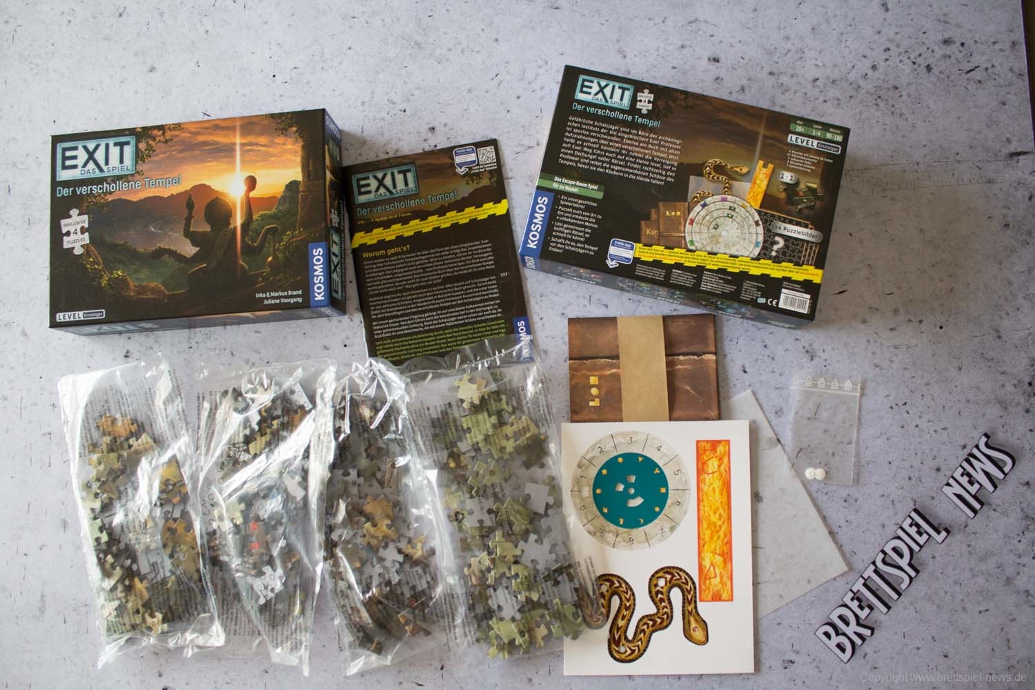 In der neuen Serie EXIT – DAS SPIEL + PUZZLE ist mit „Der verschollene Tempel“ einer der ersten beiden Teile erschienen und wir haben direkt Bilder vom Spielmaterial gemacht (Spoilerfrei). EXIT – Das Spiel Serie, die einen unglaublichen Erfolg in Deutschland hat. Beide neuen Teile stammen von Inka & Markus Brand, werden zusätzlich Puzzle als Spielmaterial enthalten und haben einen UVP von 19,99 €. Sie lassen sich allein, aber auch mit bis zu vier Mitspielern spielen und werden eine Spielzeit von rund zwei Stunden bieten.