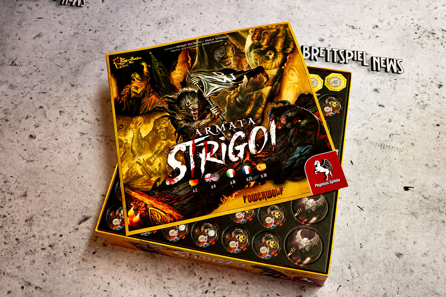 Bei Pegasus Spiele ist die Neuheit Armata Strigoi - Das Powerwolf Brettspiel erschienen. Wir haben ein Exemplar gekauft und zeigen erste Bilder vom Spiel. Das Spiel richtet sich rein thematisch an ältere Spieler ab 14 Jahre und befasst sich mit dem Kampf zwischen Vampiren und Werwölfen. Das Spiel stammt von den Autoren-Duo Paolo Vallerga & Marco Valtriani und wurde von Alan D'Amico & Zsofia Dankova illustriert.