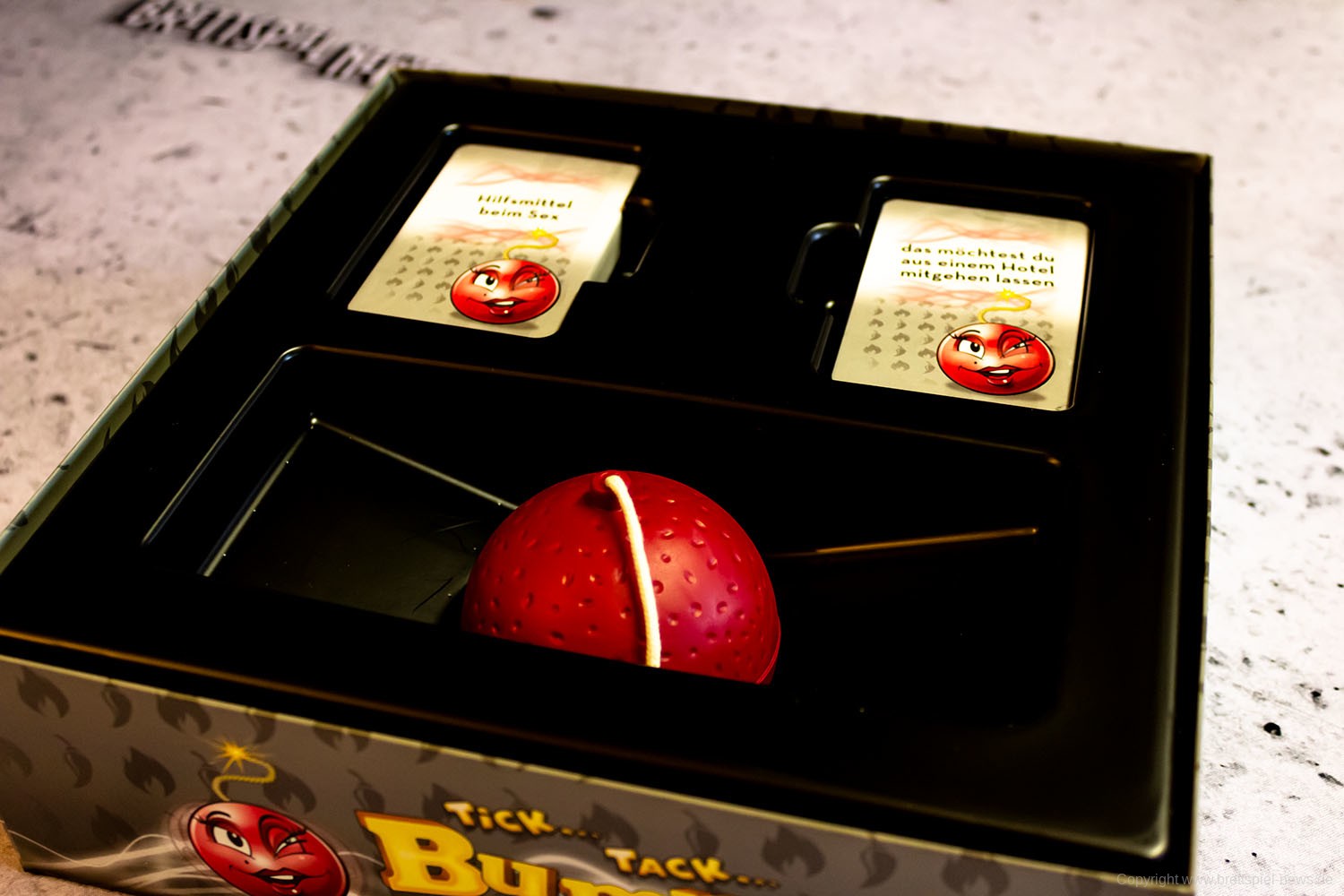 Auch die in kräftigem Beerenrot gehaltene Bombe, die bekanntermaßen durch Explosion das Rundenende einläutet, hält eine weitere Überraschung bereit: Sie vibriert ganz zufällig und bringt die Mitspieler damit einmal mehr ins Schwitzen.