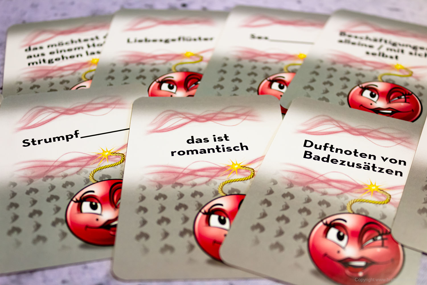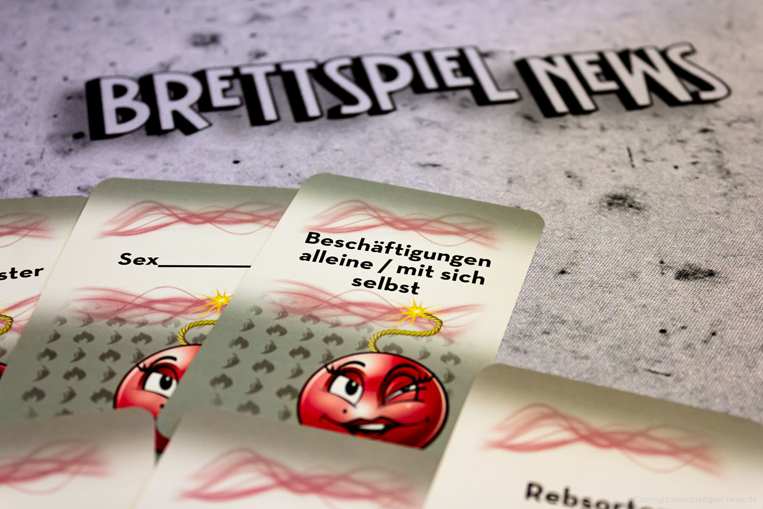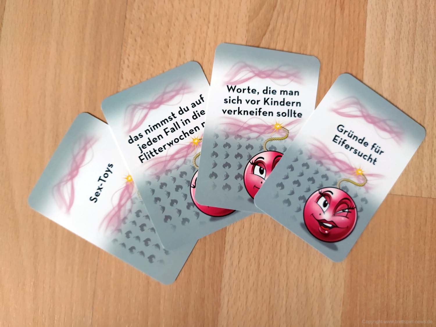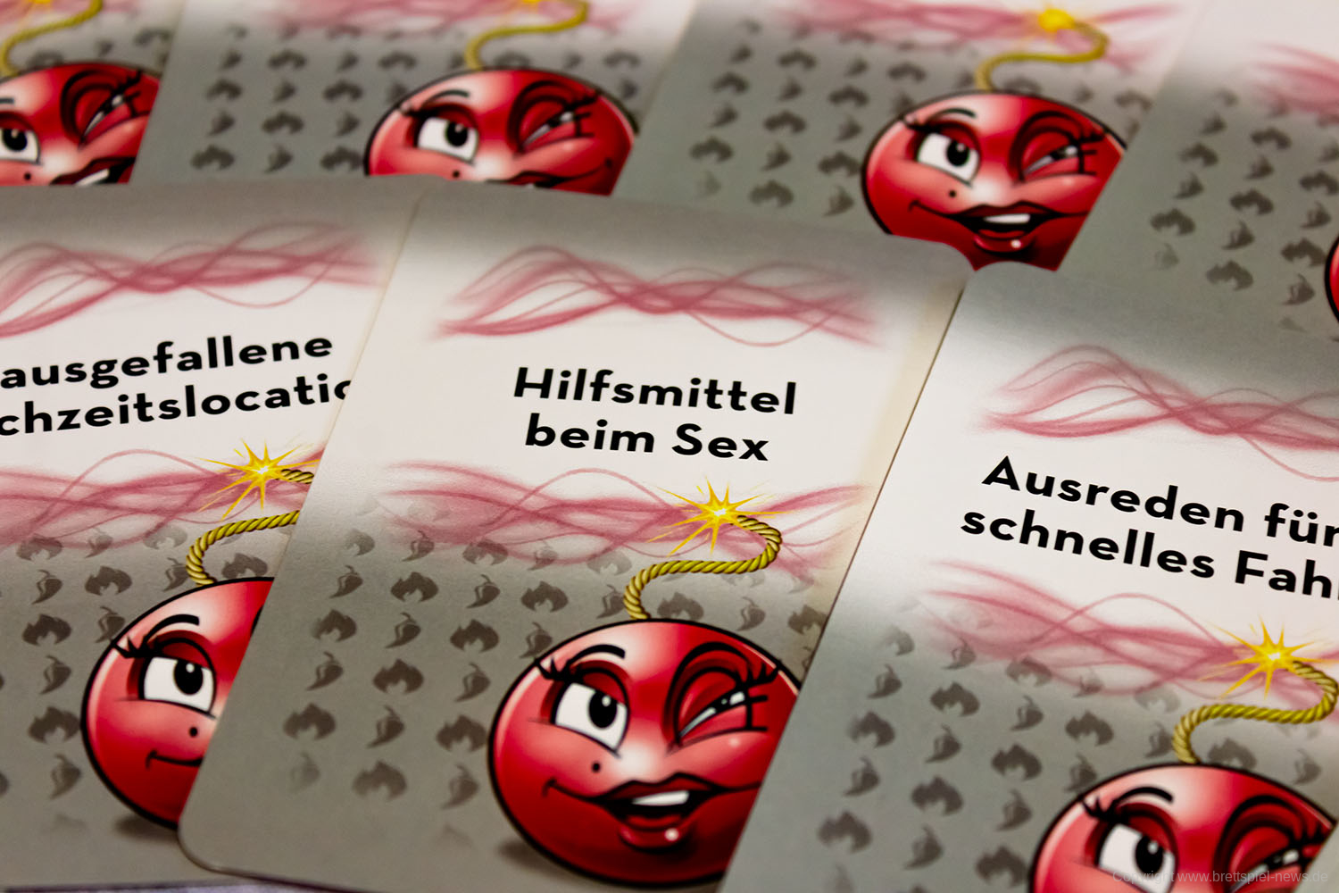 Der Startspieler schnappt sich die scharfe Bombe und deckt eine von 220 Kategorien. Jetzt heißt es schnell passende Wörter finden, beispielsweise zu „Anmachsprüchen", „(un)möglichen Pornotiteln", „Ausreden für „heute nicht, Schatz"", „das hängt" oder „das ist nicht gesellschaftsfähig".